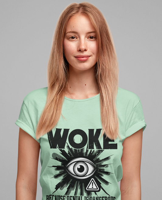 WOKE Because Denial Is Dangerous | Black Eye & Caution Symbol Graphic T-Shirt