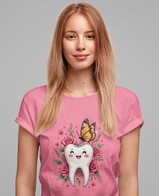 Smile T Shirt Featuring Large Smiling Tooth Surrounded by Flowers Leaves and Butterflies