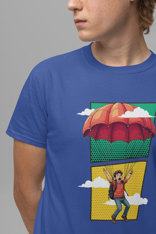 Do it Scared Boy Parachuting Mid-Air with Clouds Background Graphic T-Shirt