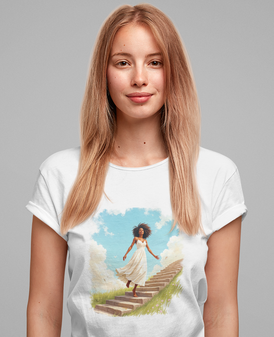 Graceful Woman in White Dress Walking on Stairs – Blue Sky & Green Ground Graphic T-Shirt