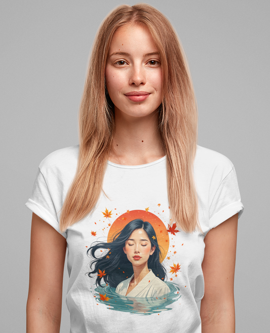 Serene Woman in White Dress Chest-Deep in Water with Sunset and Falling Leaves Graphic T-Shirt