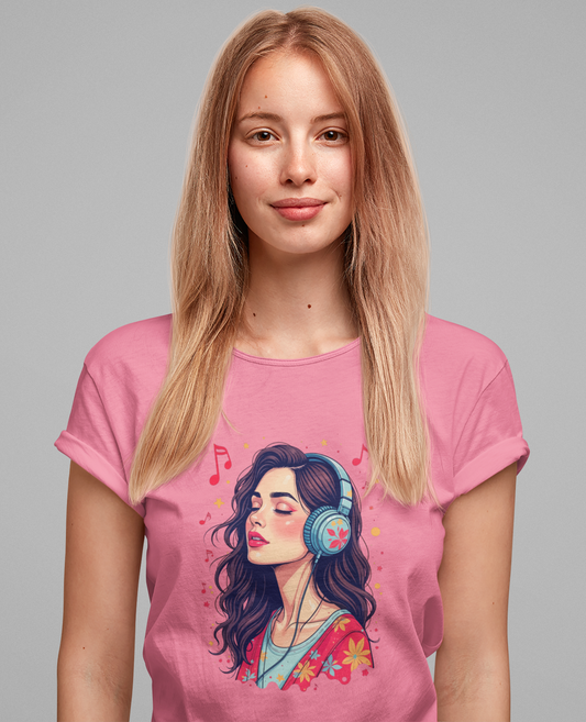 Quietly Loud – Woman with Headphones, Leaf Pattern Dress & Expressive Music Notes Graphic T-Shirt