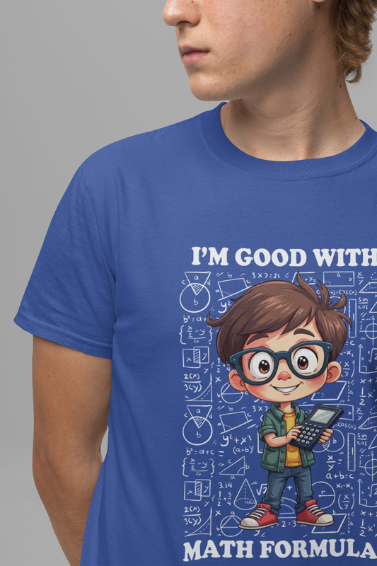 I'm Good with Math Formulas Tshirt – Happy Boy with Calculator and Math Diagrams