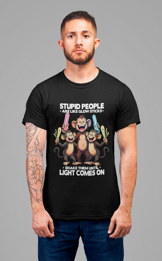Stupid People Are Like Glow Sticks Tshirt – Three Happy Monkeys Shaking Glow Sticks
