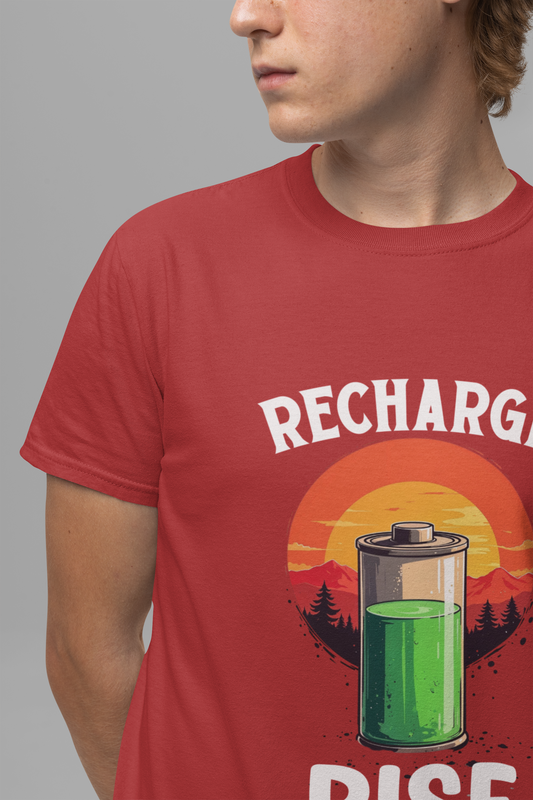 Recharge and Rise T-Shirt – Motivational Battery and Sunrise Graphic Tee