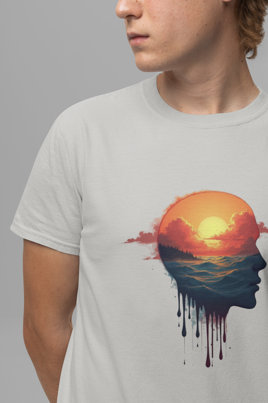 Melting Human Face with Colorful Sunrise and Clouds Beach View Graphic T-Shirt