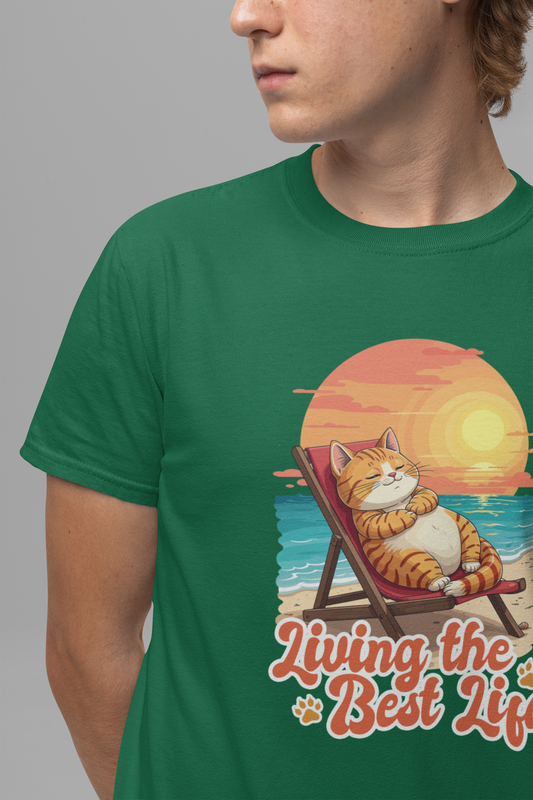 Lazy Life- Living the Best Life – Fat Cat Reclining Chair Beach Sunset Graphic T-Shirt