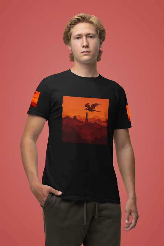 Dragon Sunset T-Shirt – Silhouette Flying Dragon Mountain Landscape Fantasy Graphic Tee