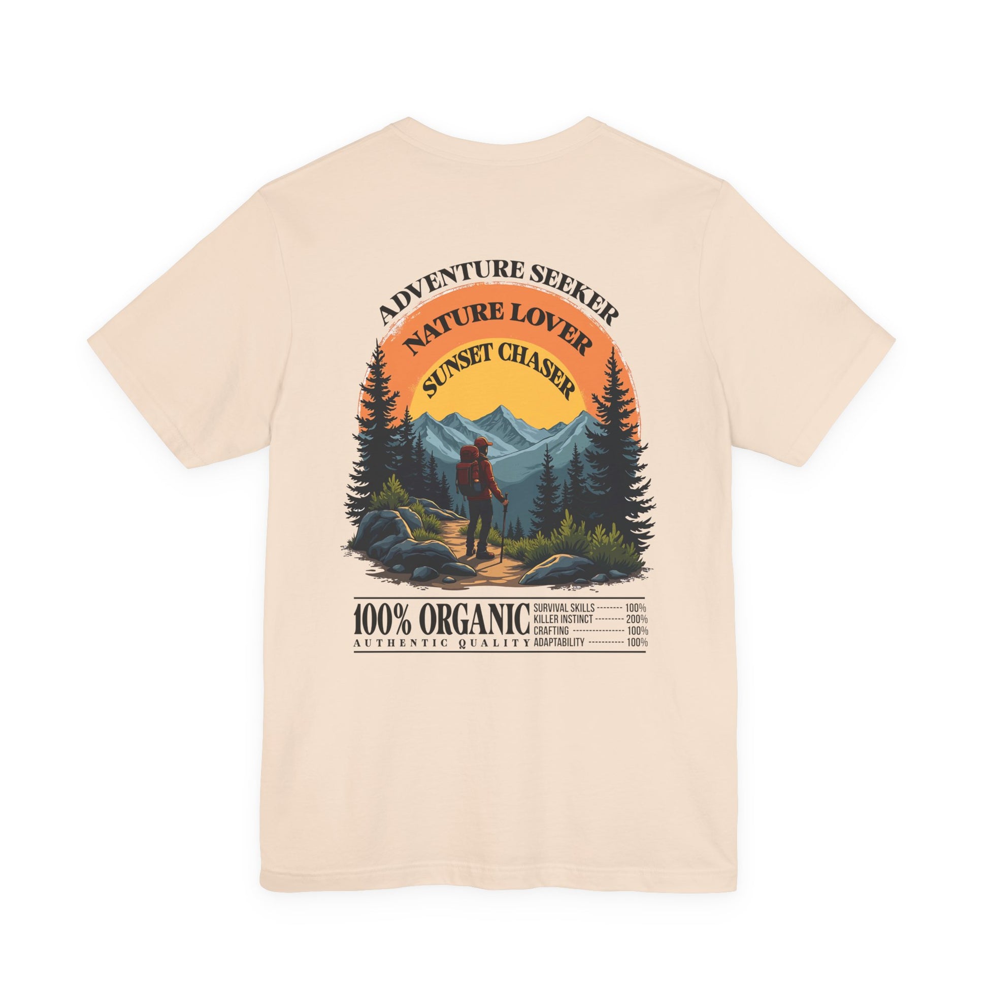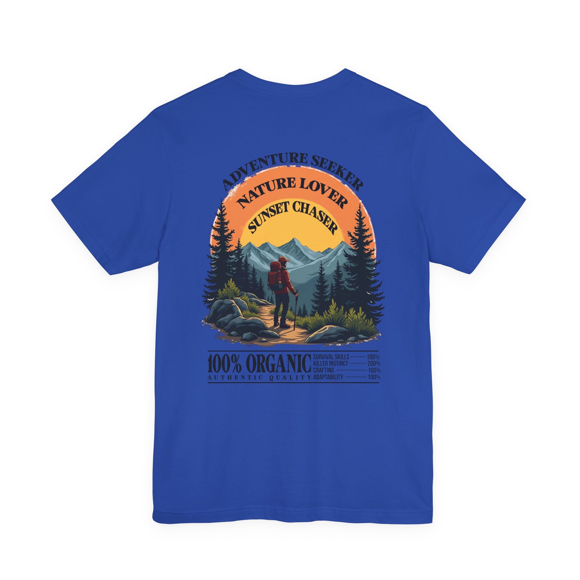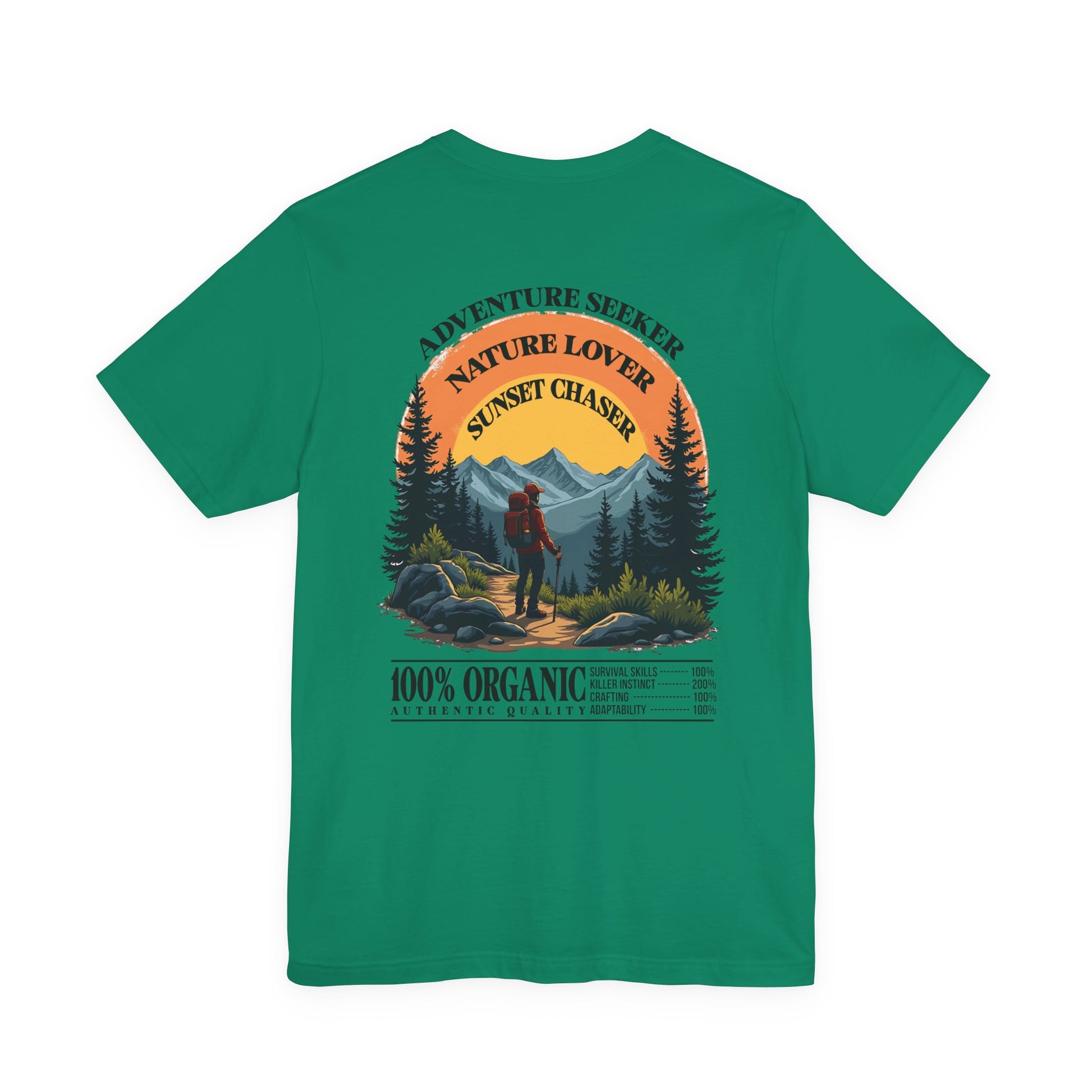 Embrace the thrill of exploration with this inspiring tshirt featuring a man in hiking gear standing boldly at the edge of rugged rocks, gazing at majestic mountains stretching into the distance. Topped with the motivating text “Adventure Seeker, Nature Lover, Sunset Chaser,” this design is perfect for hikers, outdoor enthusiasts, and anyone who loves the wild call of the mountains.