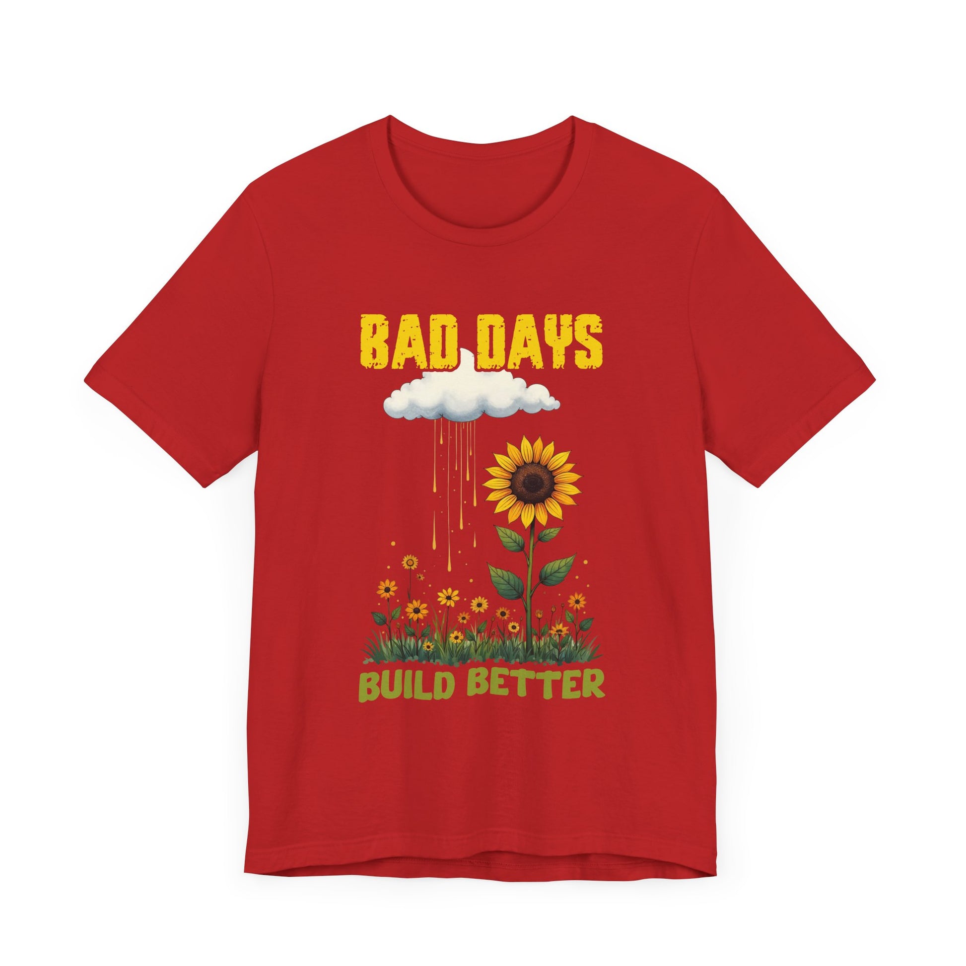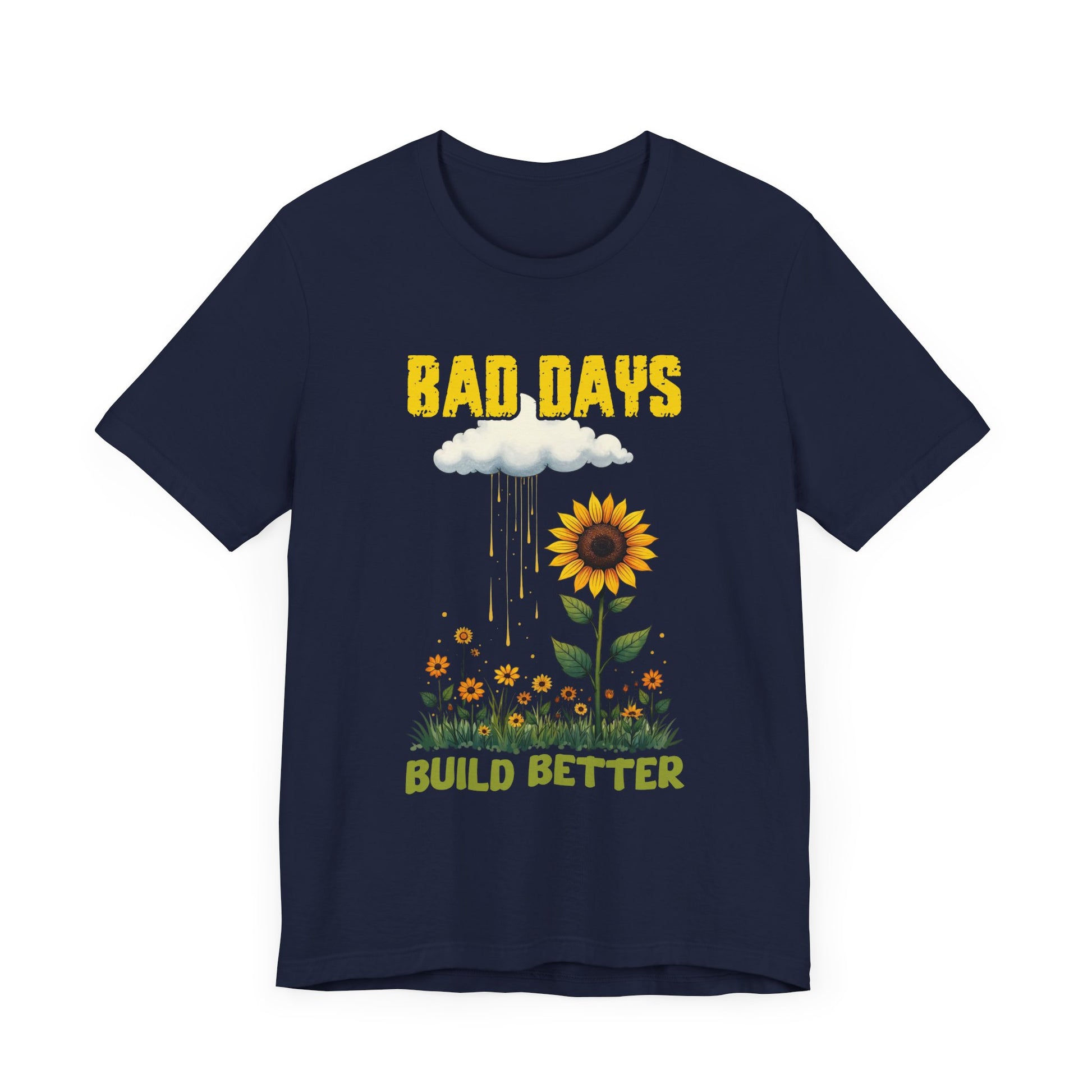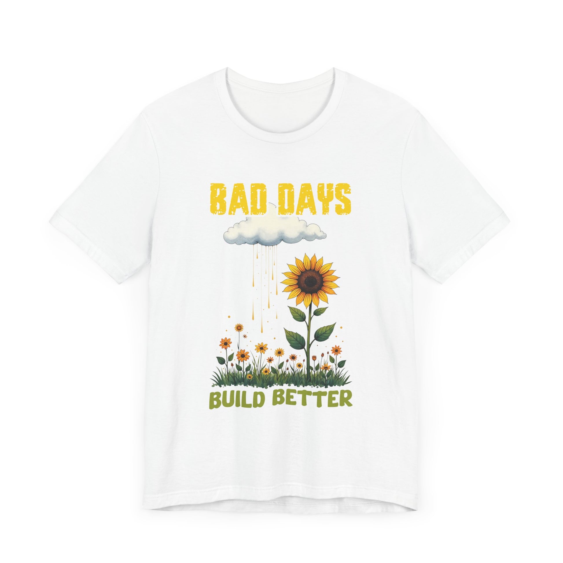 Turn tough times into growth with our "Bad Days Build Better" sunflower t-shirt. This inspiring design features a bold yellow "BAD DAYS" above a rain cloud, watering a vibrant sunflower and field of blooms, symbolizing how challenges help us grow stronger.