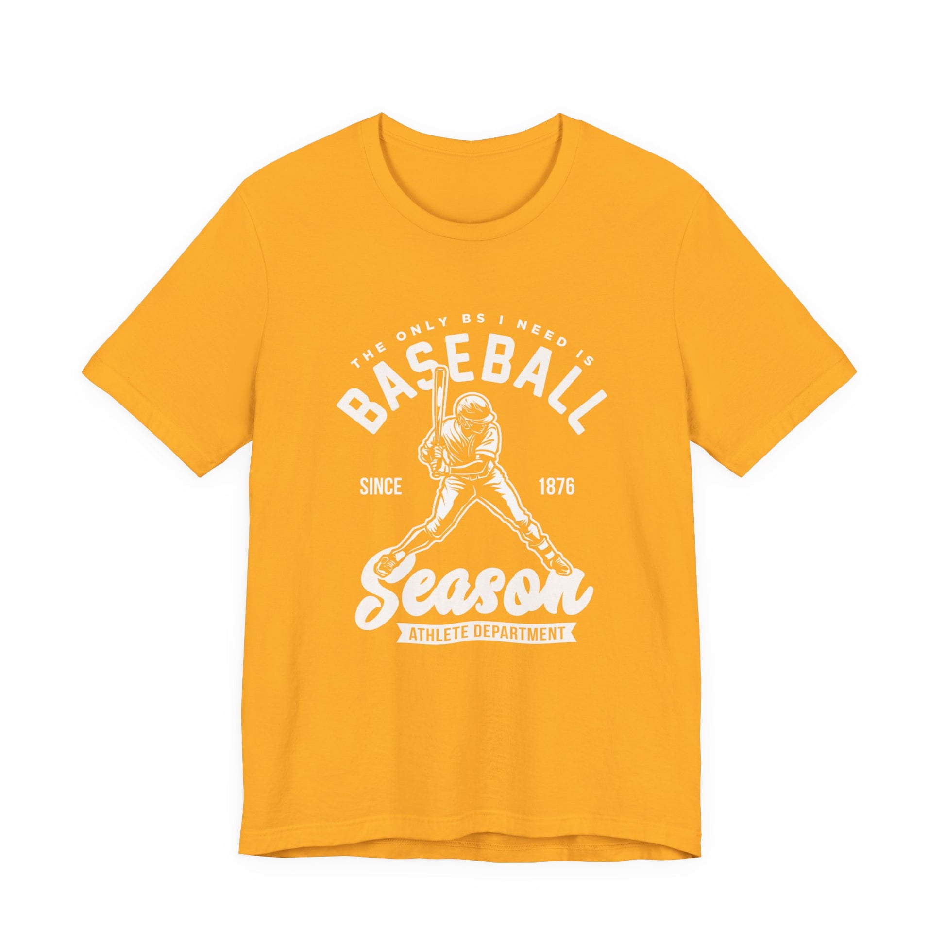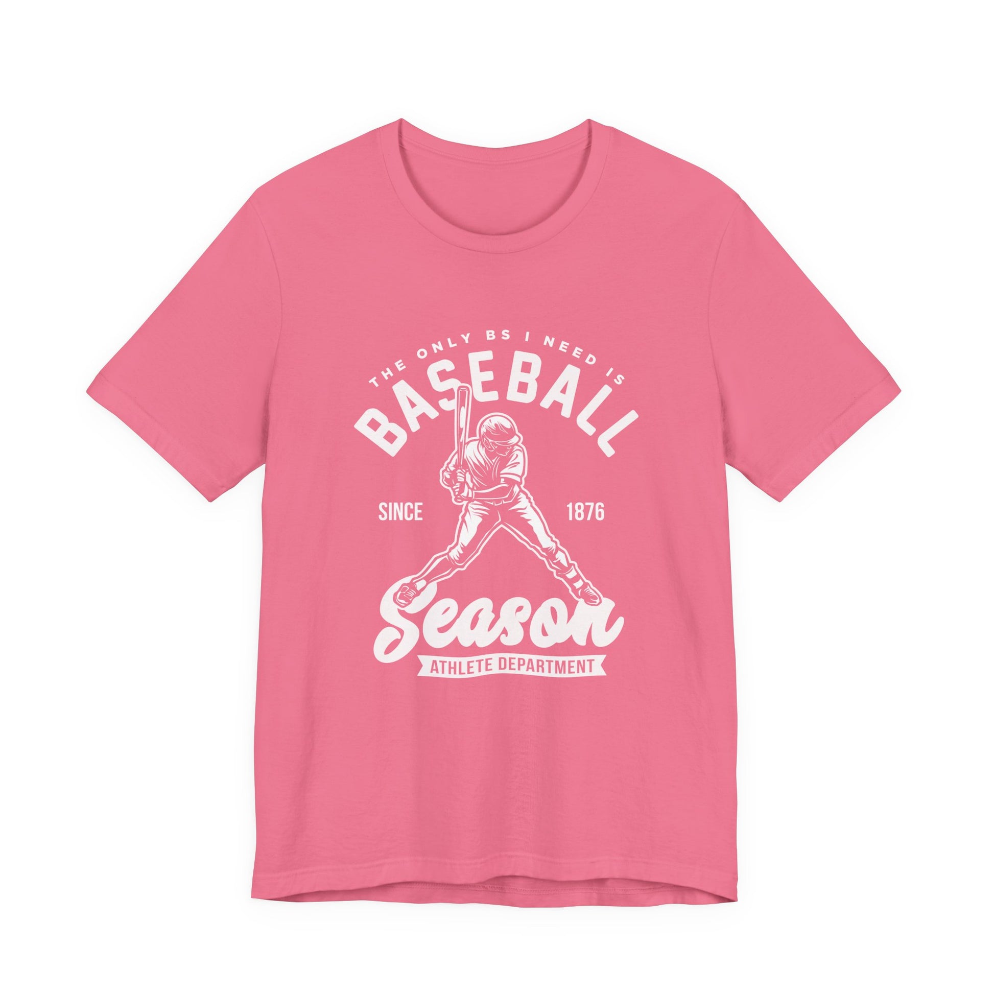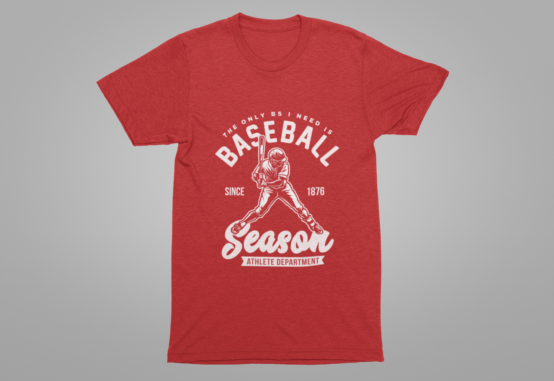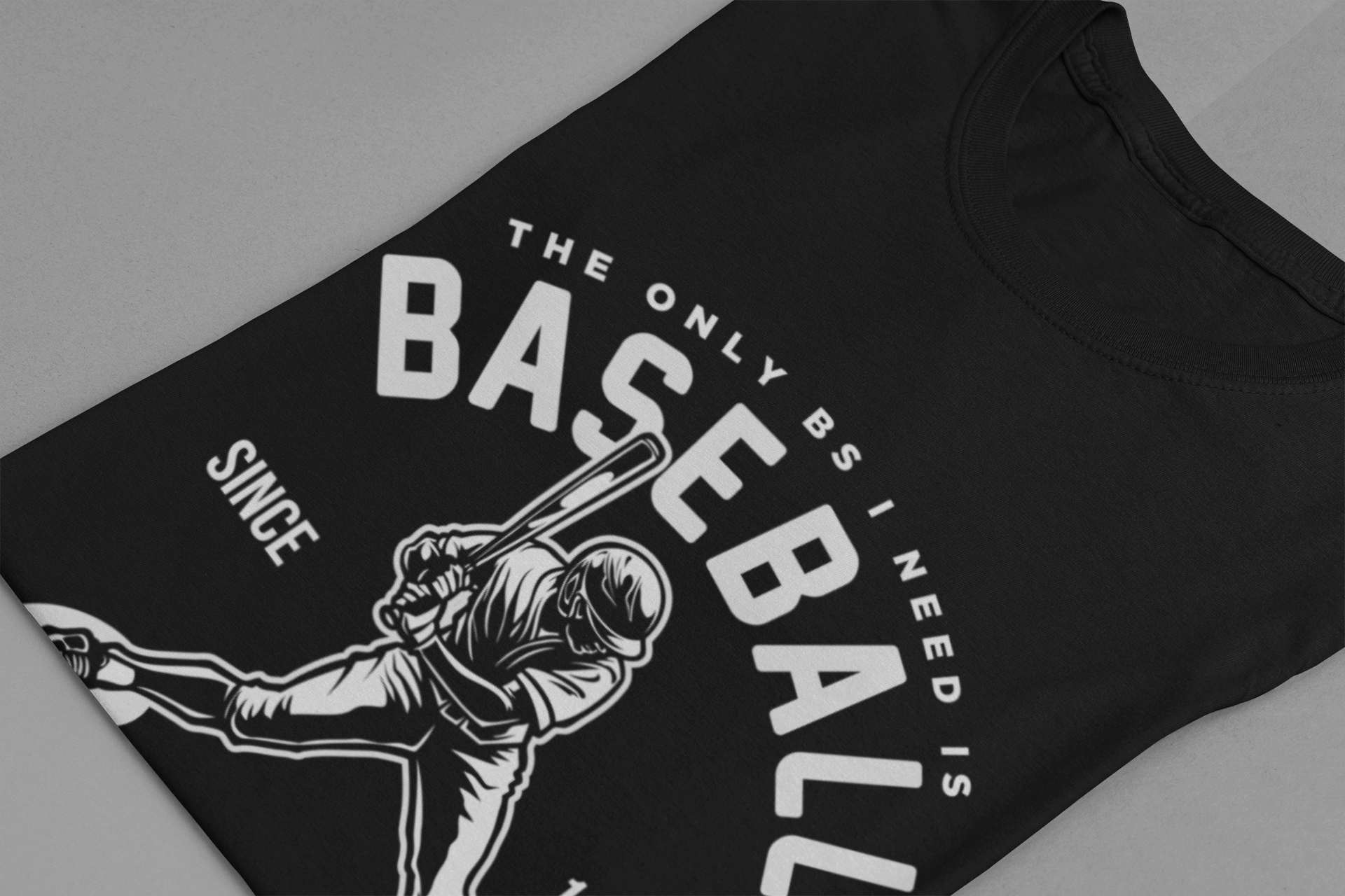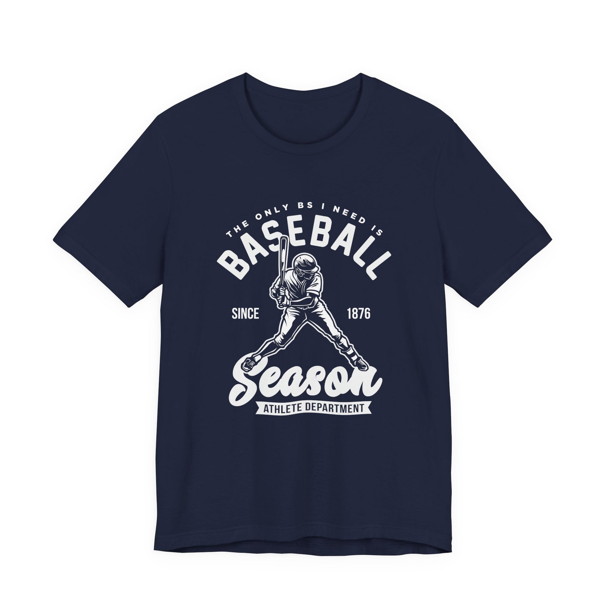 Celebrate your passion for the game with this bold tshirt featuring a large graphic of a baseball player holding a bat in the center. The prominent text "Baseball Season" captures the essence of the sport, while the witty phrase "The only BS I need is Baseball" adds humor and personality, perfect for fans who live for the diamond. This design combines athletic spirit with a clever play on words, making it ideal for casual wear, game days, or as a gift for baseball lovers. Crafted from soft, comfortable fabric, this tshirt is a standout piece for anyone dedicated to the sport and its culture.
