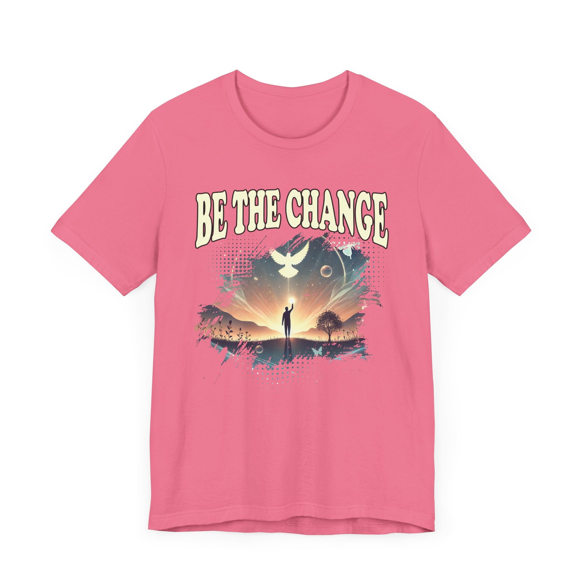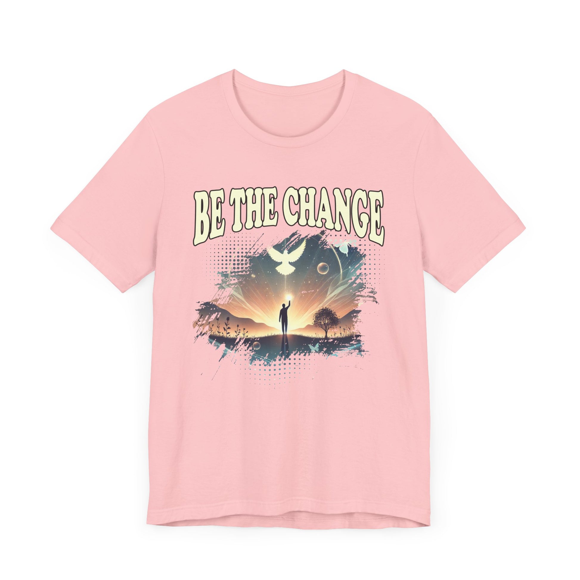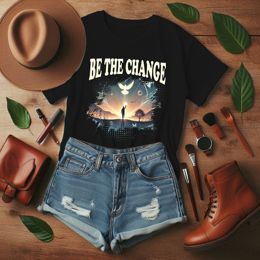 Inspire transformation and hope with this "Be the Change" t-shirt featuring a silhouette of a man walking toward a vibrant sunset, arms raised in triumph, with a white pigeon flying just above him. The imagery symbolizes peace, freedom, and the power of individual action to create a better world. Perfect for advocates, dreamers, and anyone committed to making a positive impact. Crafted from soft, comfortable fabric, this tee blends meaningful symbolism with stylish design, ideal for everyday wear or as a motivational gift.