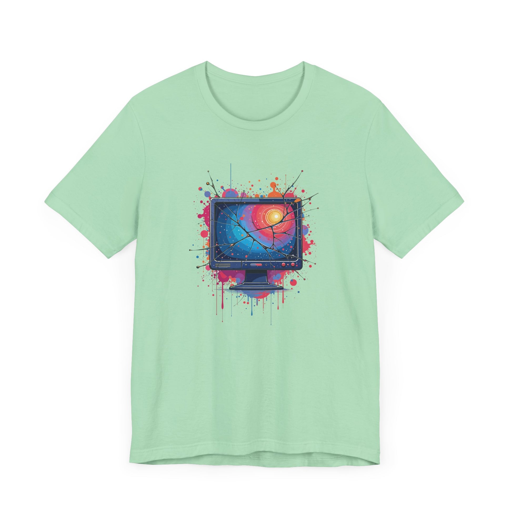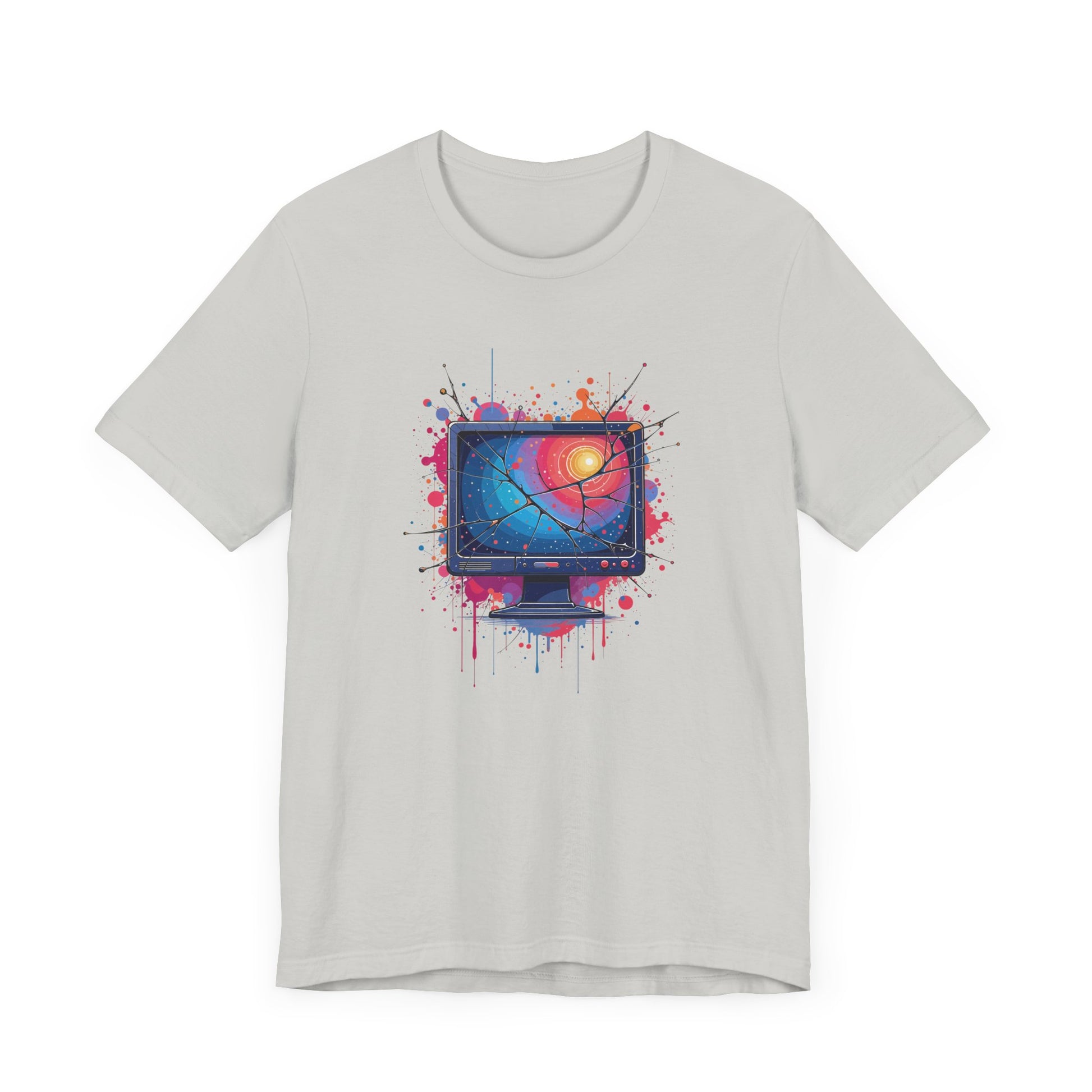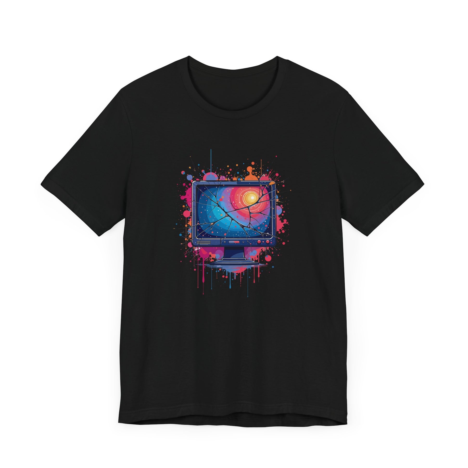 Show off your tech-inspired style with this bold t-shirt featuring a broken system monitor, its cracked screen bleeding outwards in dramatic fashion. The monitor’s display glows with a striking color gradient, while the background bursts with multiple colorful splashes, creating a vivid and chaotic digital vibe. Perfect for tech enthusiasts, gamers, and anyone who appreciates glitch art or computer humor, this design captures the energy of a system gone wild. Crafted from soft, high-quality fabric for comfort and standout appeal.