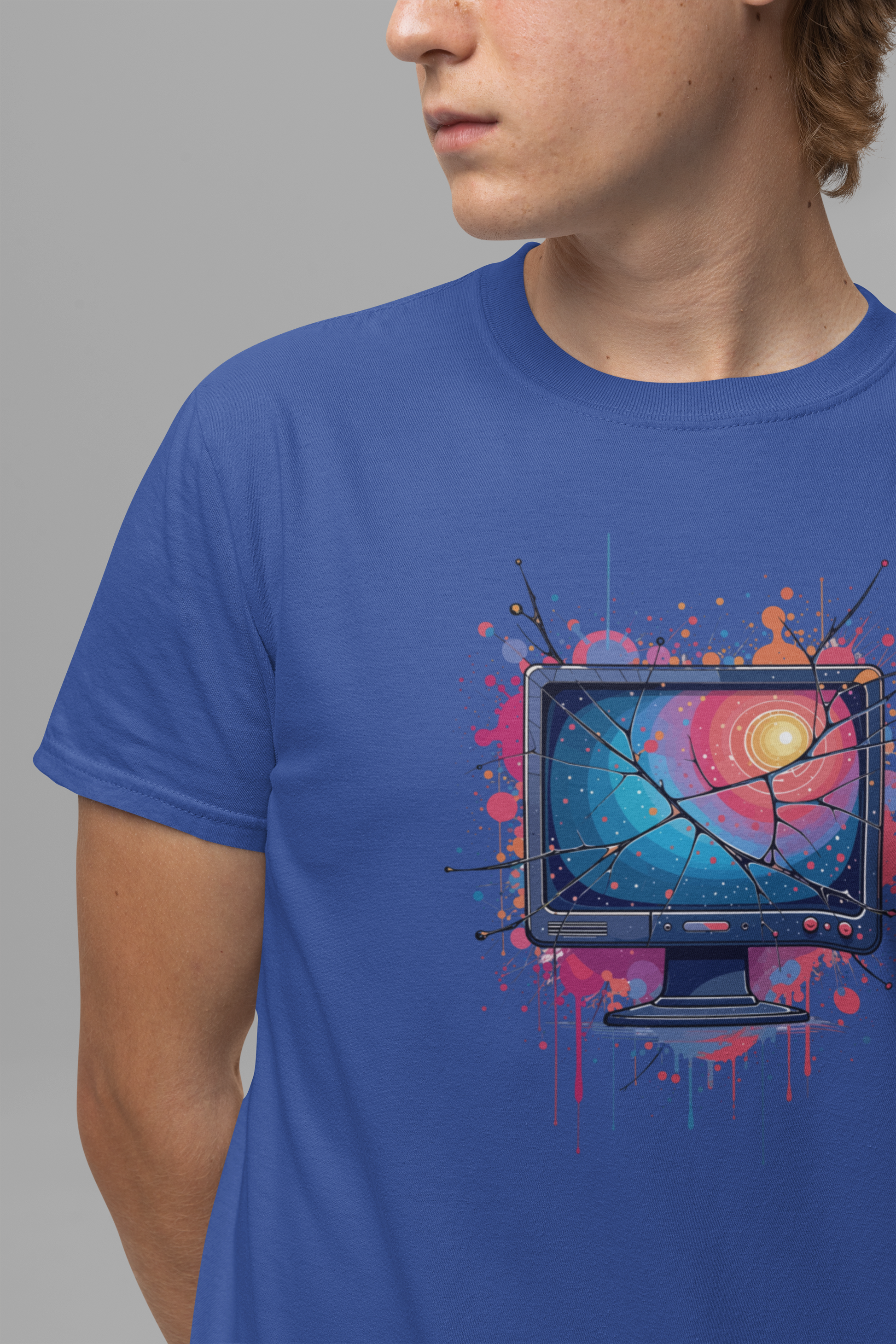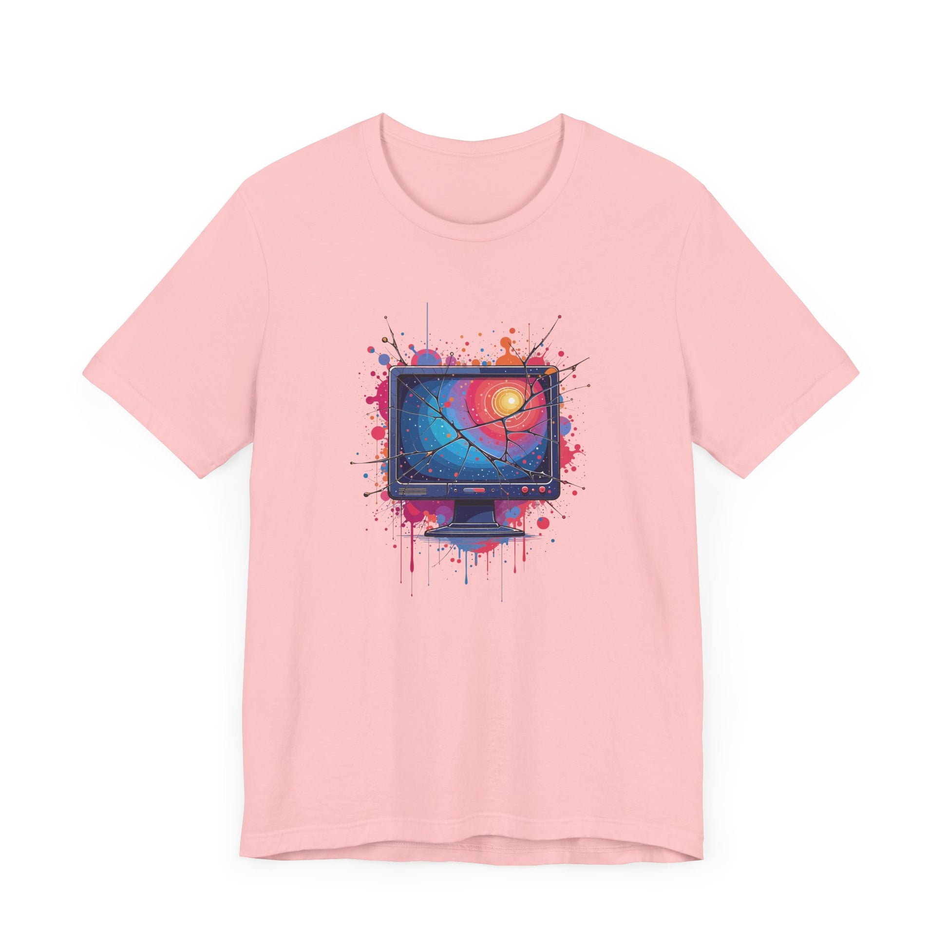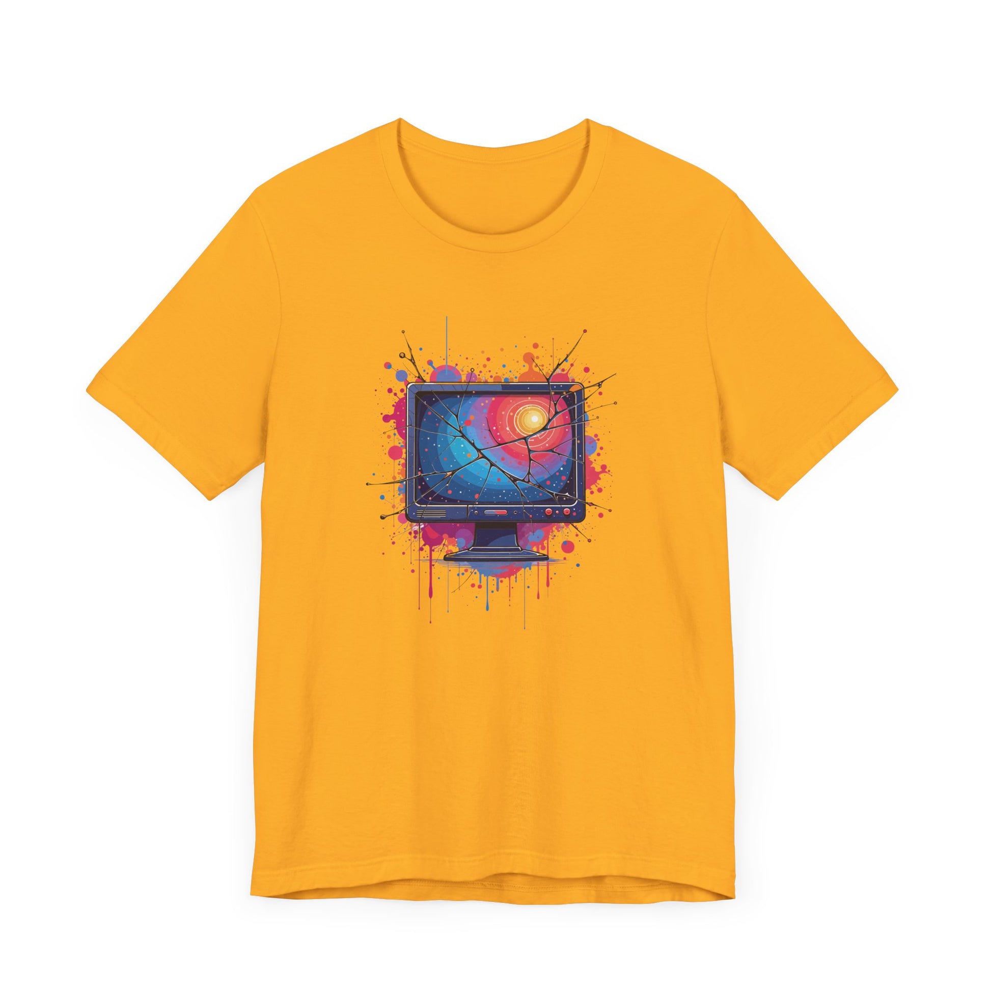 Show off your tech-inspired style with this bold t-shirt featuring a broken system monitor, its cracked screen bleeding outwards in dramatic fashion. The monitor’s display glows with a striking color gradient, while the background bursts with multiple colorful splashes, creating a vivid and chaotic digital vibe. Perfect for tech enthusiasts, gamers, and anyone who appreciates glitch art or computer humor, this design captures the energy of a system gone wild. Crafted from soft, high-quality fabric for comfort and standout appeal.