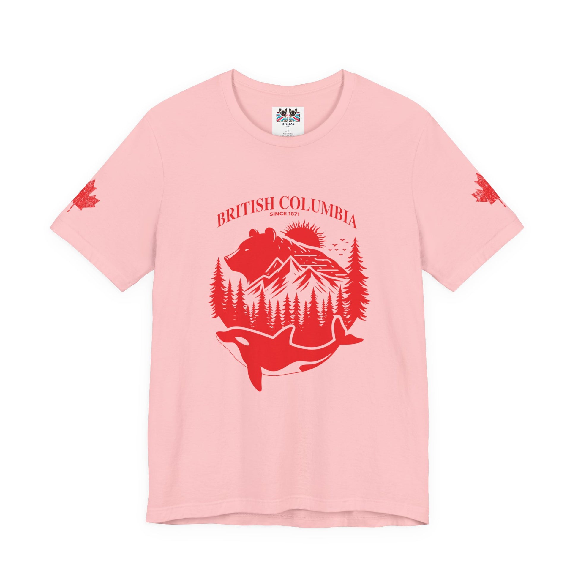 Showcase the spirit of British Columbia with this striking white t-shirt featuring a bold red graphic. The design highlights iconic BC wildlife and scenery—a majestic bear, snow-capped mountains, lush pine forests, and a leaping orca whale—all arranged within a circular emblem. “BRITISH COLUMBIA Since 1871” arches above, while maple leaf accents on both sleeves add national flair. This tee celebrates the province’s rich heritage and natural beauty, making it a perfect choice for locals, travelers, or anyone passionate about Canada’s west coast.