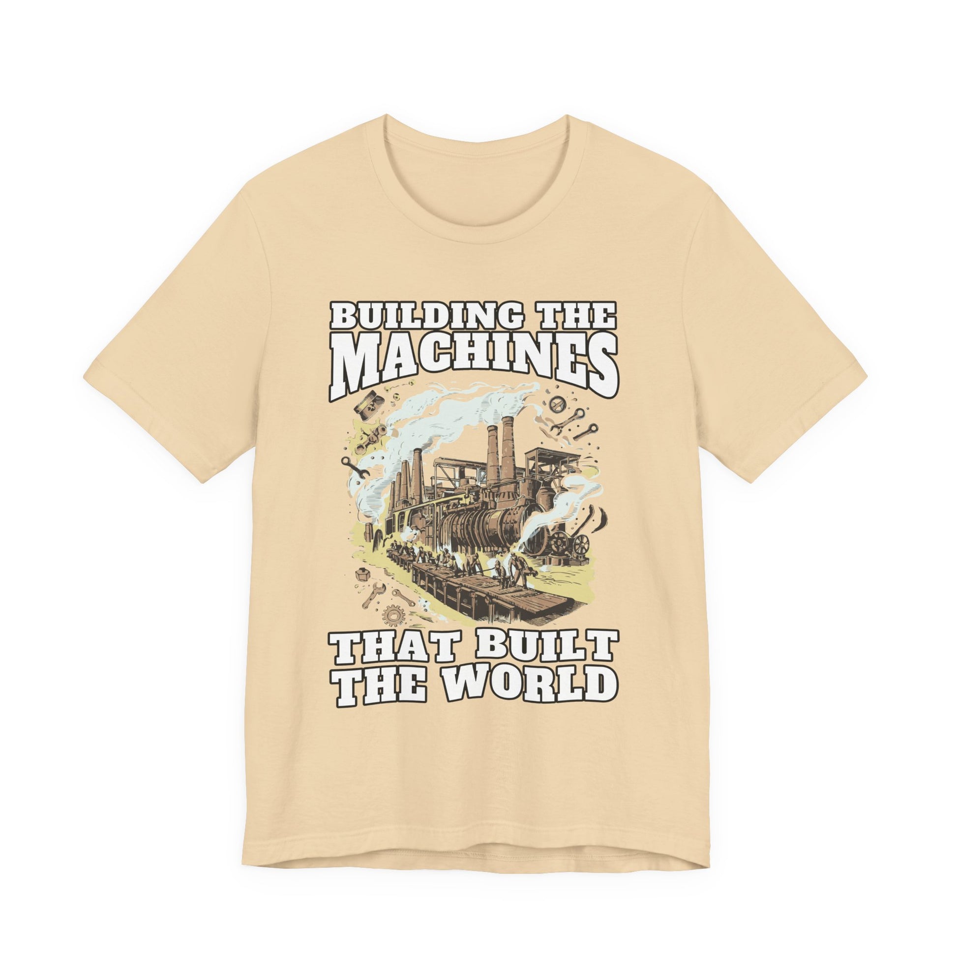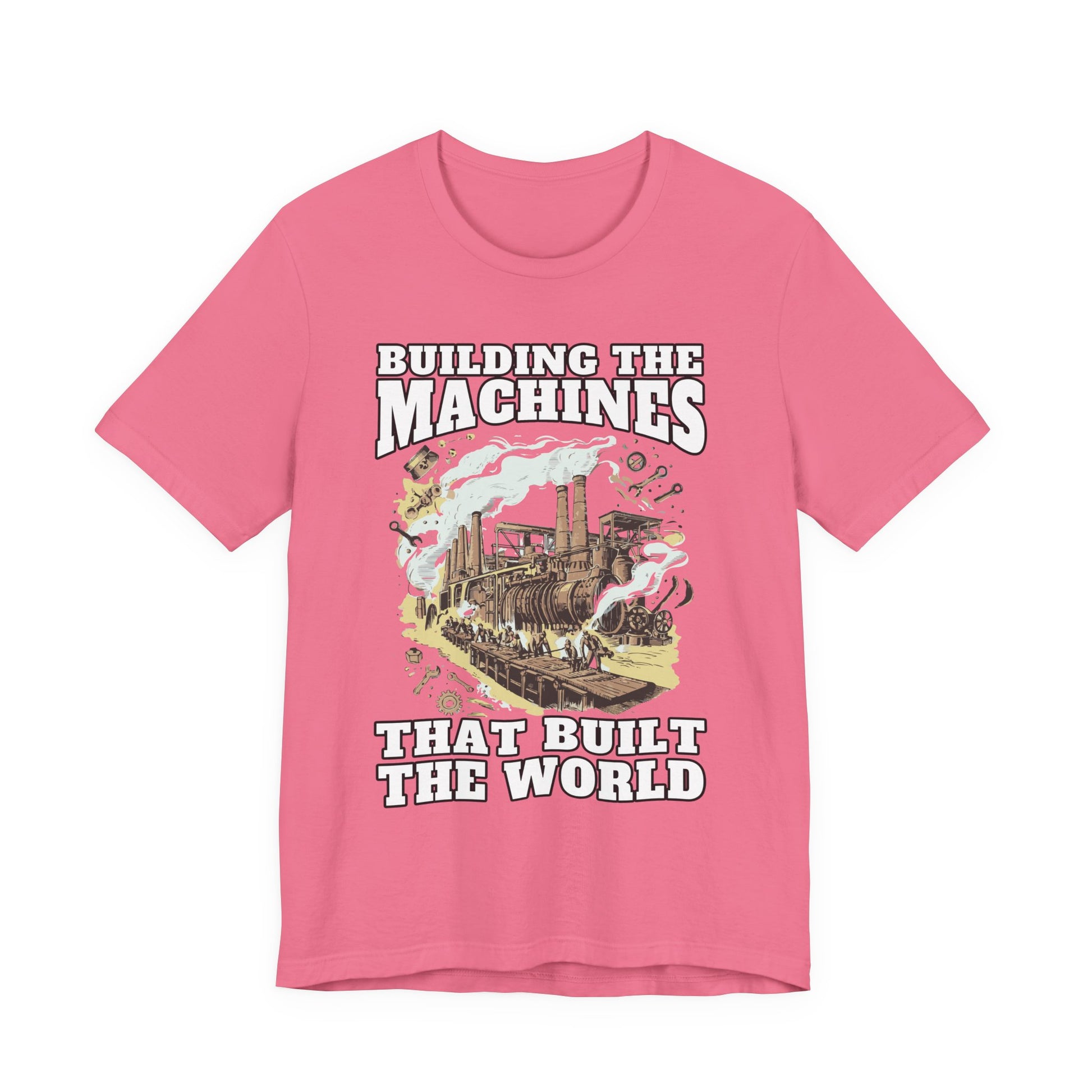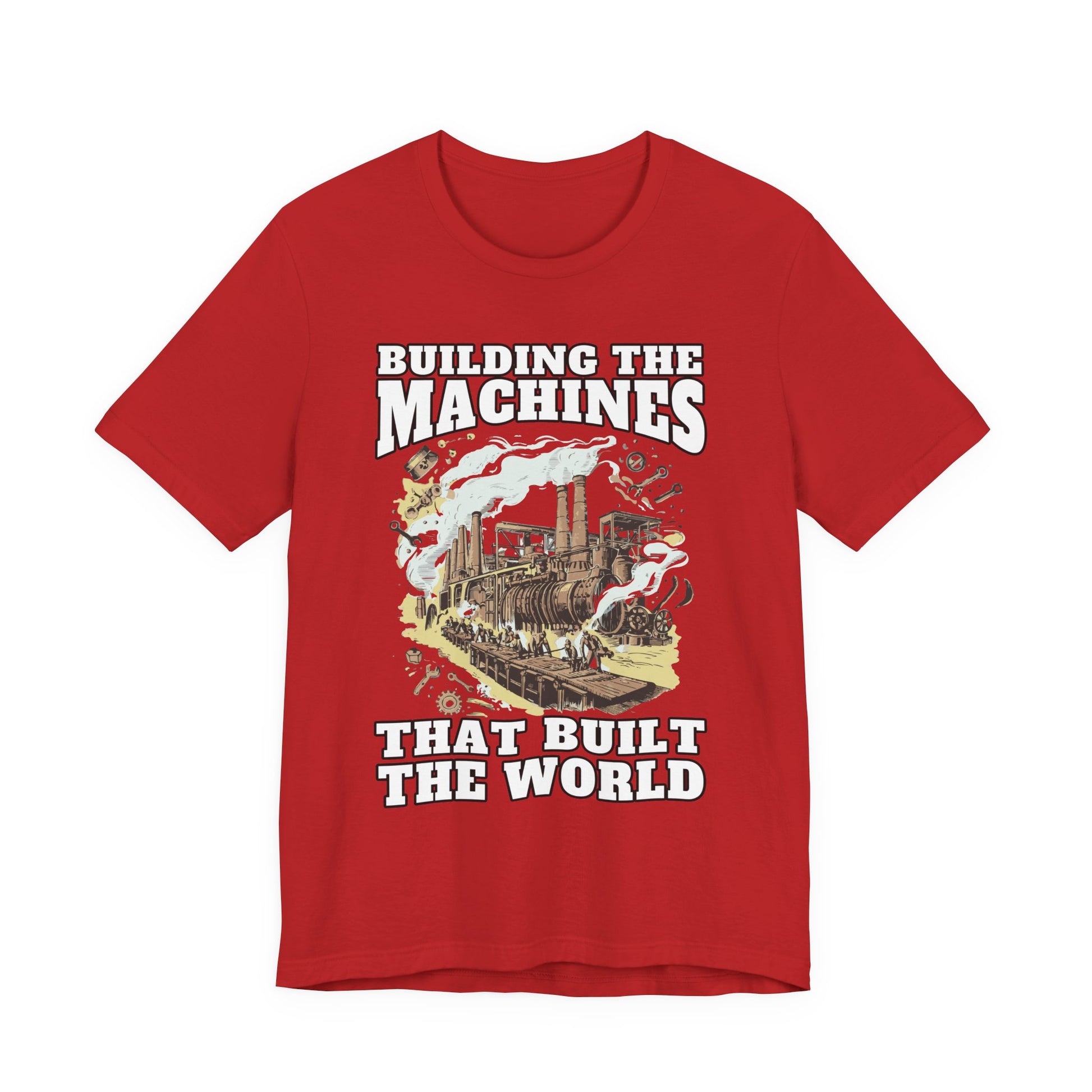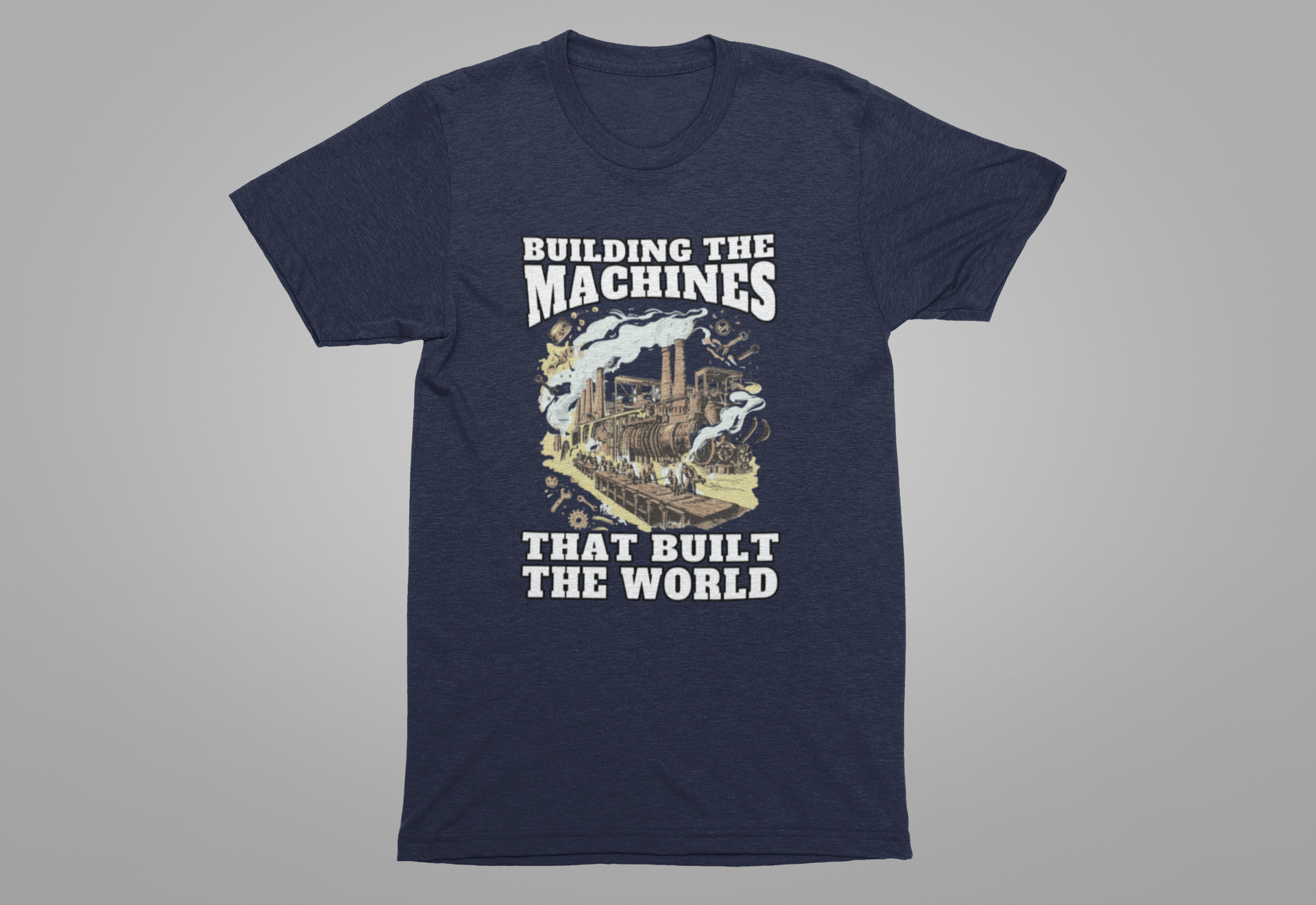 Celebrate the spirit of innovation and industry with this "Building the Machines that Built the World" tshirt. The striking graphic features a classic steam engine in motion, smoke billowing into the air, surrounded by workers and an array of tools—capturing the essence of the Industrial Revolution. This design pays homage to the inventors, engineers, and laborers whose ingenuity and hard work powered a new era and transformed societies. Perfect for history buffs, engineers, makers, and anyone inspired by the legacy of invention that shaped our modern world.