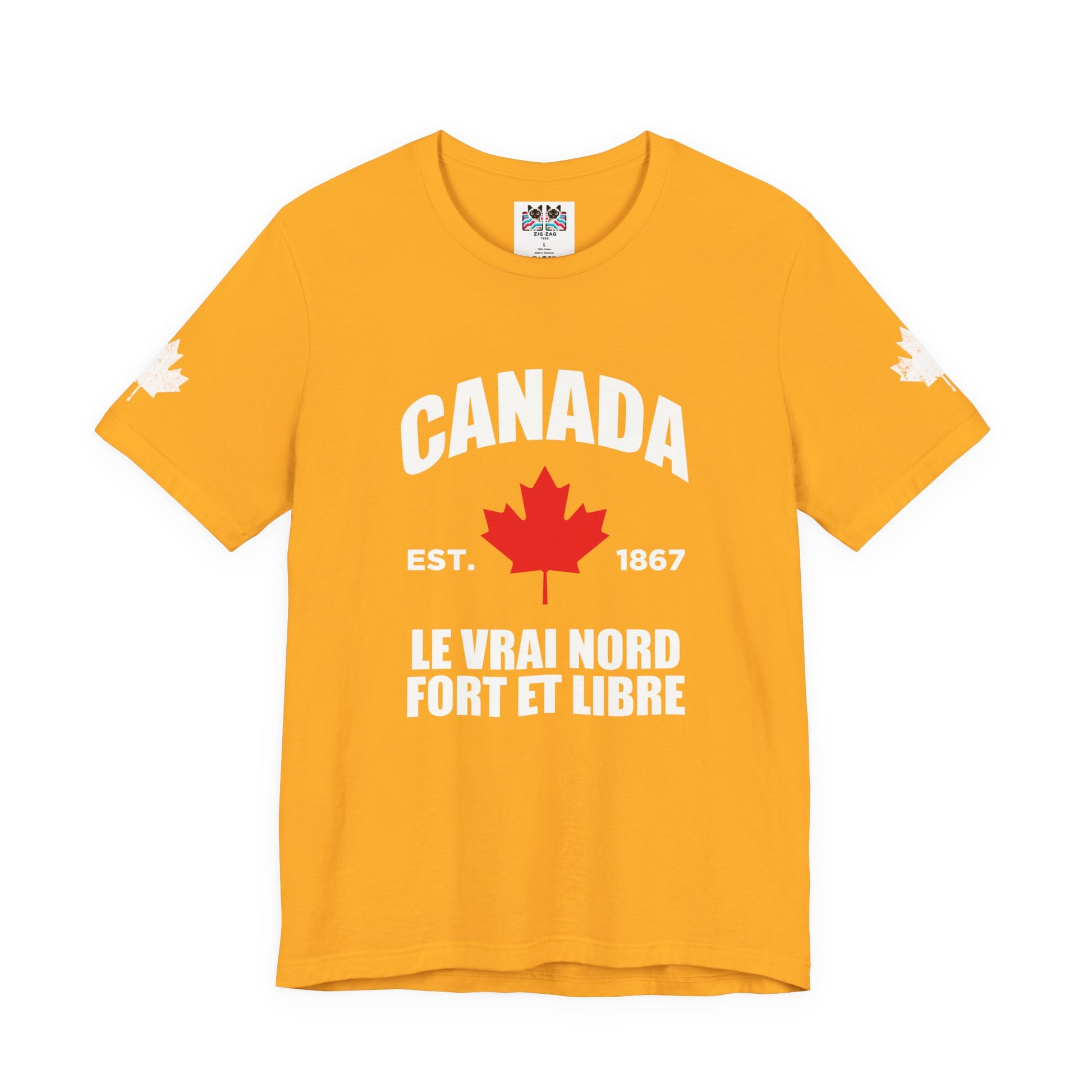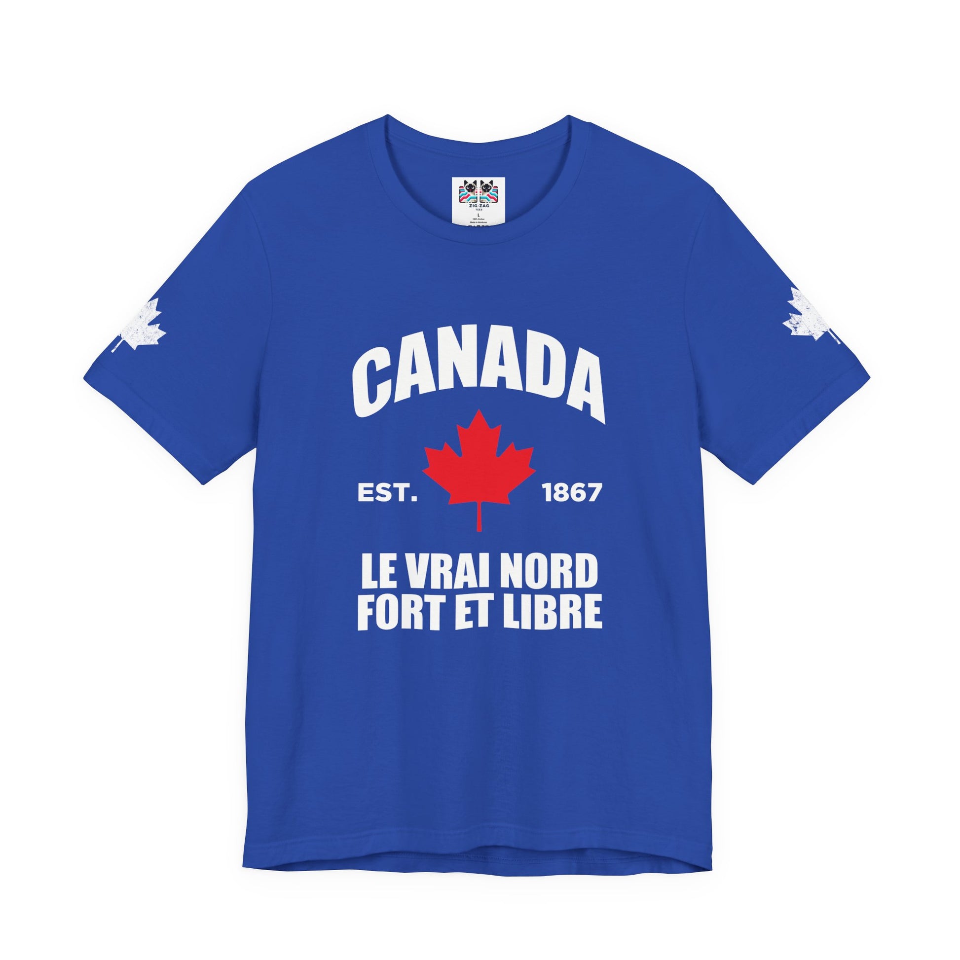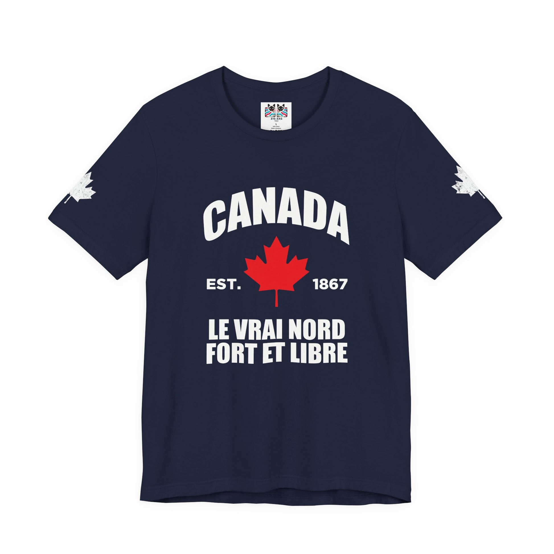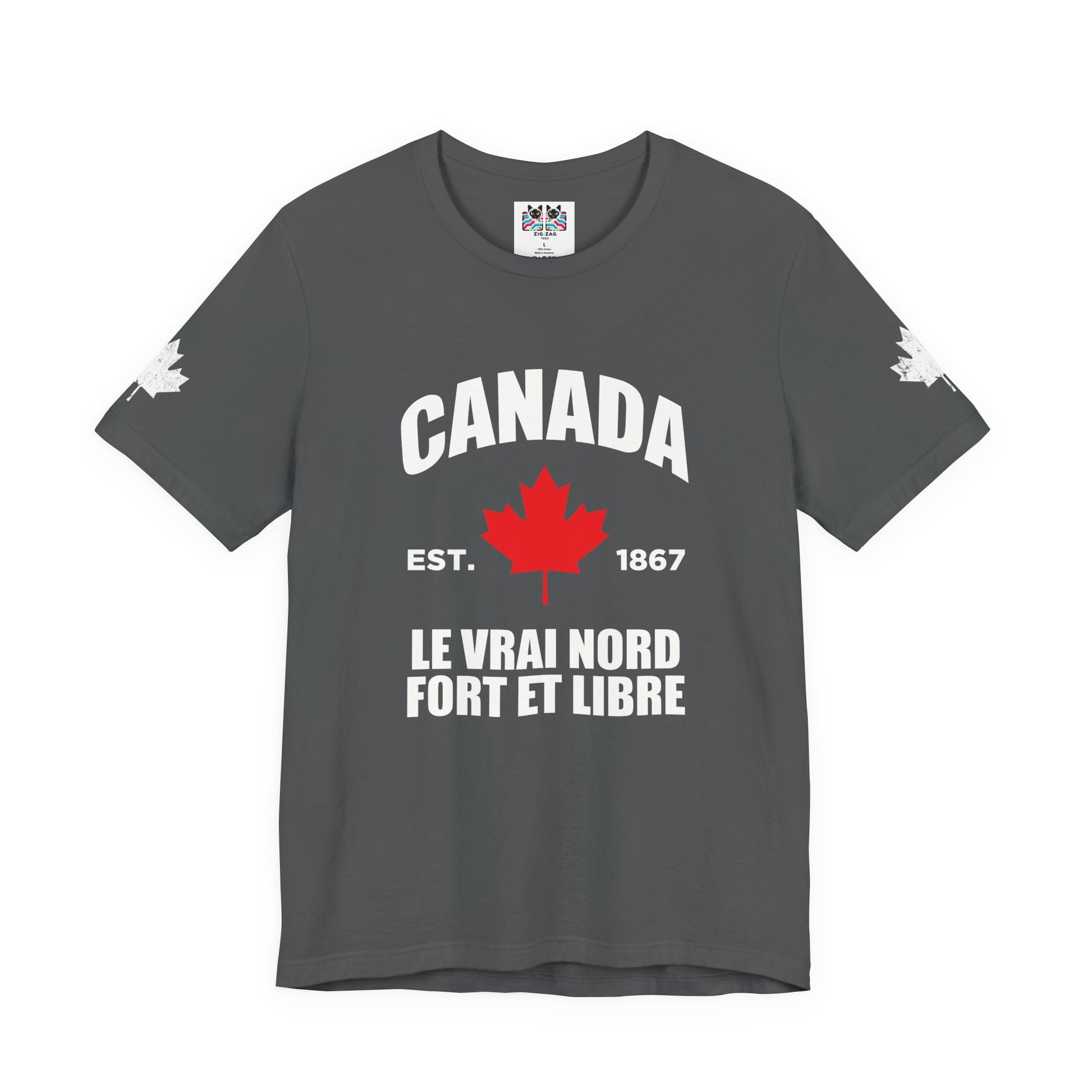 Show your pride with this iconic t-shirt featuring a maple leaf in the center, “CANADA” in large text above, and a empowering slogans below: “Le Vrai Nord, Fort Et Libre, EST. 1867.” The design combines patriotic flair with classic heritage, making it perfect for national holidays, special occasions, or everyday wear. Maple leaves on both sleeves add a final touch of Canadian spirit. This soft, comfortable tee is ideal for anyone who wants to celebrate the true north’s legacy and strength.
