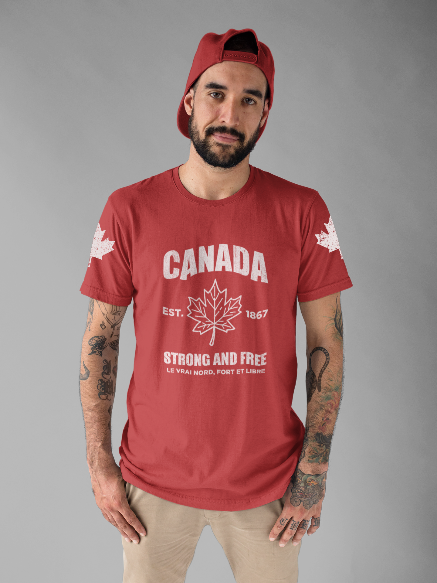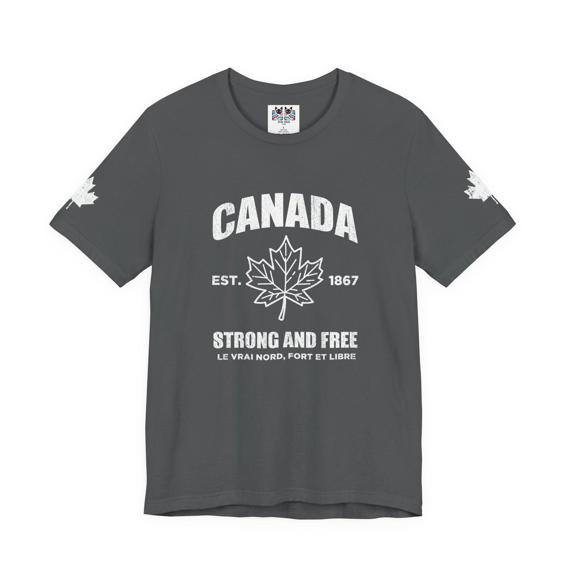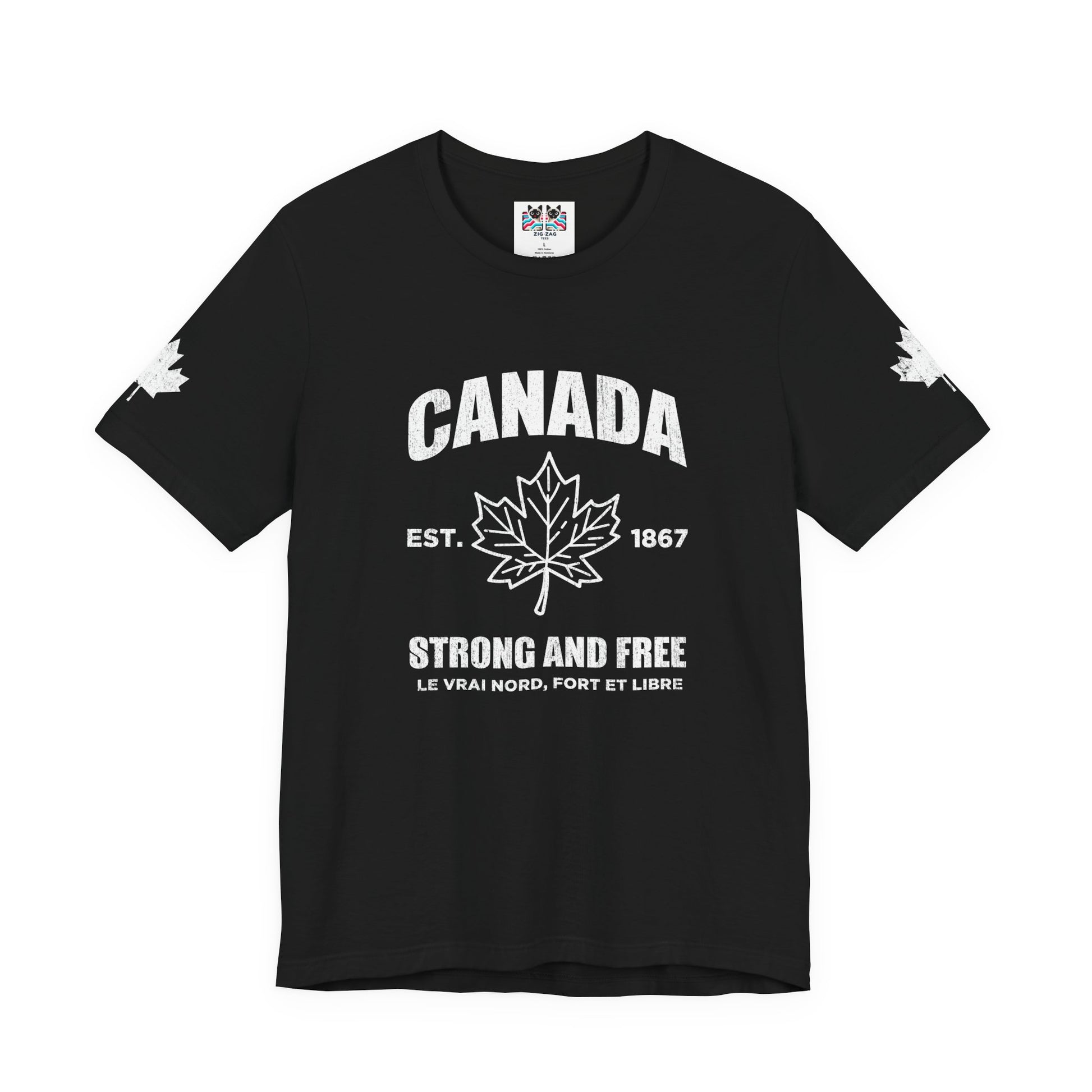 Show your pride with this iconic t-shirt featuring a bold maple leaf in the center, “CANADA” in large text above, and a trio of empowering slogans below: “Strong and Free, Le Vrai Nord, Fort Et Libre, EST. 1867.” The design combines patriotic flair with classic heritage, making it perfect for national holidays, special occasions, or everyday wear. Maple leaves on both sleeves add a final touch of Canadian spirit. This soft, comfortable tee is ideal for anyone who wants to celebrate the true north’s legacy and strength.