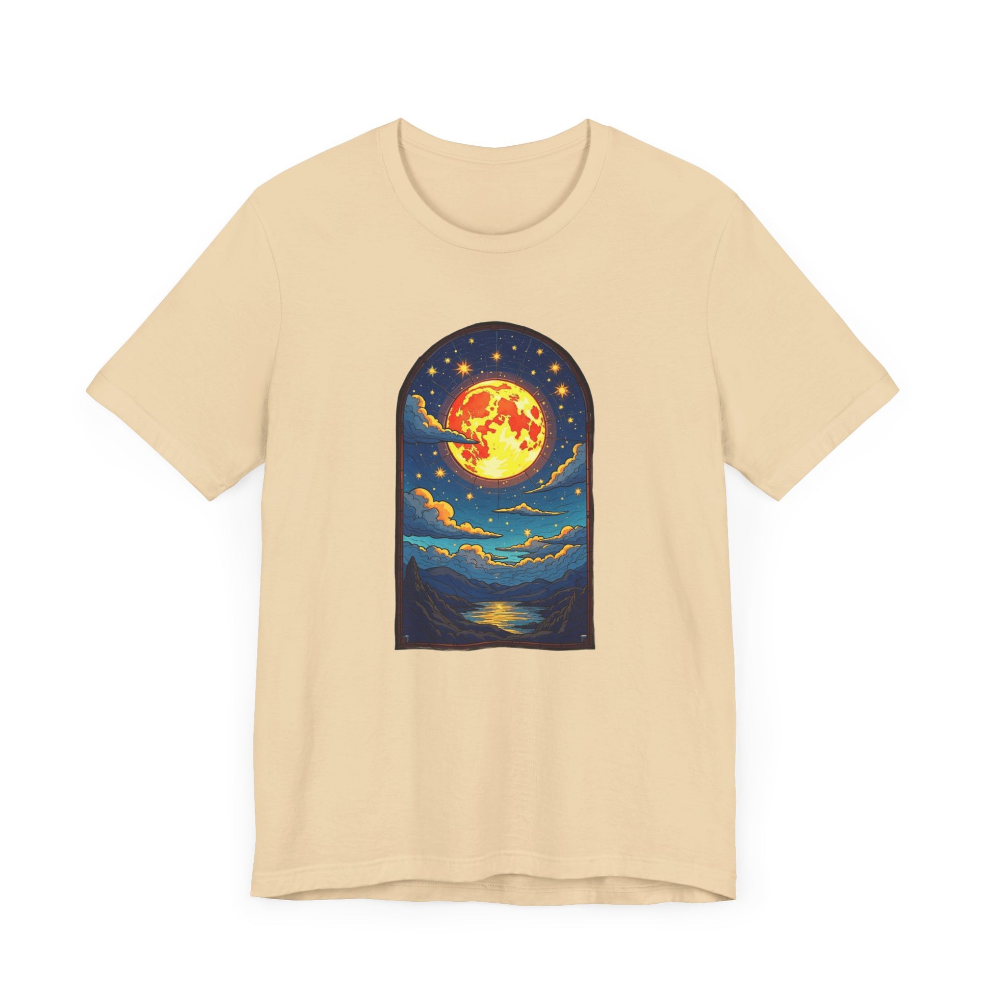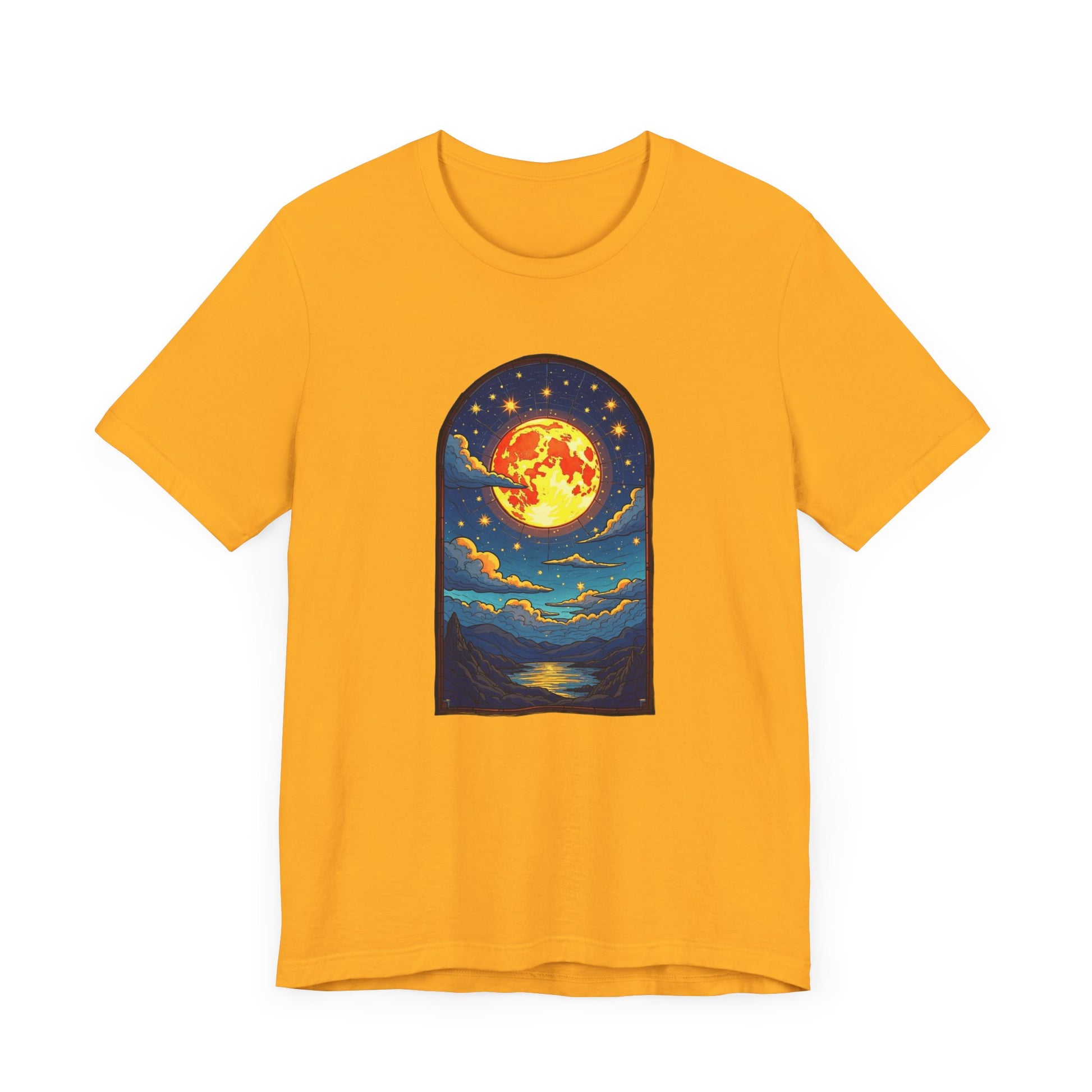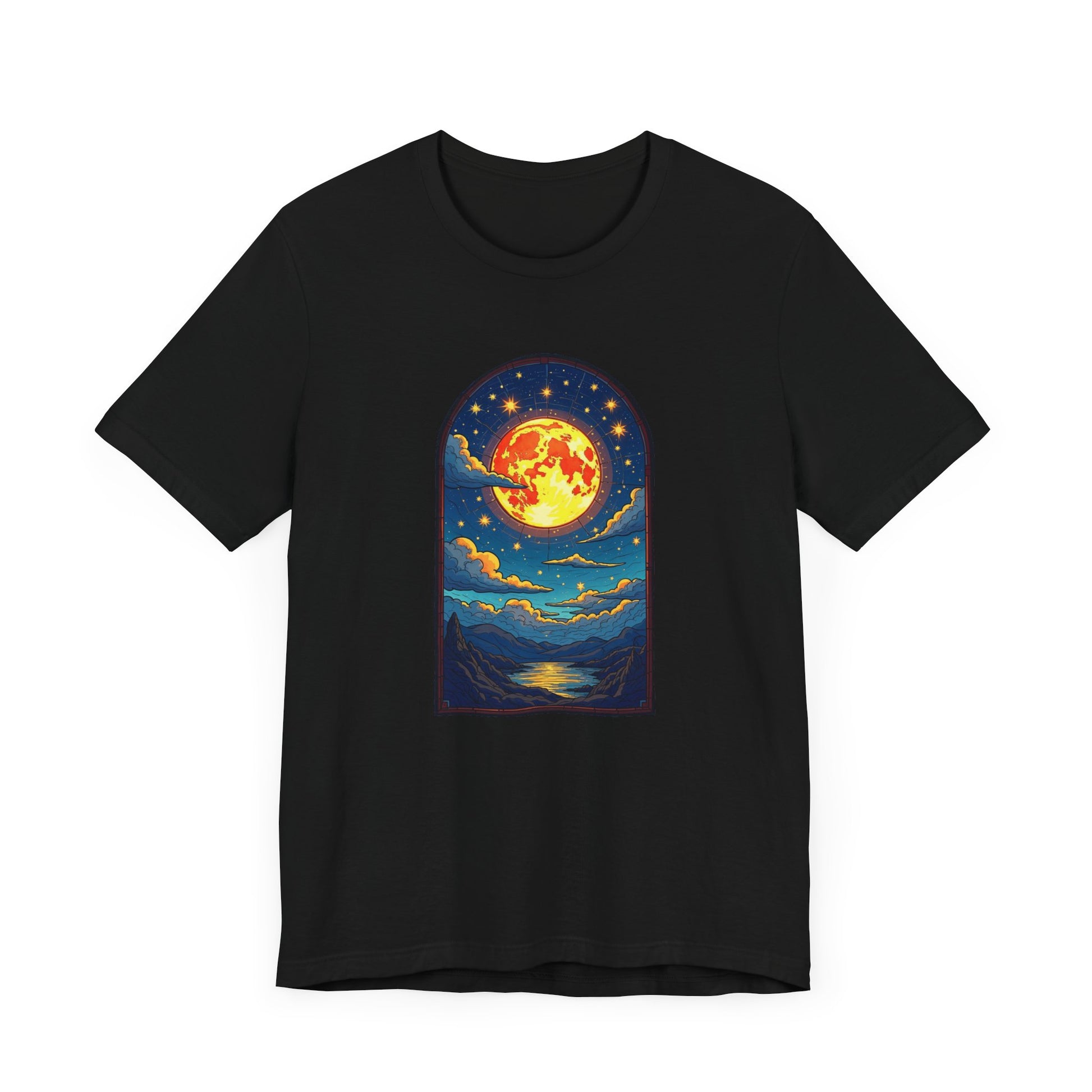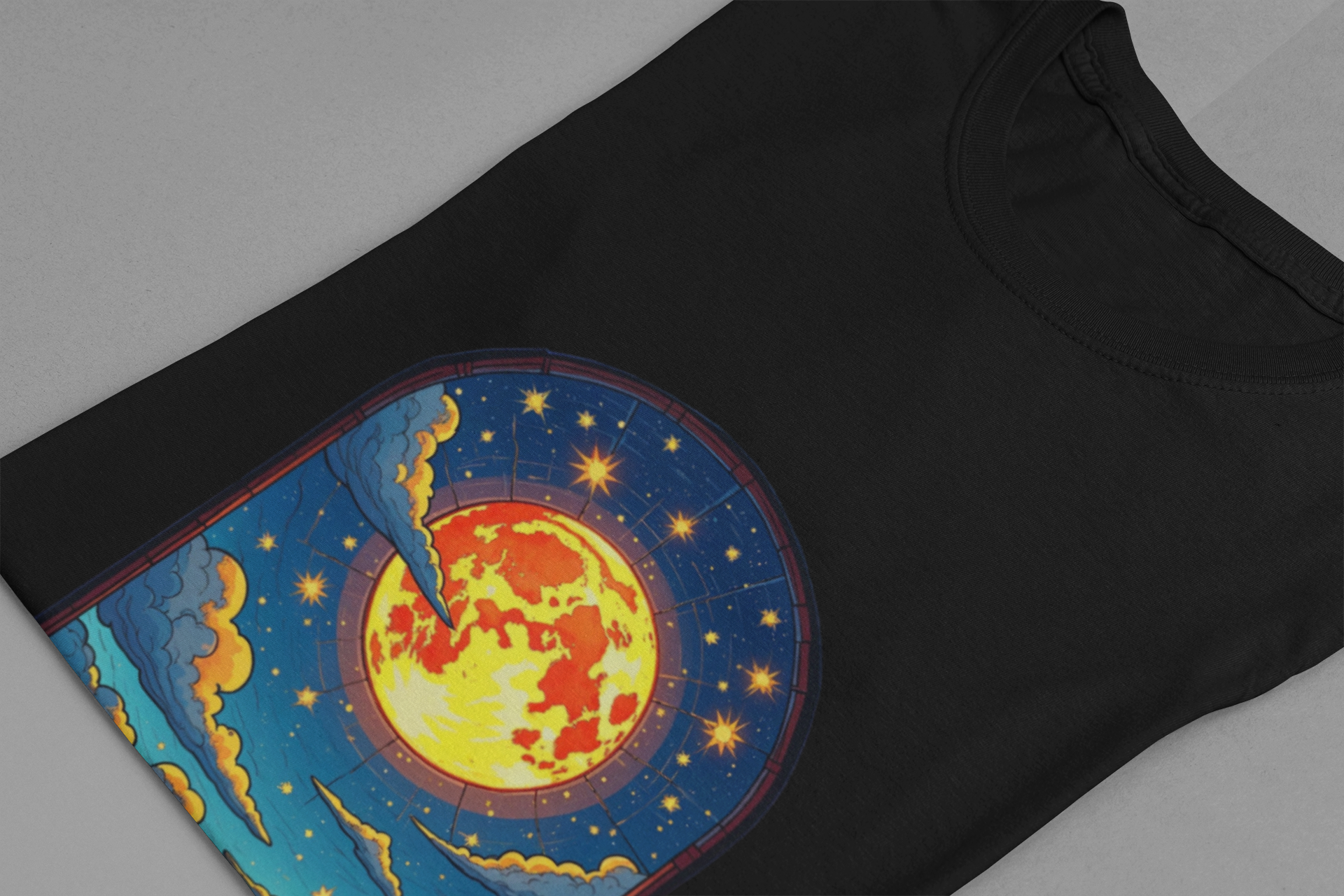 Immerse yourself in a mystical night scene with this captivating t-shirt featuring a view from a large castle window. At the center glows a radiant full moon in shades of yellow, orange, and red, encircled by a luminous halo. Below, mountains, clouds, and water reflect the moon’s enchanting light, while glowing stars twinkle in the sky. This atmospheric design evokes fantasy and serenity, perfect for lovers of castles, moonlit landscapes, and magical nights. Made from soft, high-quality fabric for comfortable wear and striking style