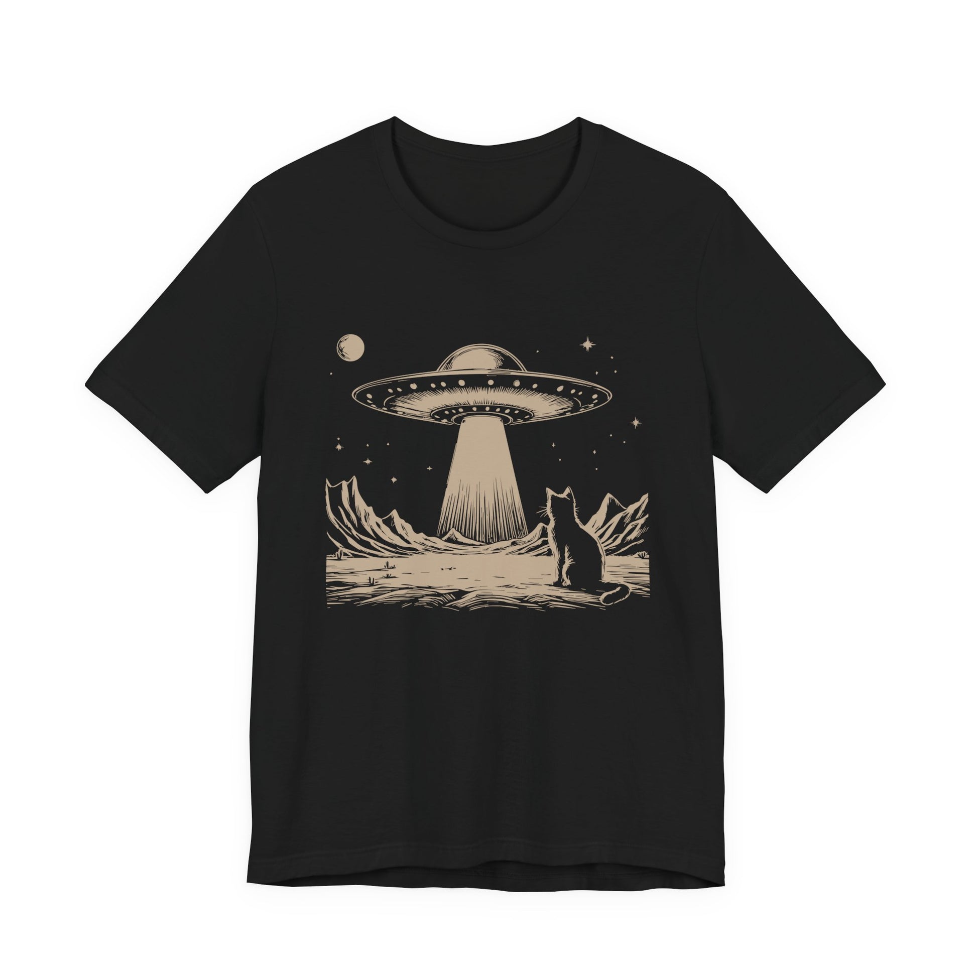 Cat Watching UFO T-Shirt – Mysterious Space Scene Graphic Tee