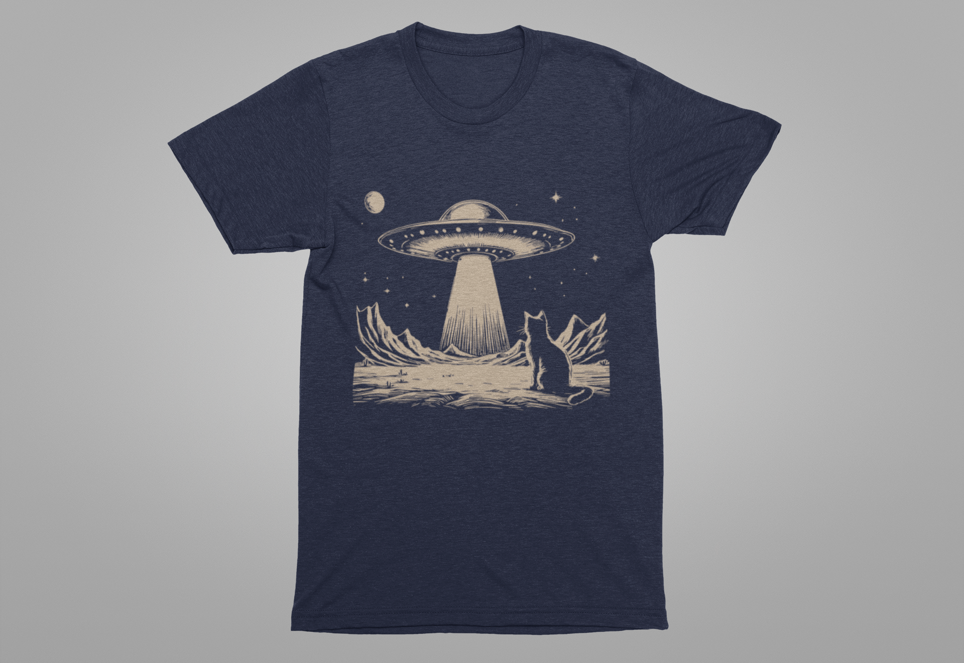 Embark on a cosmic adventure with this captivating T-shirt featuring a curious cat sitting quietly, watching a UFO flash its light on the ground amid mountain silhouettes. Perfect for cat lovers and space enthusiasts alike, this design captures a blend of mystery, wonder, and feline curiosity. A great gift for anyone enchanted by the unknown and lovers of whimsical, imaginative graphics.