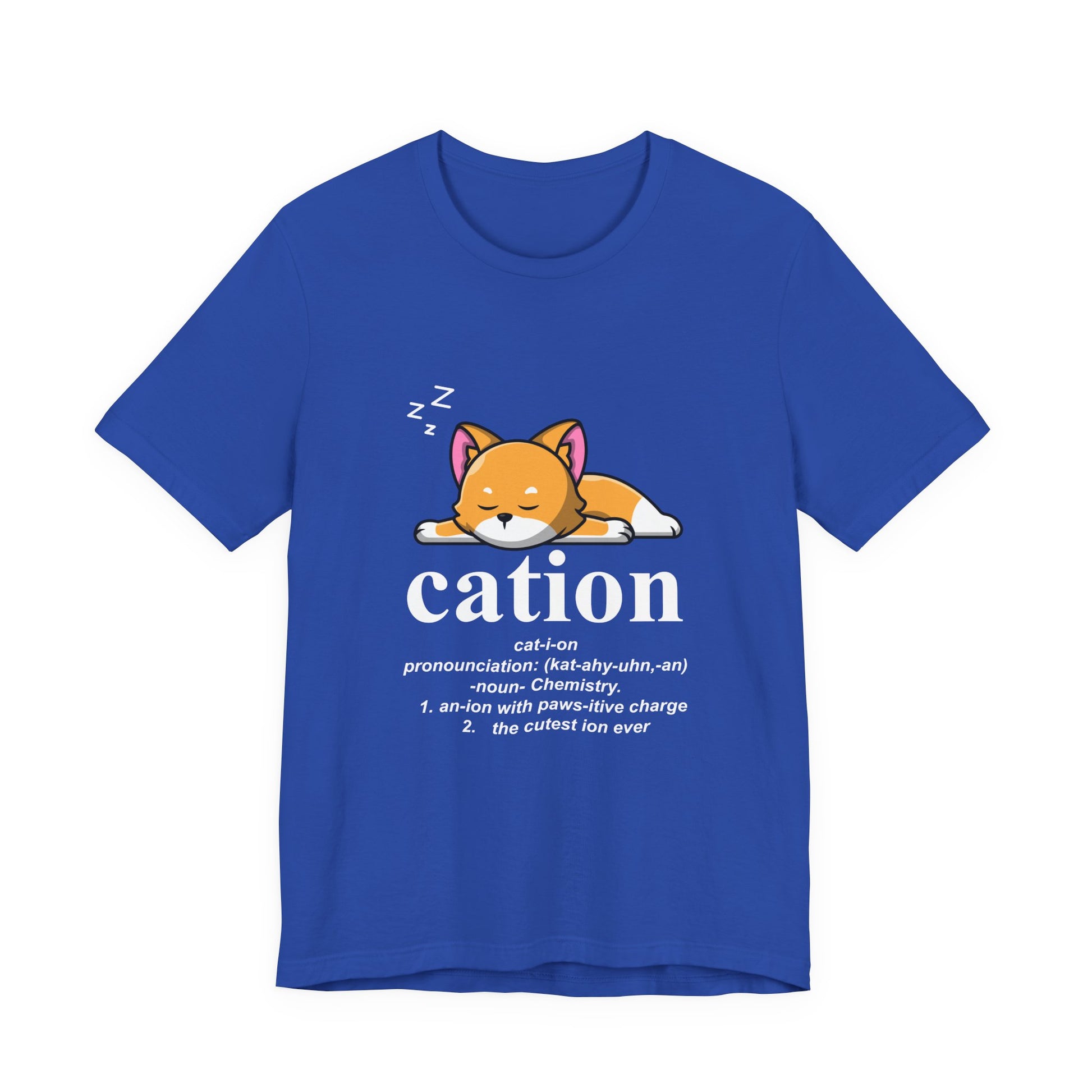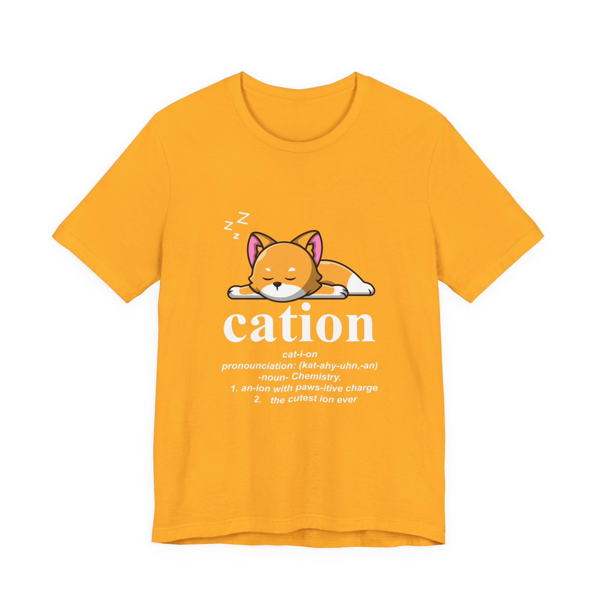 Bring a smile to science lovers with this playful "Caution Cat-i-on" tshirt featuring a lazy, sleepy cat lounging atop the text. The design cleverly plays on the word "cation" (a positively charged ion in chemistry) by breaking it down phonetically as "kat-ahy-uhn,-an" and defining it as a chemistry term. Perfect for chemists, students, teachers, and cat lovers alike, this tshirt combines humor and science in a fun, memorable way.