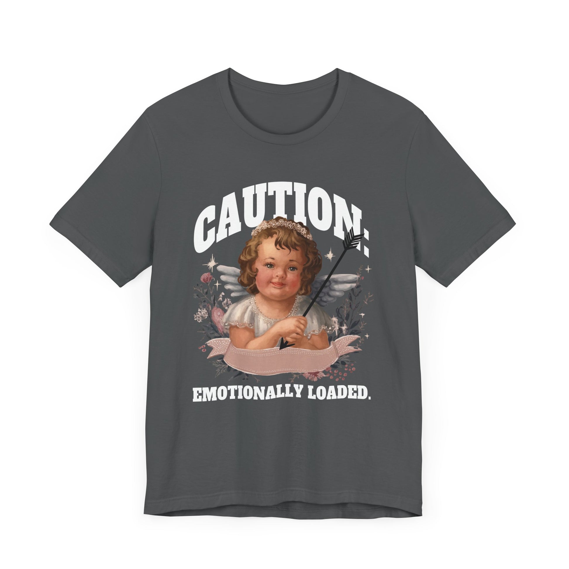 Make a heartfelt statement with this "Caution: Emotionally Loaded" t-shirt, featuring the expressive face of a little girl angel holding an arrow. The design blends innocence and emotion, symbolizing the powerful feelings we sometimes carry. Perfect for those who wear their hearts on their sleeves or want to share a message of emotional awareness with a touch of whimsy. Made from soft, comfortable fabric, it’s ideal for casual wear, gifting, or anyone who appreciates meaningful, artistic graphics.