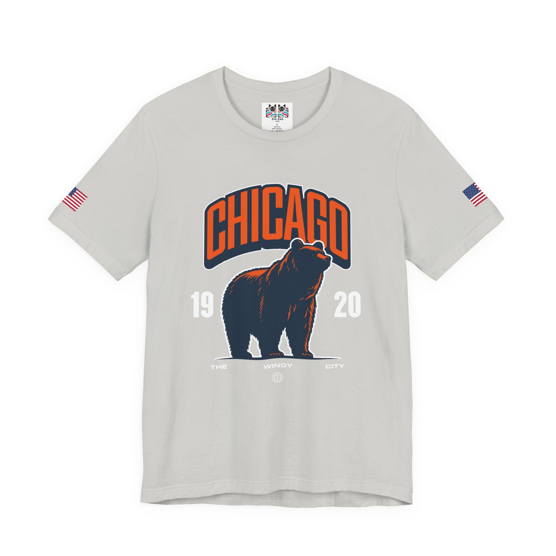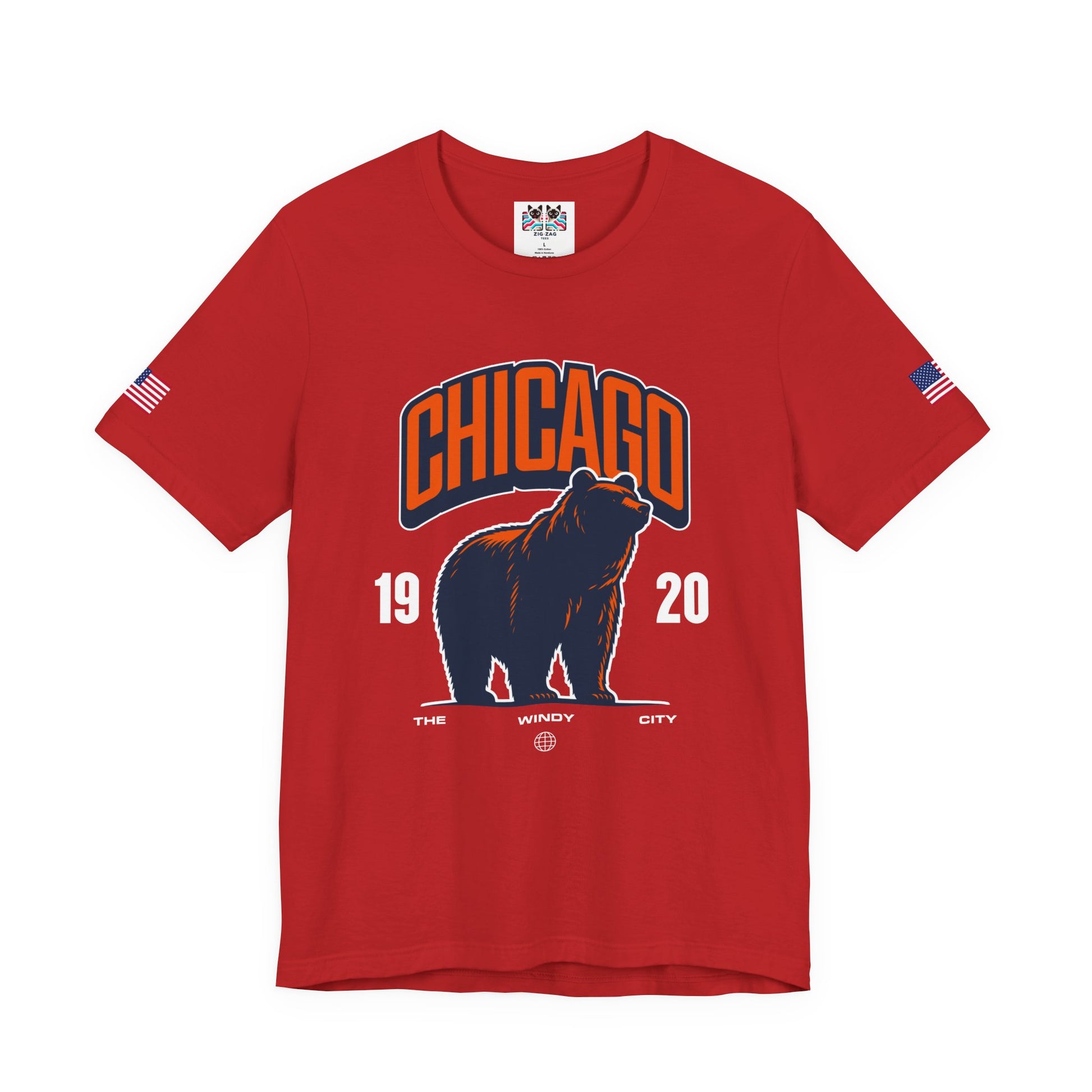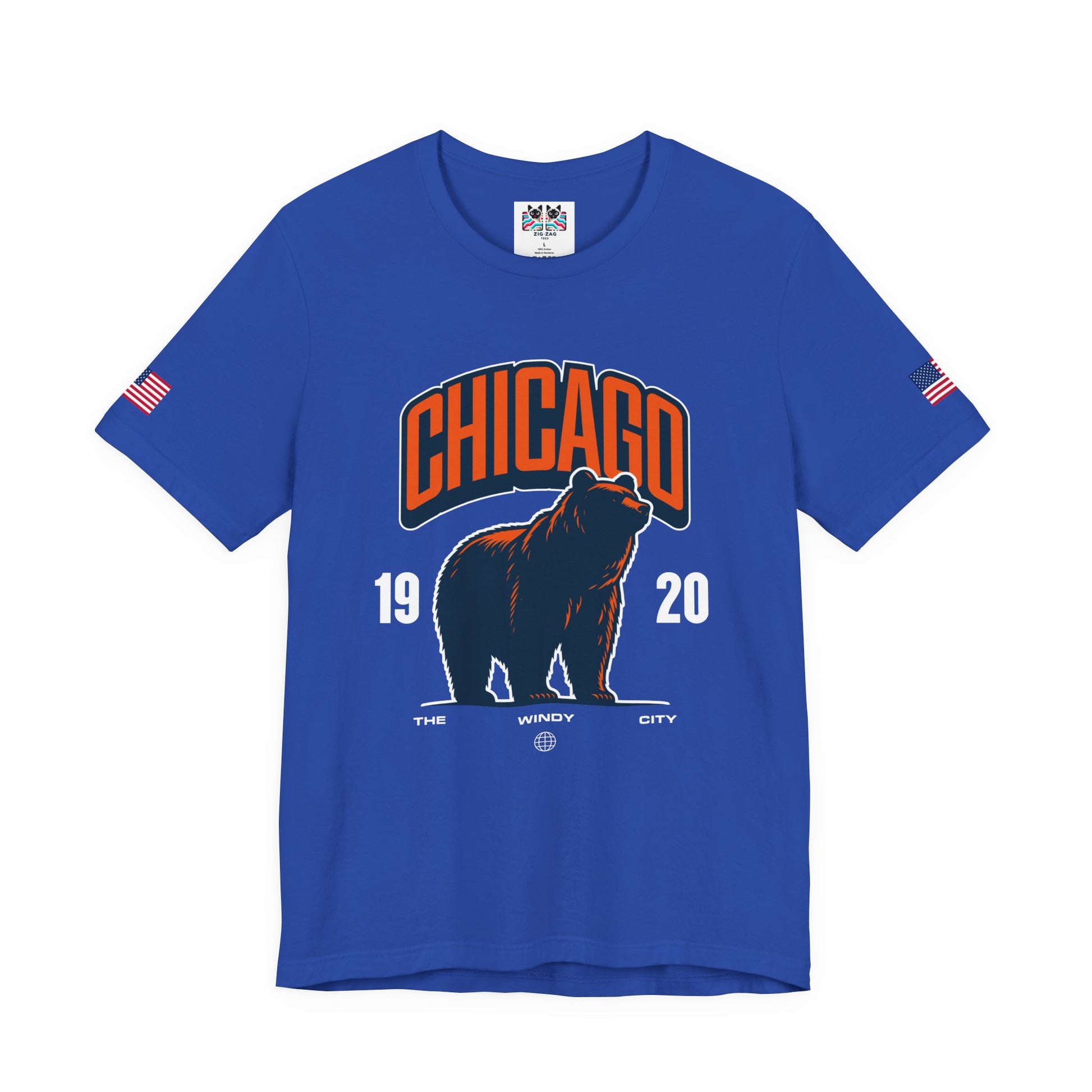Show Chicago pride with this striking bear design featuring "CHICAGO" in bold orange collegiate letters above a powerful silhouette of a roaring bear! The navy blue bear with orange outline on dark fabric creates dramatic contrast, with "19 20" flanking the bear and "THE WINDY CITY" text below with a globe icon. The roaring bear perfectly symbolizes Chicago's strength, power, and fierce competitive spirit. The design works both as general Chicago pride and as a nod to the city's famous sports teams that use bear mascots. Chicago's "Windy City" nickname combined with the aggressive bear imagery represents the city's bold, unapologetic character and reputation for toughness. This navy blue t-shirt with American flag sleeve patches is perfect for Chicago sports fans, Windy City residents, Illinois pride, or anyone who identifies with Chicago's powerful, no-nonsense attitude. Great for sports events, city pride, or everyday bold Chicago style.