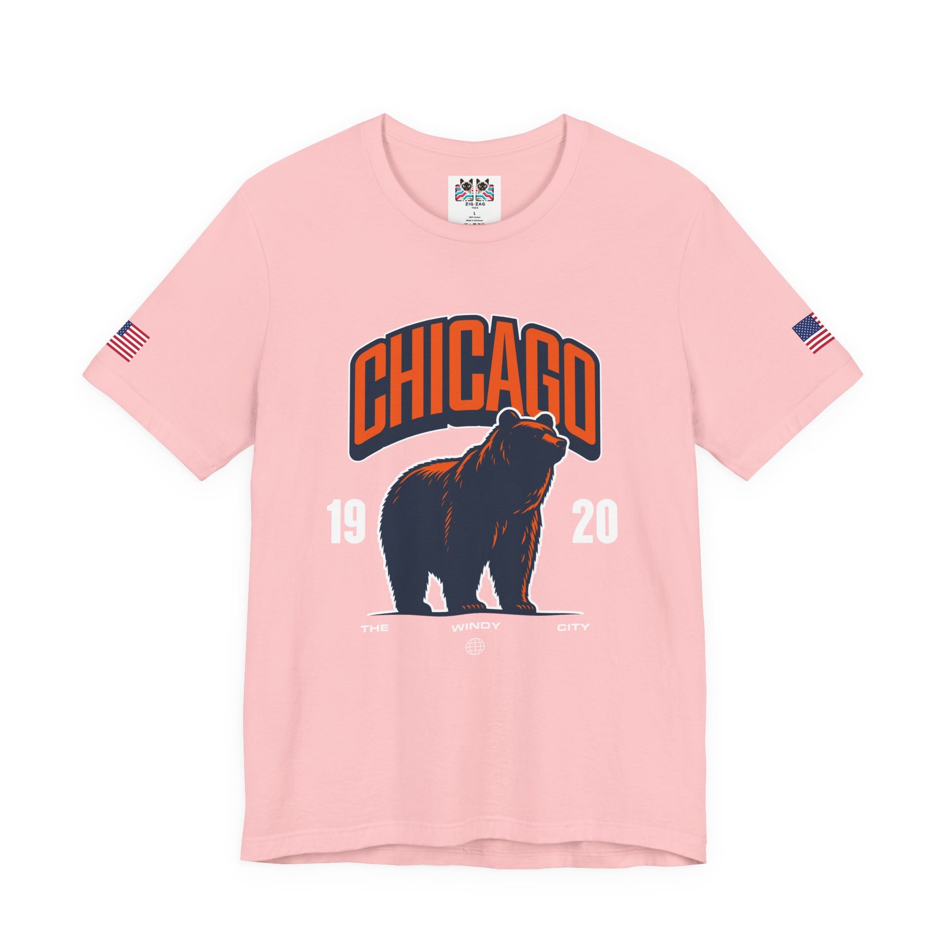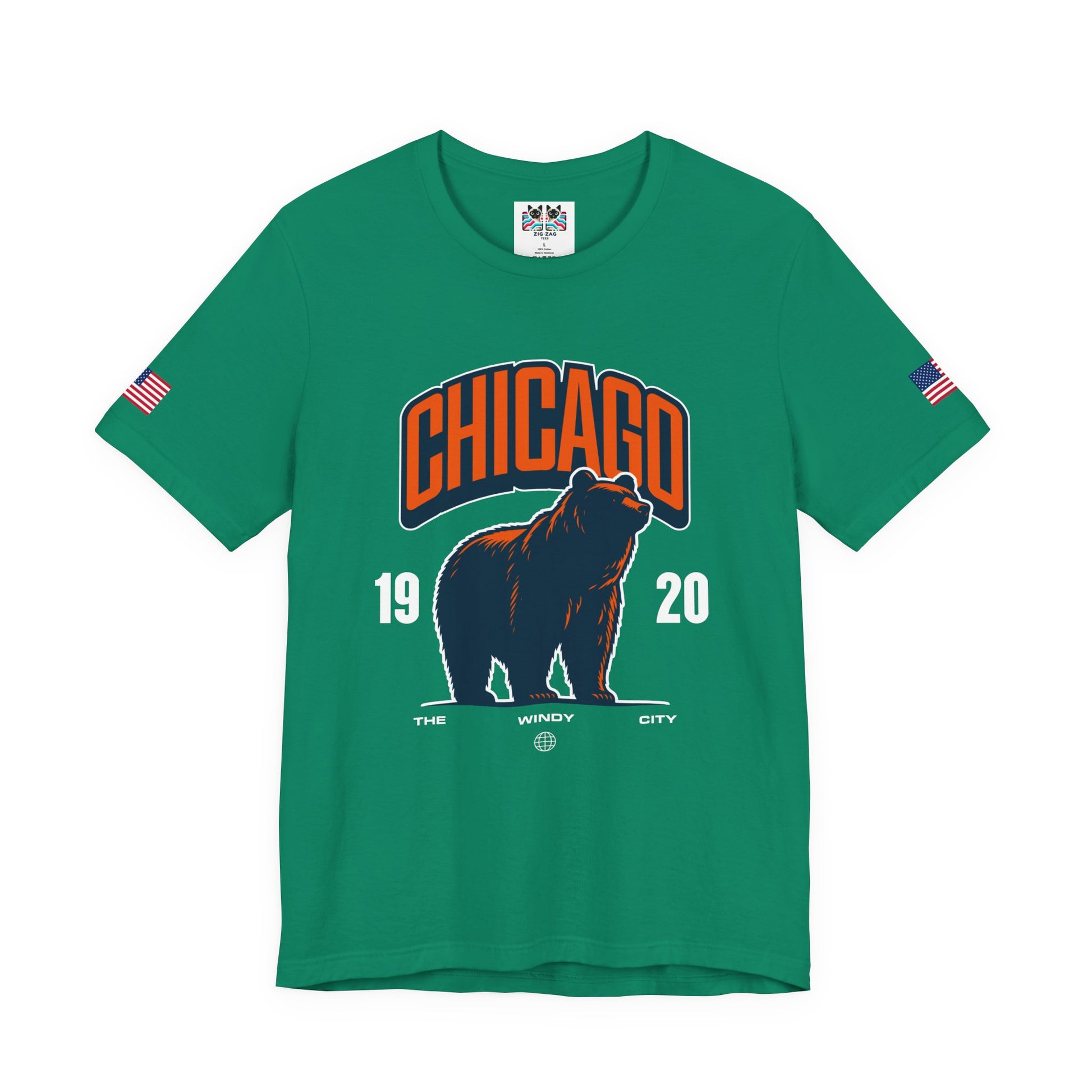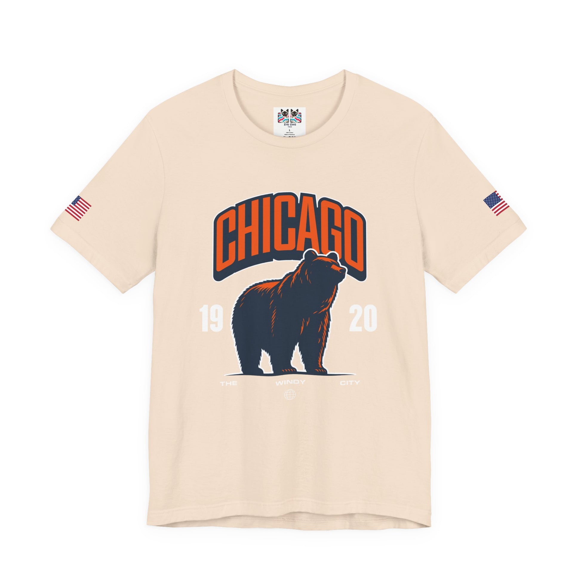 Show Chicago pride with this striking bear design featuring "CHICAGO" in bold orange collegiate letters above a powerful silhouette of a roaring bear! The navy blue bear with orange outline on dark fabric creates dramatic contrast, with "19 20" flanking the bear and "THE WINDY CITY" text below with a globe icon. The roaring bear perfectly symbolizes Chicago's strength, power, and fierce competitive spirit. The design works both as general Chicago pride and as a nod to the city's famous sports teams that use bear mascots. Chicago's "Windy City" nickname combined with the aggressive bear imagery represents the city's bold, unapologetic character and reputation for toughness. This navy blue t-shirt with American flag sleeve patches is perfect for Chicago sports fans, Windy City residents, Illinois pride, or anyone who identifies with Chicago's powerful, no-nonsense attitude. Great for sports events, city pride, or everyday bold Chicago style.