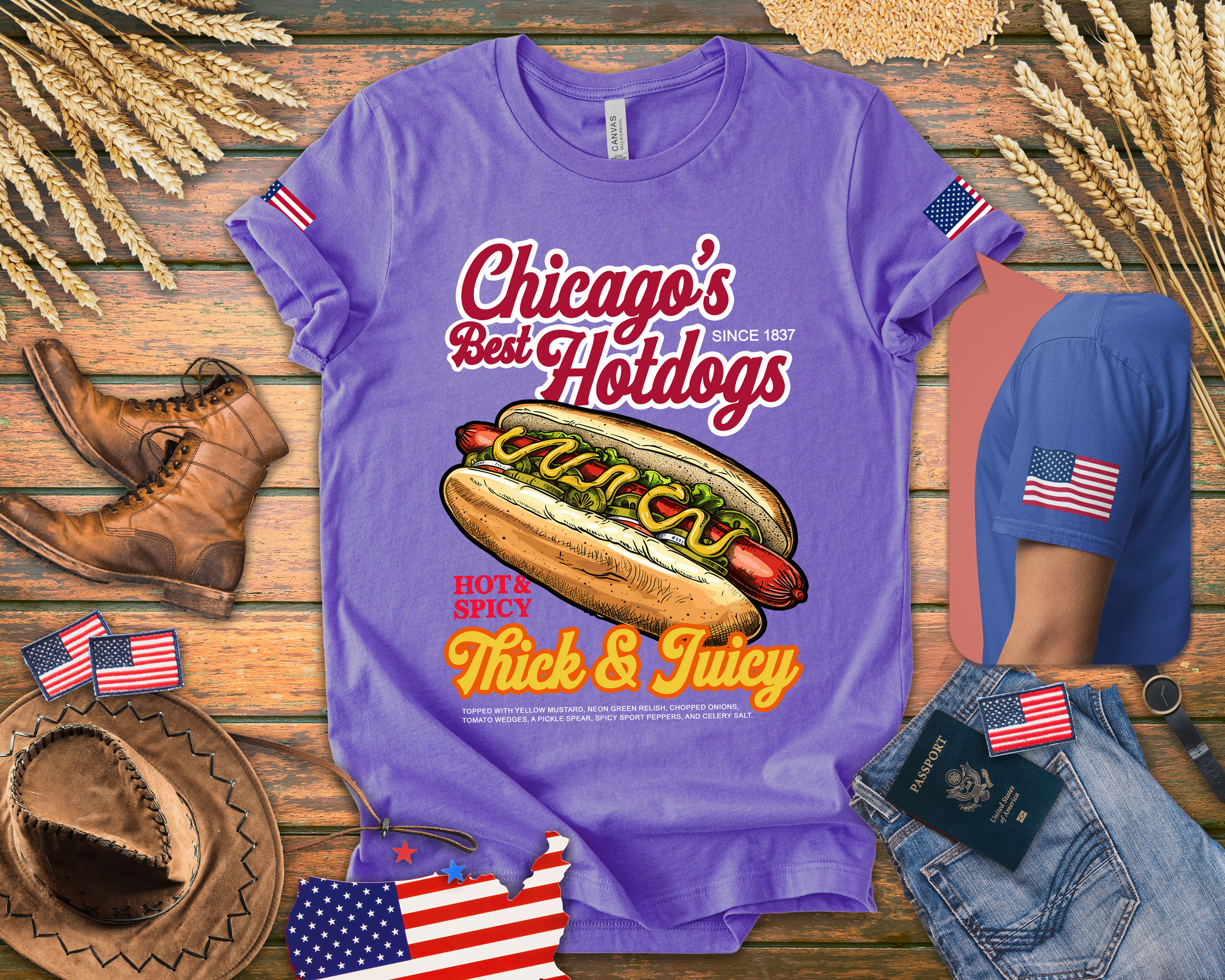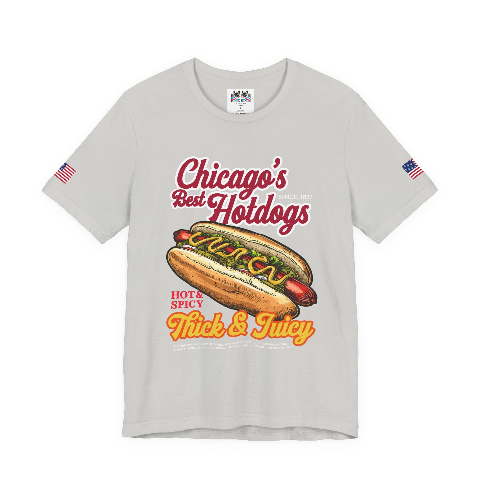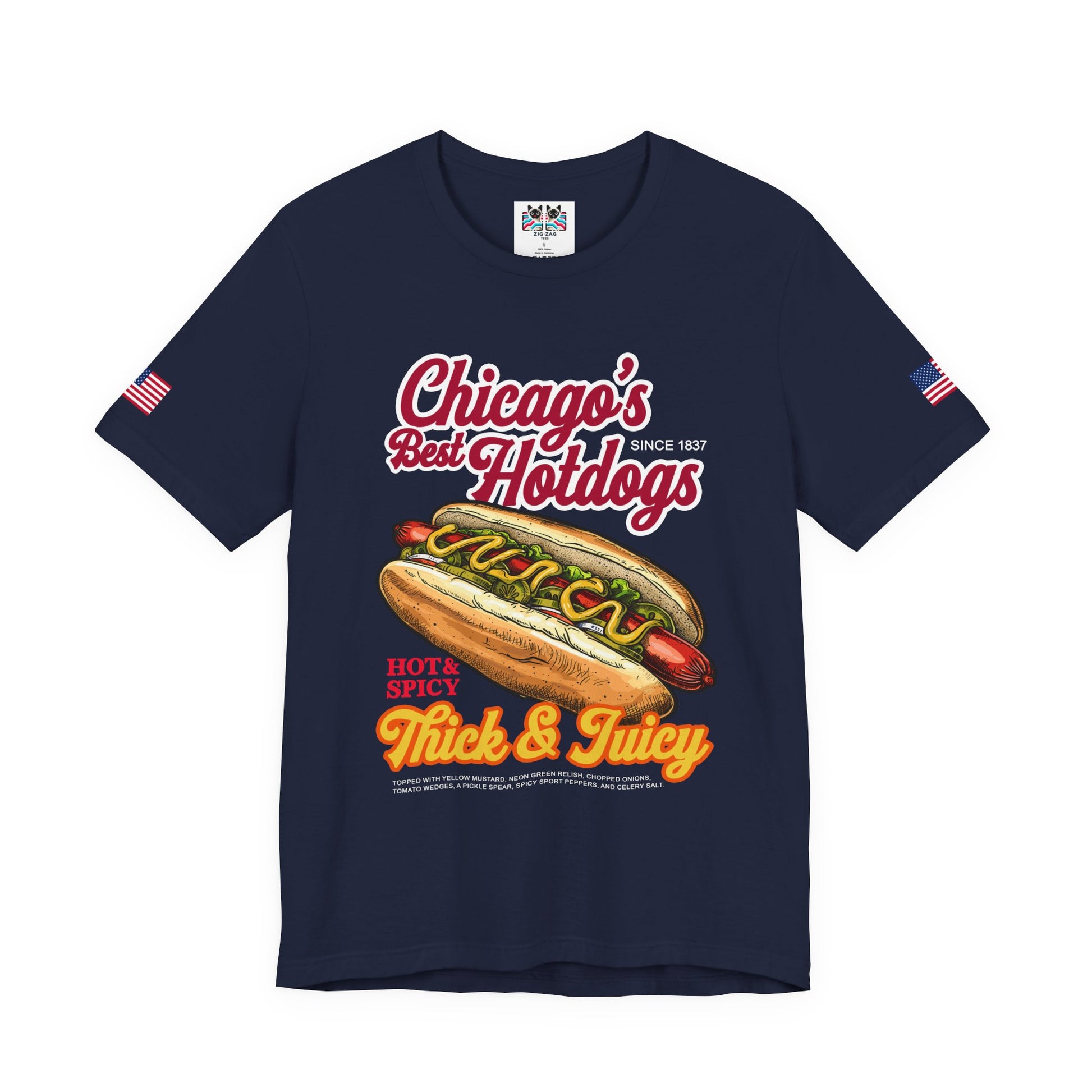 Celebrate Chicago's most iconic food with this mouth-watering "Chicago's Best Hotdogs" t-shirt featuring a delicious illustrated Chicago-style hot dog! The design showcases "HOT & SPICY - Thick & Juicy" with a perfectly assembled Chicago dog complete with yellow mustard, neon green relish, chopped onions, tomato wedges, pickle spear, sport peppers, and celery salt on a poppy seed bun - all flanked by Lady Liberty illustrations. The authentic Chicago-style hot dog is a city institution with strict rules: never ketchup! Vienna Beef hot dogs at places like Portillo's, Superdawg, and countless neighborhood stands have defined Chicago food culture since the early 1900s. This purple t-shirt with American flag sleeve patches is perfect for Chicago foodies, hot dog enthusiasts, Portillo's fans, tourists who discovered Chicago dogs, or anyone who understands that Chicago does hot dogs better than anywhere else. Great for food lovers, Chicago natives, or humorous foodie gifts!