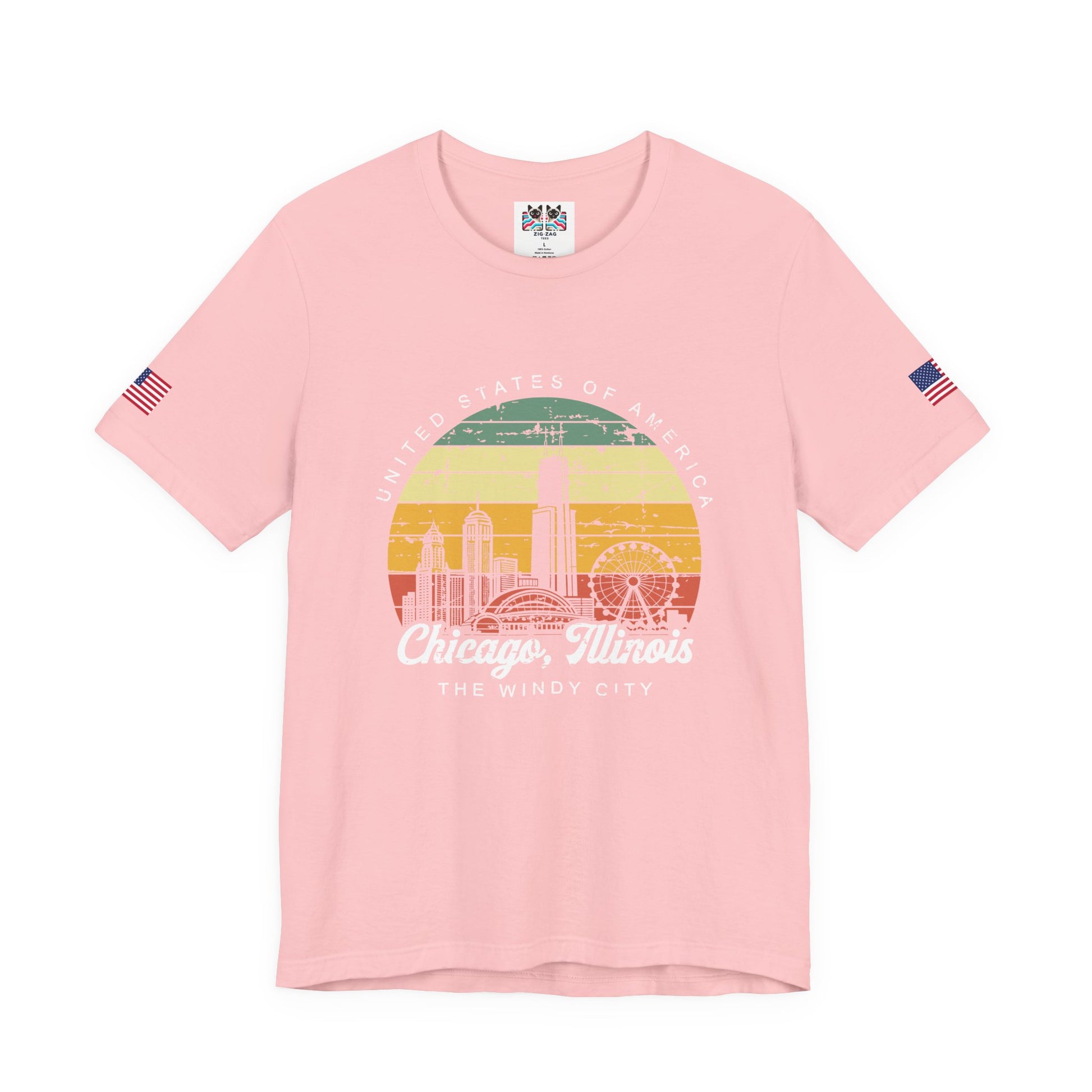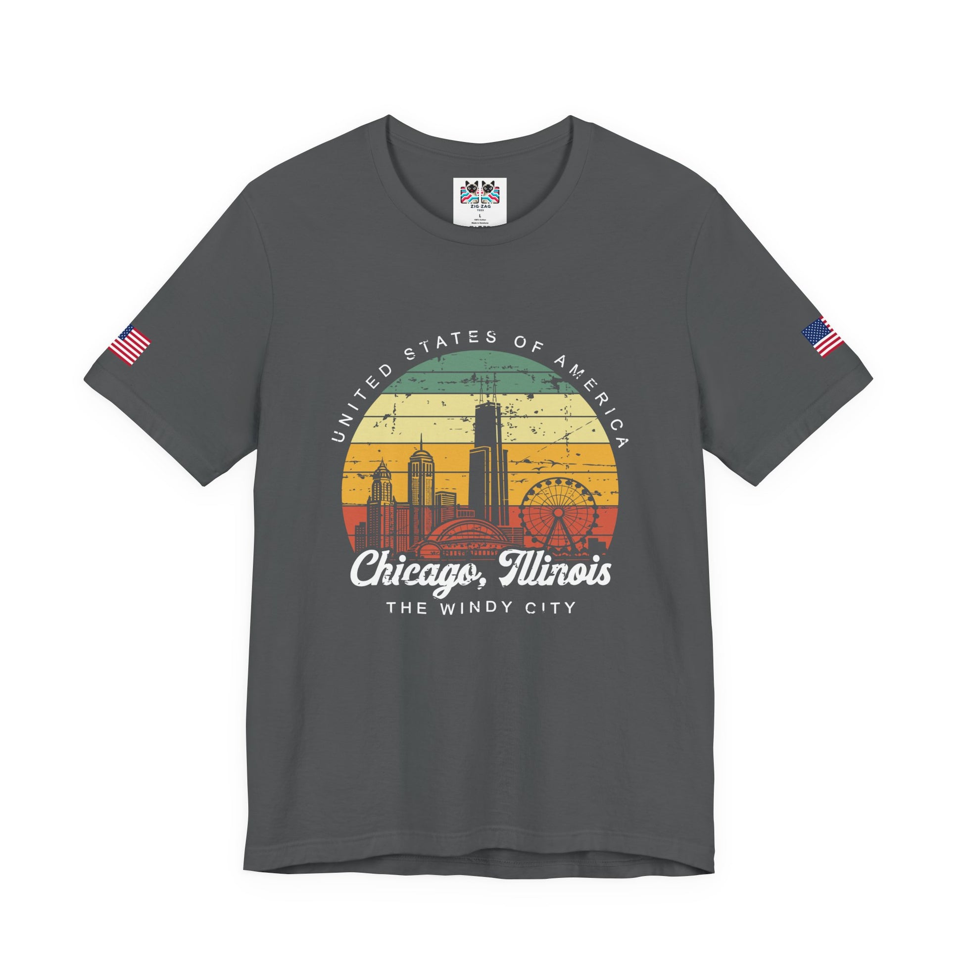 Catch a Chicago sunset with this stunning retro t-shirt featuring the Chicago skyline in a vintage 70s-style sunset circle! The design shows "UNITED STATES OF AMERICA" text curved around the top, with Chicago's iconic buildings including Willis Tower and the Navy Pier Ferris wheel silhouetted against orange, yellow, and teal horizontal stripes reminiscent of 1970s sunset graphics. Below reads "Chicago, Illinois - THE WINDY CITY" in elegant script. The distressed, weathered look gives this authentic vintage appeal perfect for retro fashion lovers. Navy Pier's Centennial Wheel (formerly Ferris Wheel) is one of Chicago's most recognizable landmarks, especially at sunset over Lake Michigan. This t-shirt with American flag sleeve patches is perfect for vintage enthusiasts, 70s retro style lovers, Chicago sunset admirers, Navy Pier fans, or anyone who appreciates nostalgic Americana design with a Chicago twist. Great for retro fashion, vintage collectors, or Chicago memories.