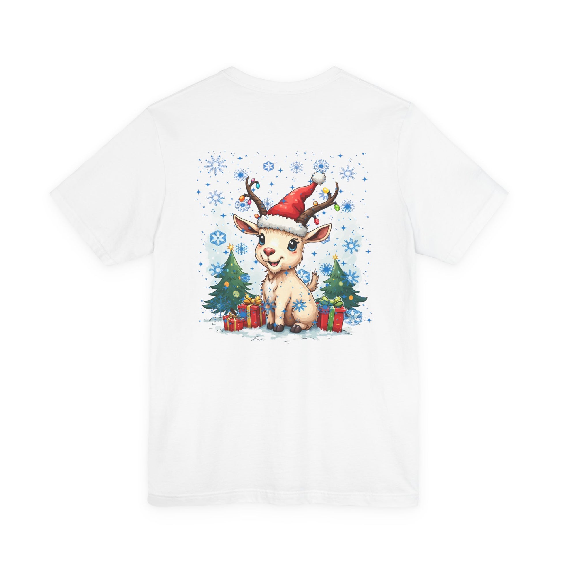Celebrate the holiday season with this festive t-shirt featuring a joyful goat wearing a Santa cap adorned with Christmas lights on its horns. The scene is set with snowflakes gently falling, surrounded by gifts, a beautifully decorated Christmas tree, and a snowy landscape. Perfect for anyone who loves goats, Christmas, and cheerful holiday apparel, this soft and comfortable tee spreads warmth and holiday spirit.