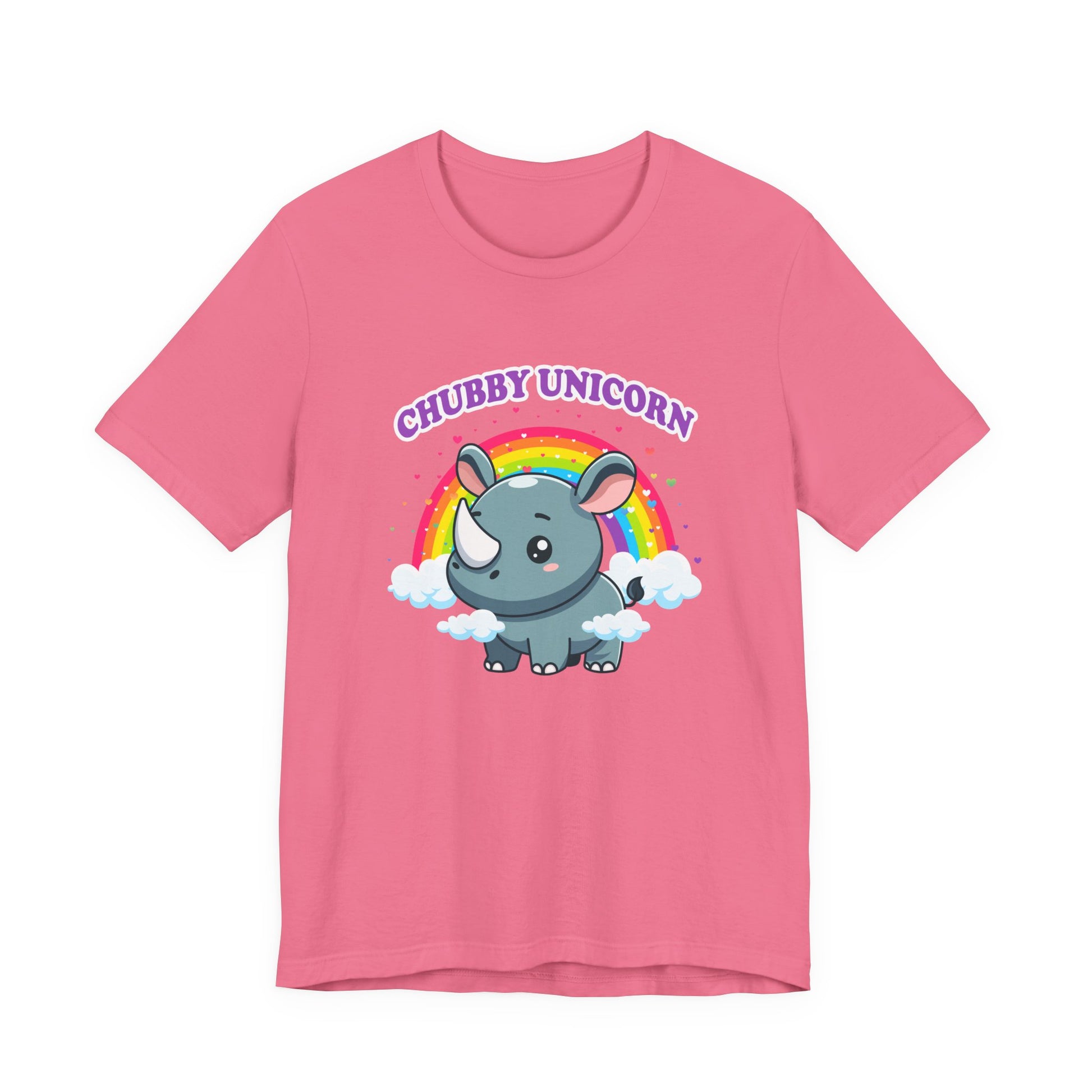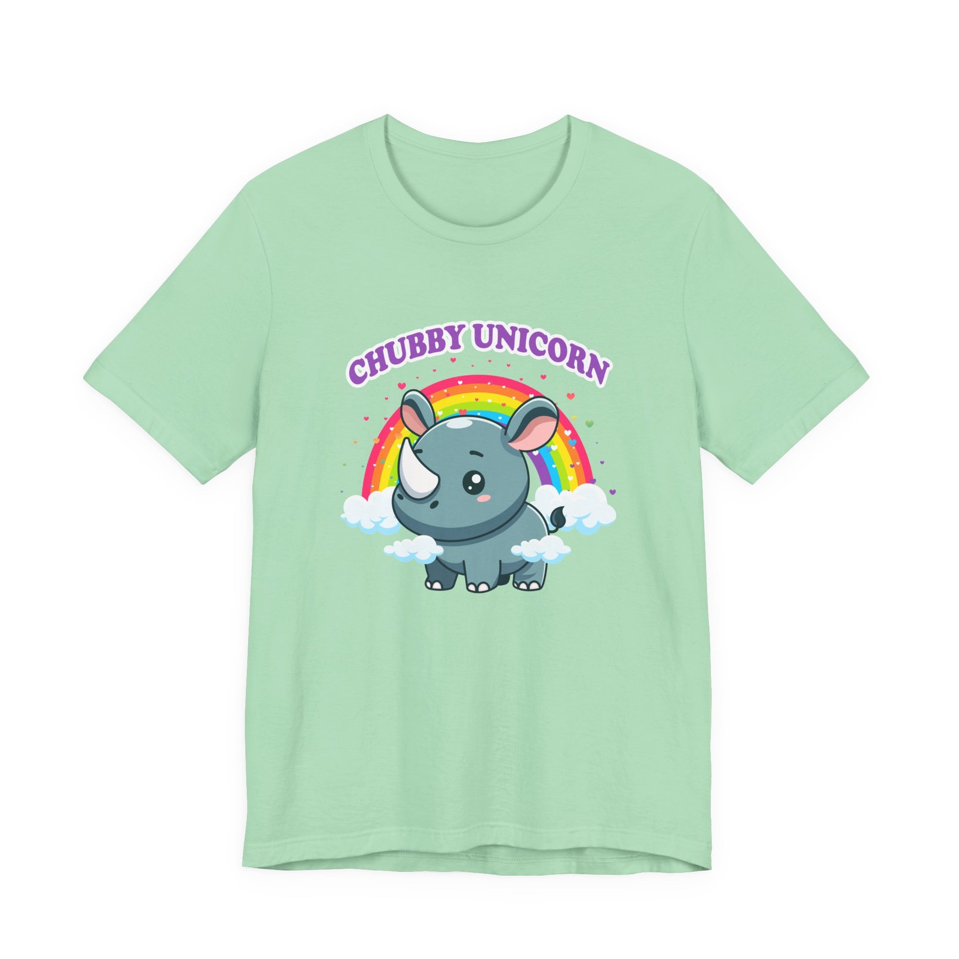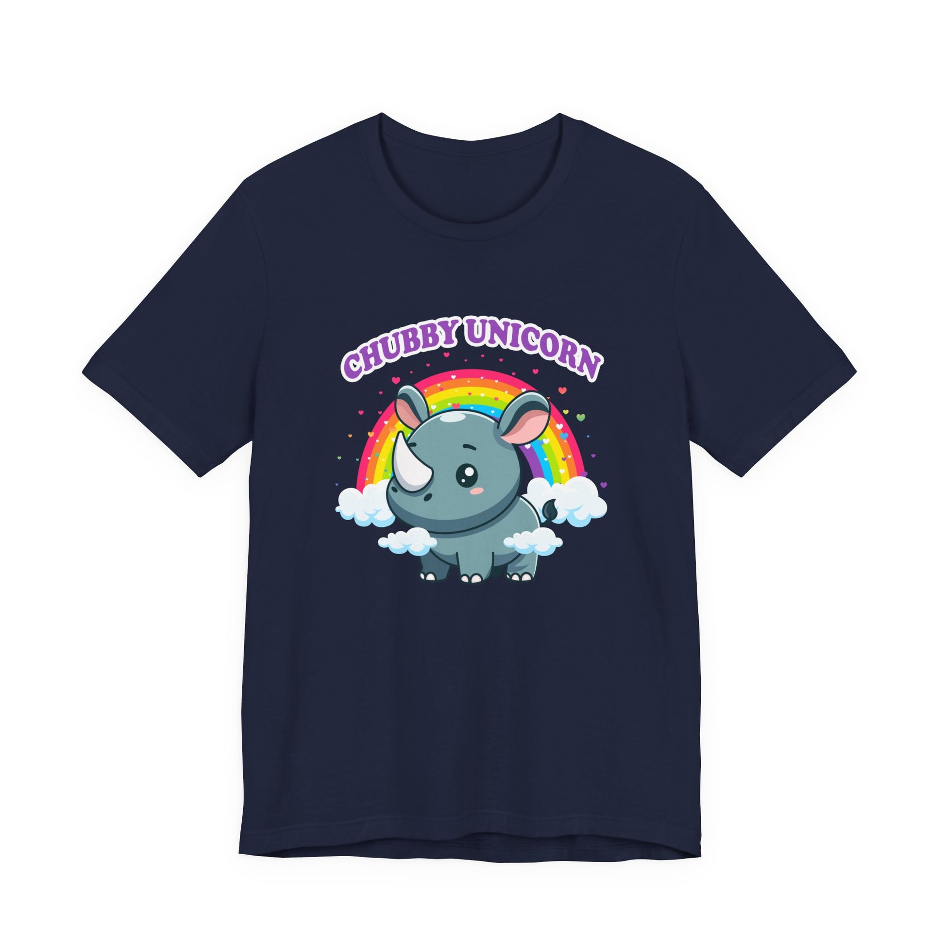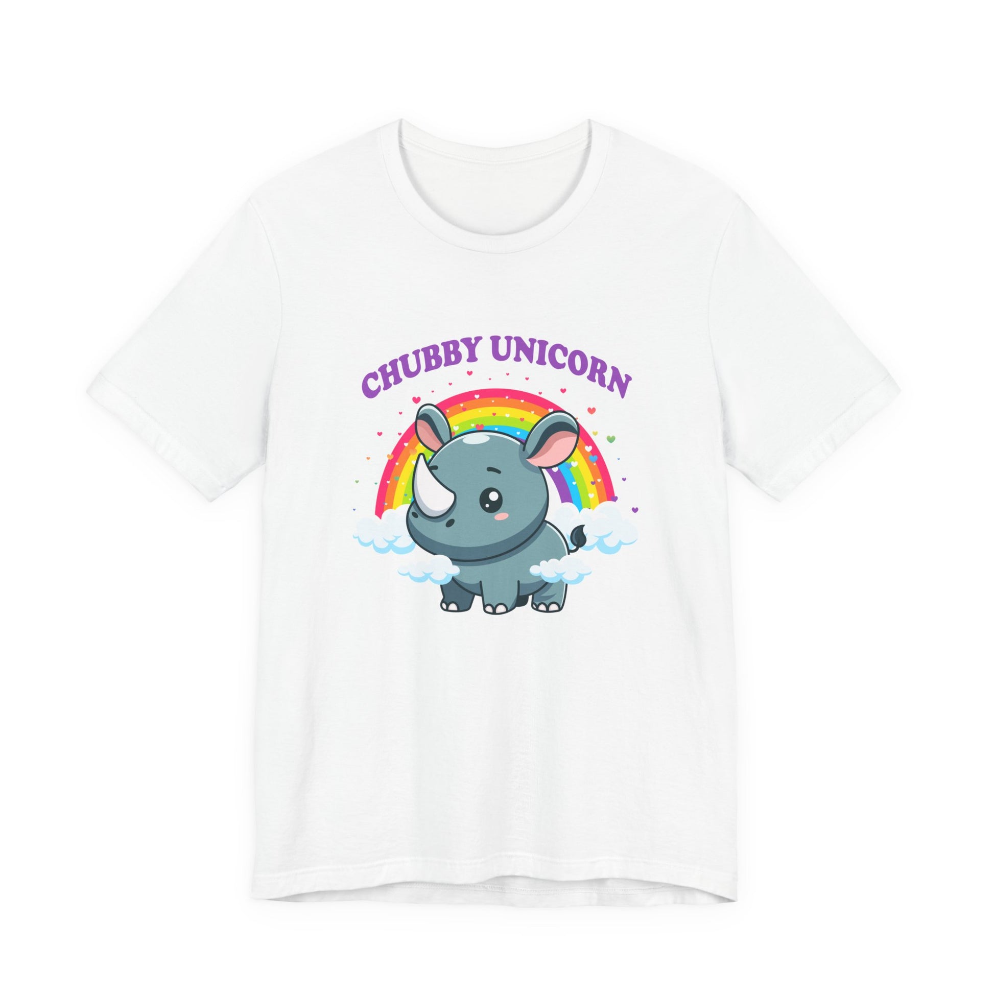 Celebrate the adorable and magical side of wildlife with this charming T-shirt featuring a chubby rhino playfully dubbed “Chubby Unicorn.” Set against a colorful rainbow and hearts backdrop, this design adds a splash of joy and cuteness to any casual outfit. Perfect for animal lovers, kids, or anyone who appreciates fun and imaginative graphics with a lovable twist.