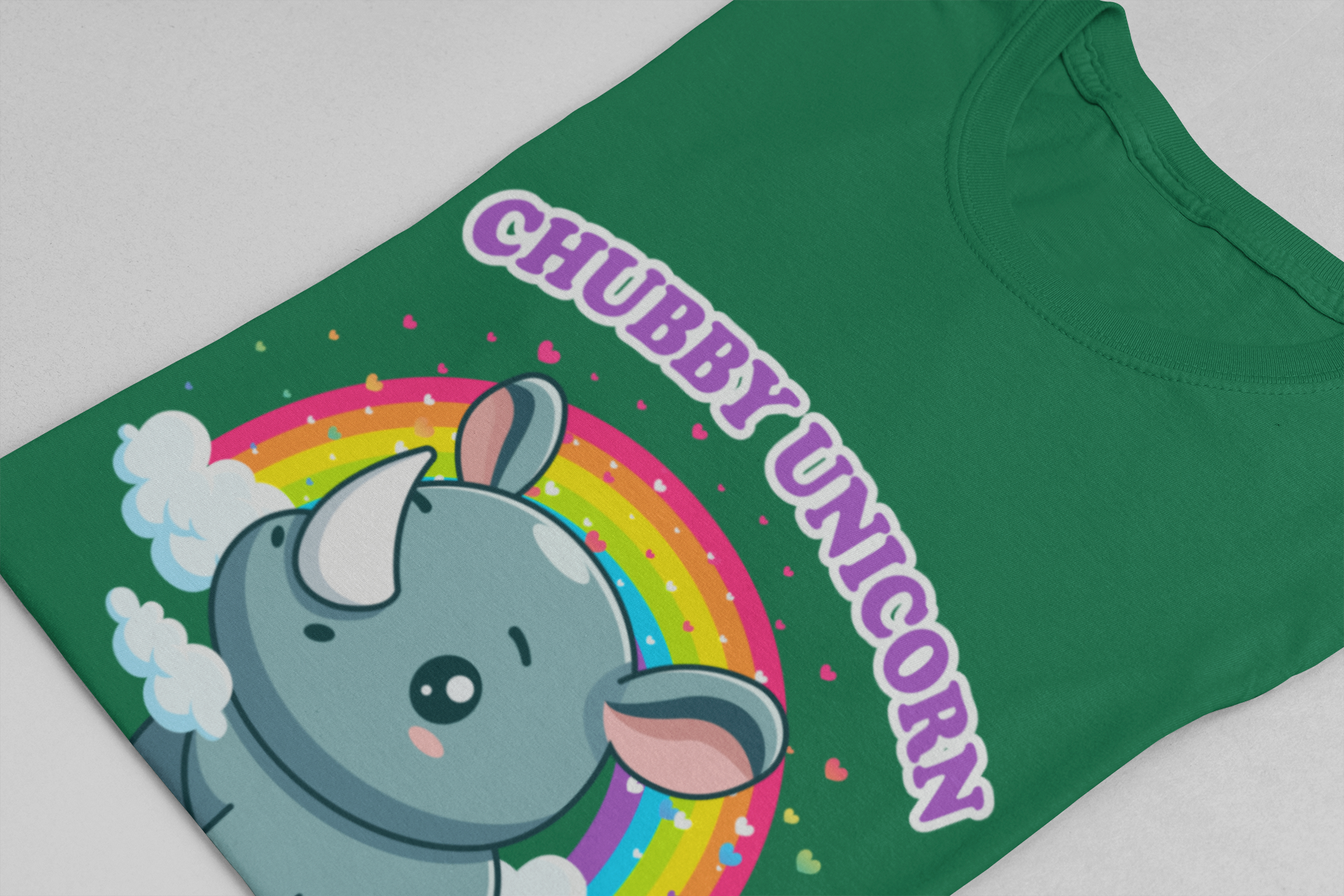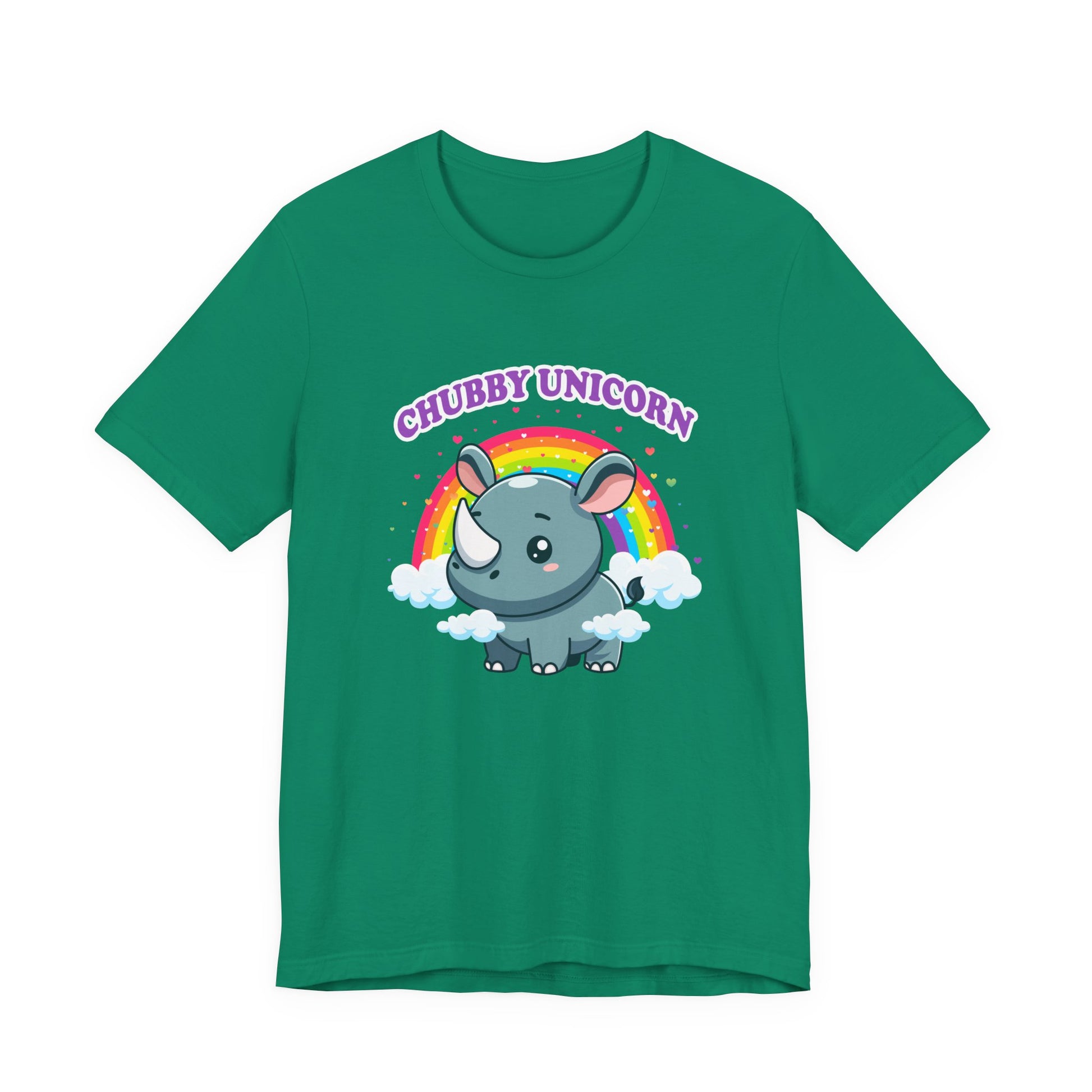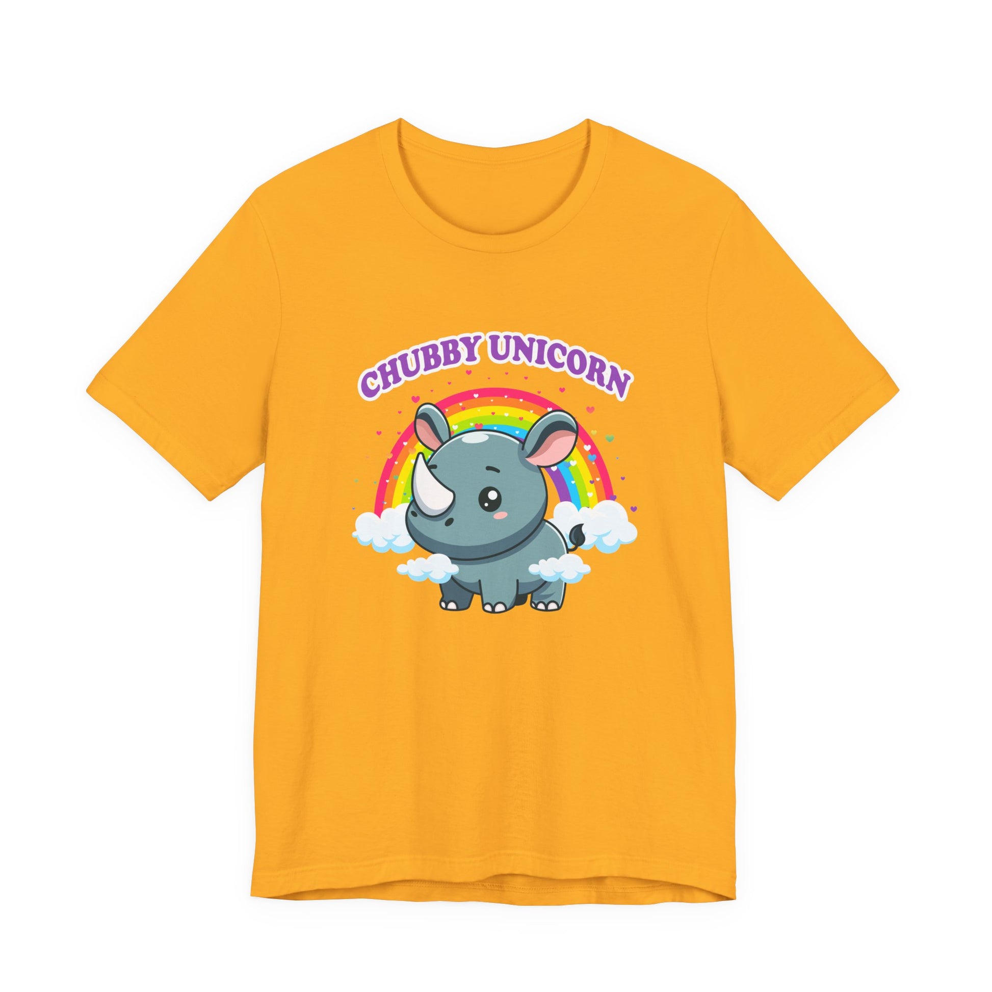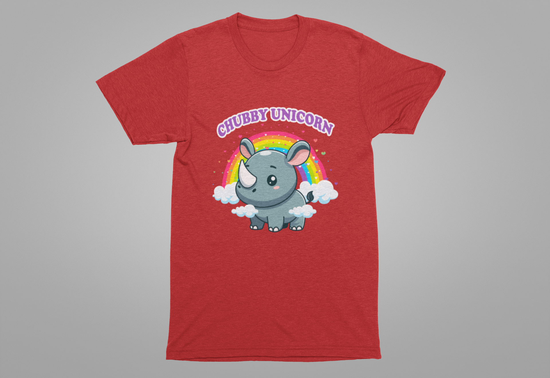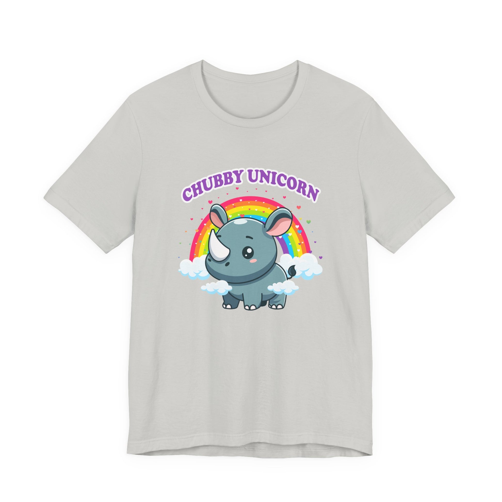 Celebrate the adorable and magical side of wildlife with this charming T-shirt featuring a chubby rhino playfully dubbed “Chubby Unicorn.” Set against a colorful rainbow and hearts backdrop, this design adds a splash of joy and cuteness to any casual outfit. Perfect for animal lovers, kids, or anyone who appreciates fun and imaginative graphics with a lovable twist.