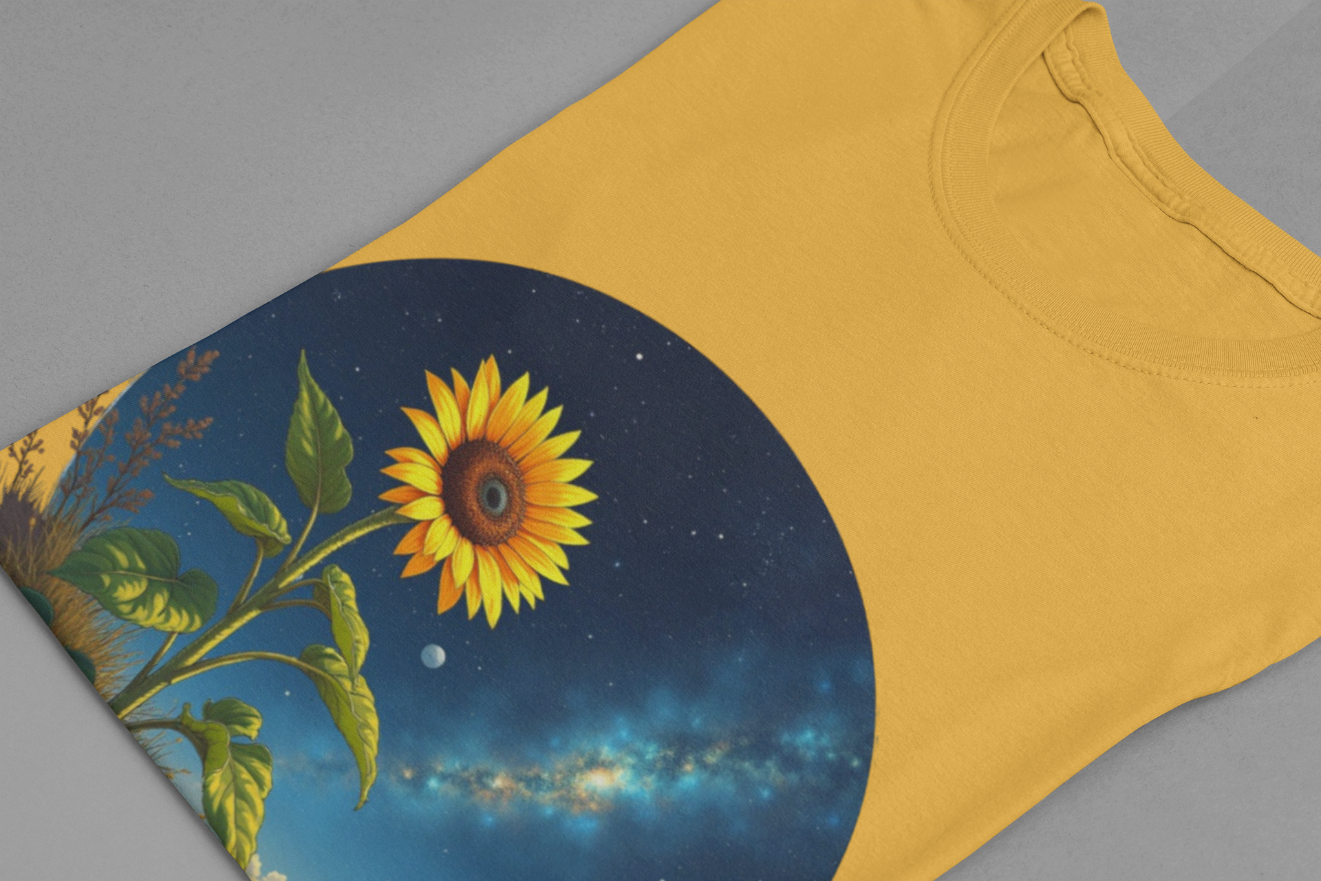 Celebrate the fusion of nature and cosmos with this stunning t-shirt featuring a cosmic bloom of a sunflower plant and flower. Set against a breathtaking backdrop of clouds, sky, and majestic mountains, the design captures a celestial reaction in the sky, evoking a sense of wonder and harmony between earth and universe. Perfect for nature lovers, stargazers, and anyone inspired by cosmic beauty, this shirt is crafted from soft, high-quality fabric for comfort and style that shines as brightly as the sunflower itself.