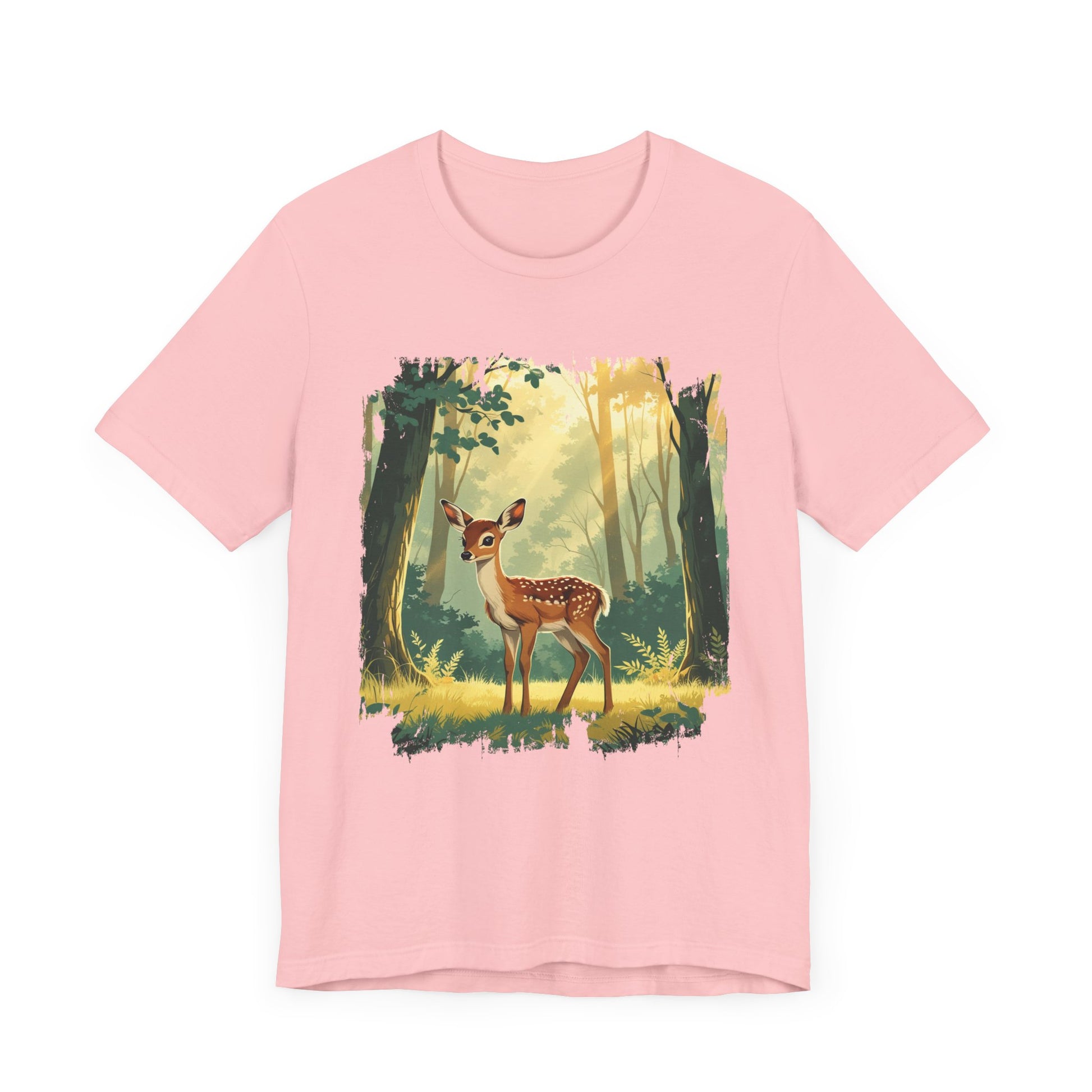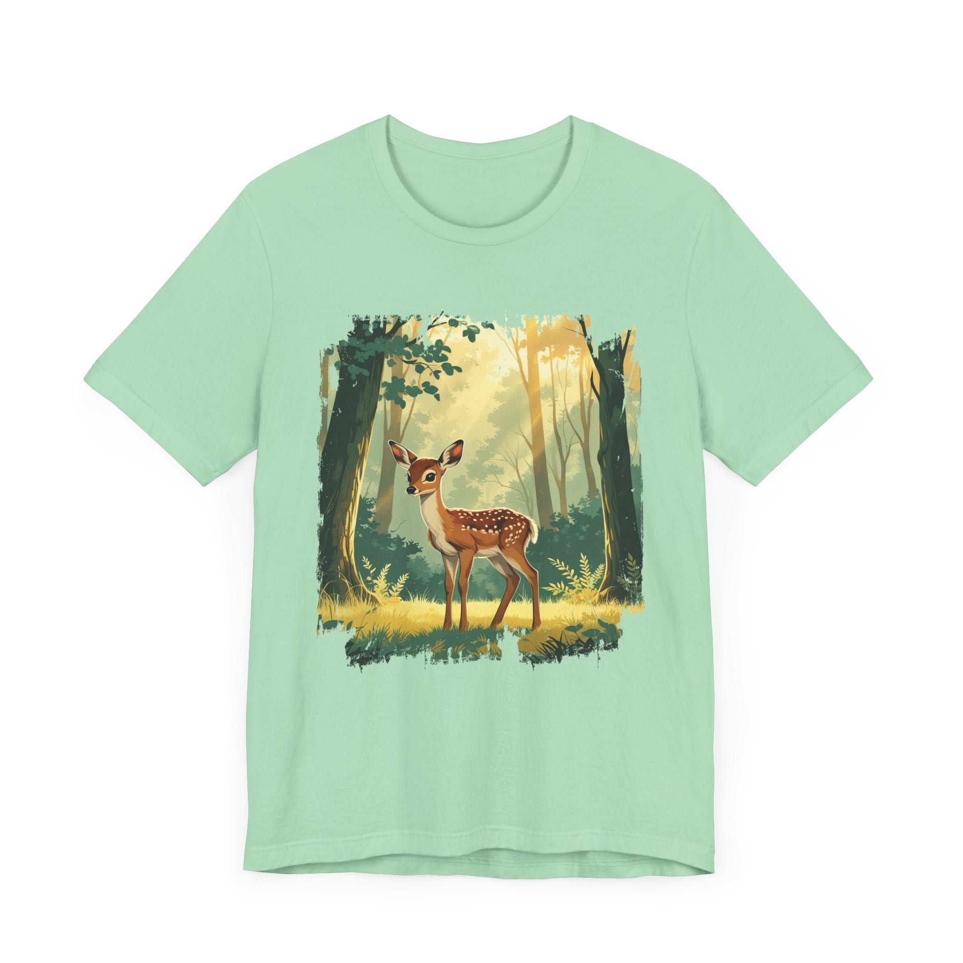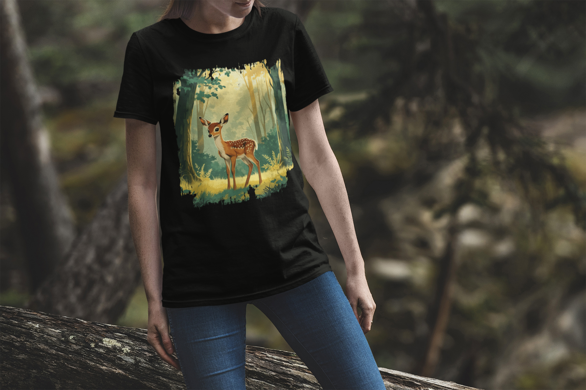 This charming t-shirt features a baby deer standing attentively in a serene forest, looking with great interest at something just beyond view. Sunlight filters softly through the trees in the background, creating a warm and peaceful woodland atmosphere. Perfect for nature lovers and wildlife enthusiasts, this design captures the innocence and beauty of forest life. Made from soft, high-quality fabric, it offers comfort and style for everyday wear or outdoor adventures