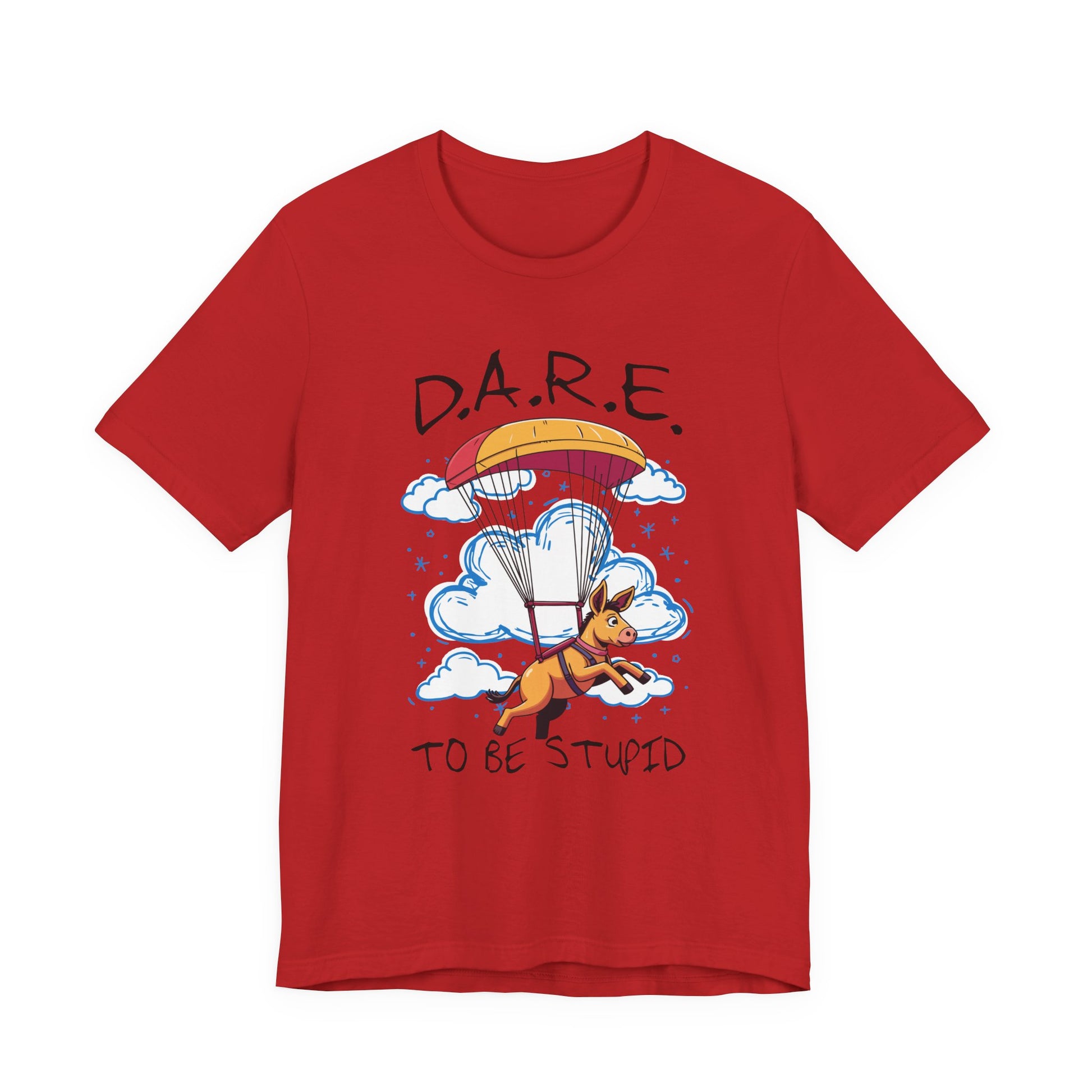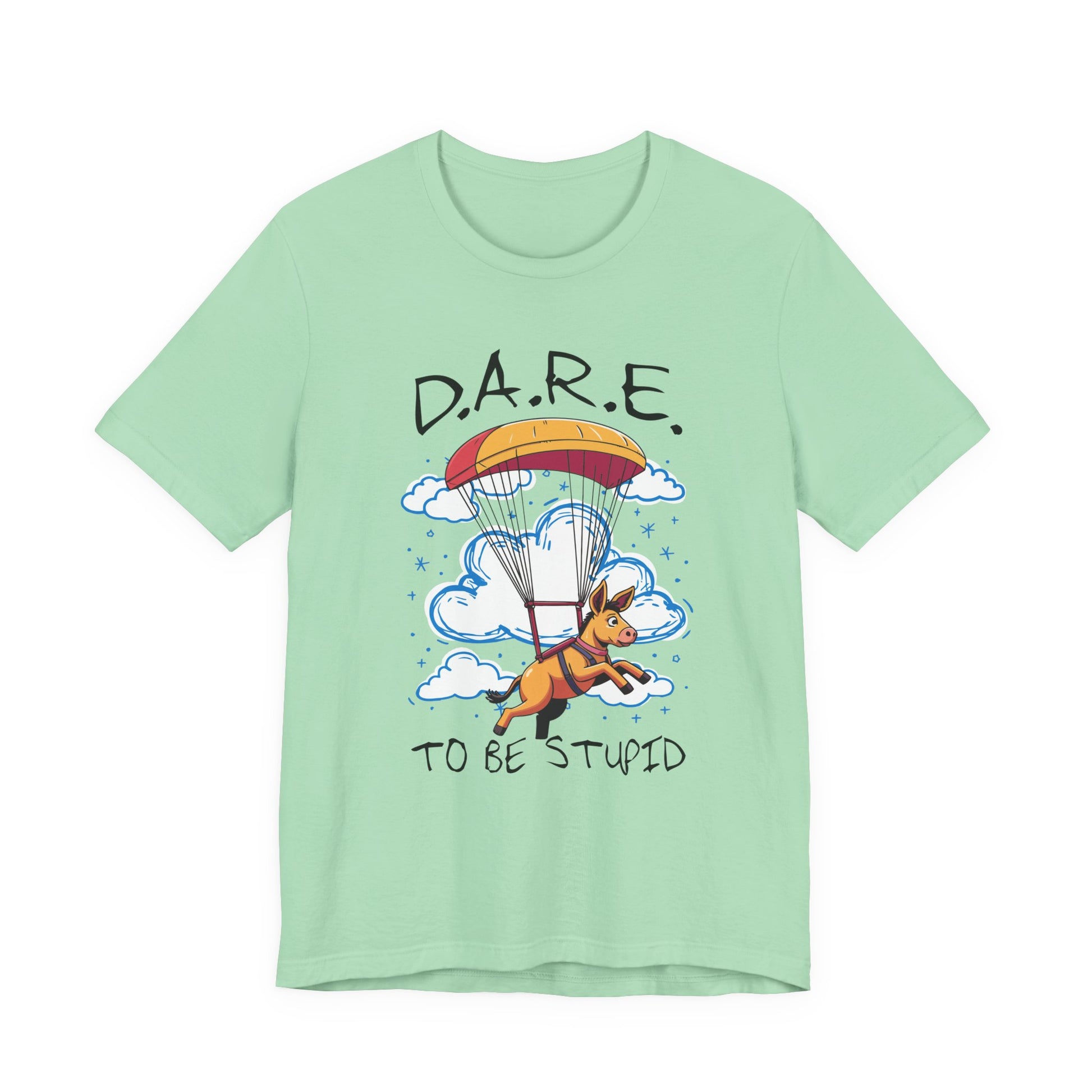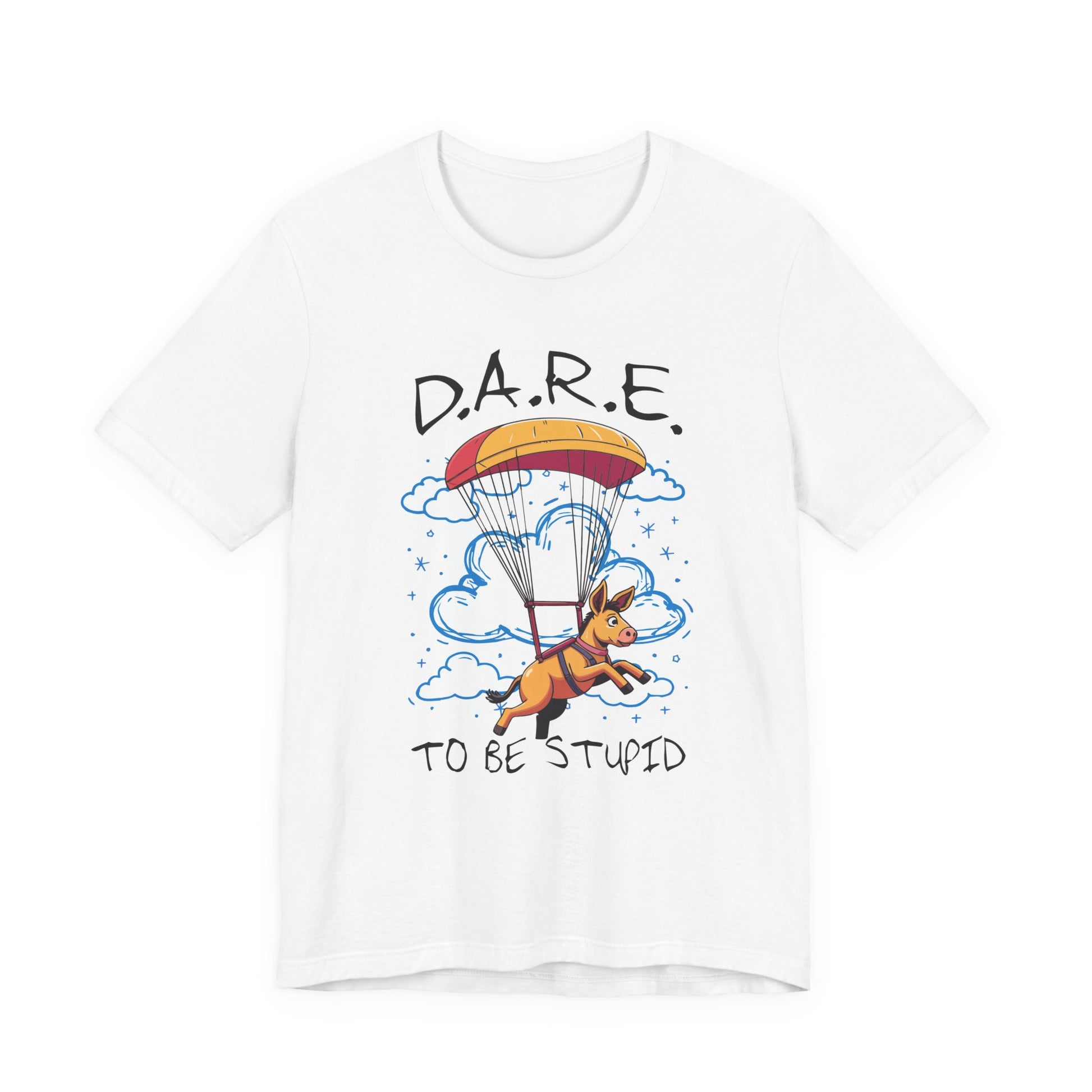 Embrace boldness and humor with this "Dare to Be Stupid" tshirt, featuring a stressed donkey parachuting through fluffy clouds against a bright sky. The playful design captures the spirit of taking risks and laughing at life’s unpredictable moments, making it perfect for those who appreciate quirky animal art and motivational fun. Great for casual wear, gifting, or anyone who dares to stand out with a unique sense of humor.
