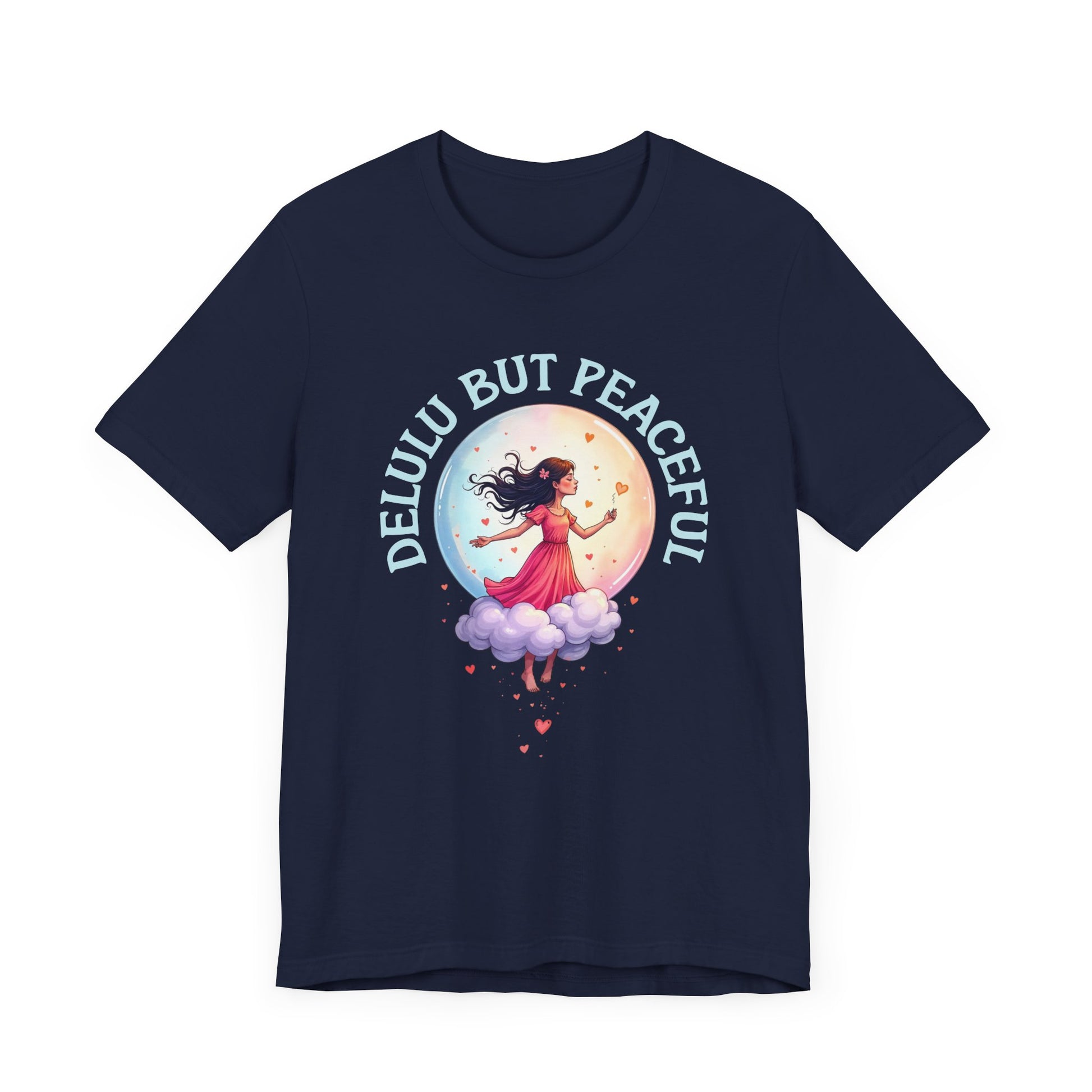 Celebrate the charming contradiction of being "Delulu But Peaceful" with this whimsical t-shirt featuring a girl floating serenely above clouds, framed by a huge full moon and surrounded by delicate heart emotions. Inspired by the playful slang "delulu," which means delightfully delusional or blissfully unrealistic, this design captures the joy of embracing dreamy fantasies while maintaining inner calm. Perfect for those who love to balance imagination and tranquility, this tee is made from soft, comfortable fabric ideal for everyday wear or as a thoughtful gift for free spirits and dreamers alike.