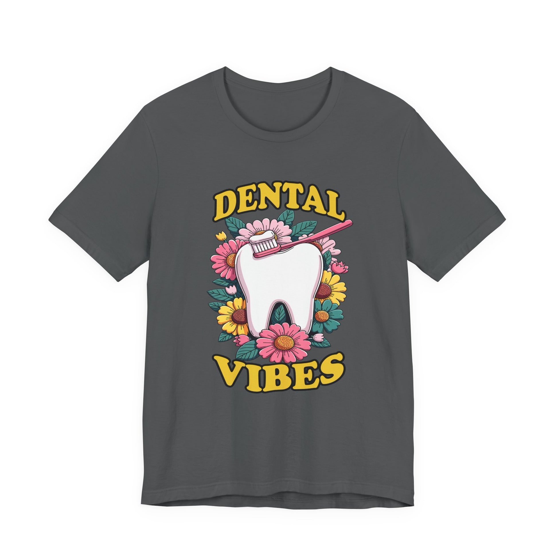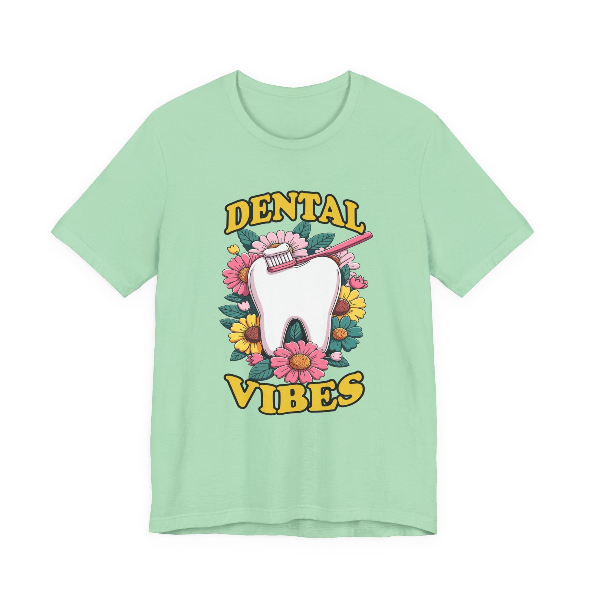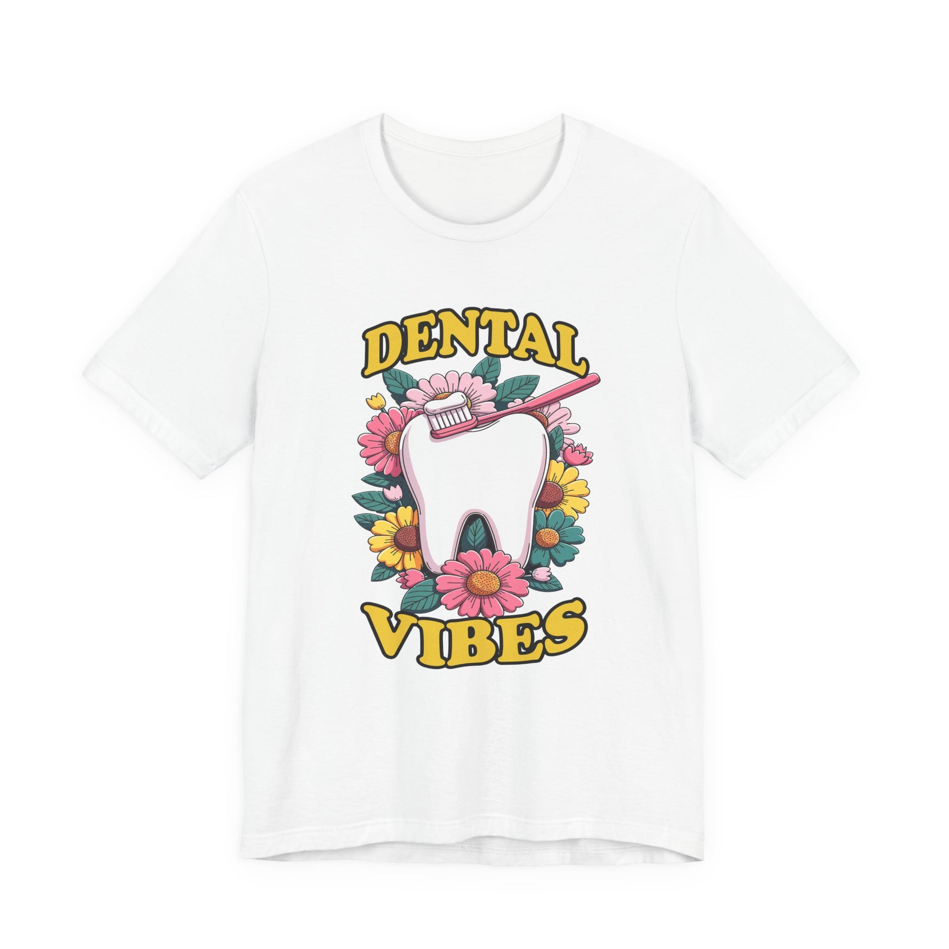 Embrace the spirit of oral health with this stylish t shirt featuring a large tooth in the center, topped by a brush with paste and beautifully surrounded by flowers. The design includes the uplifting phrase "Dental Vibes," making it perfect for dental professionals, students, or anyone who loves to promote healthy smiles with positivity. Comfortable and visually appealing, this tee is ideal for dental office teams, hygiene events, or everyday wear to spread good dental vibes and cheer.