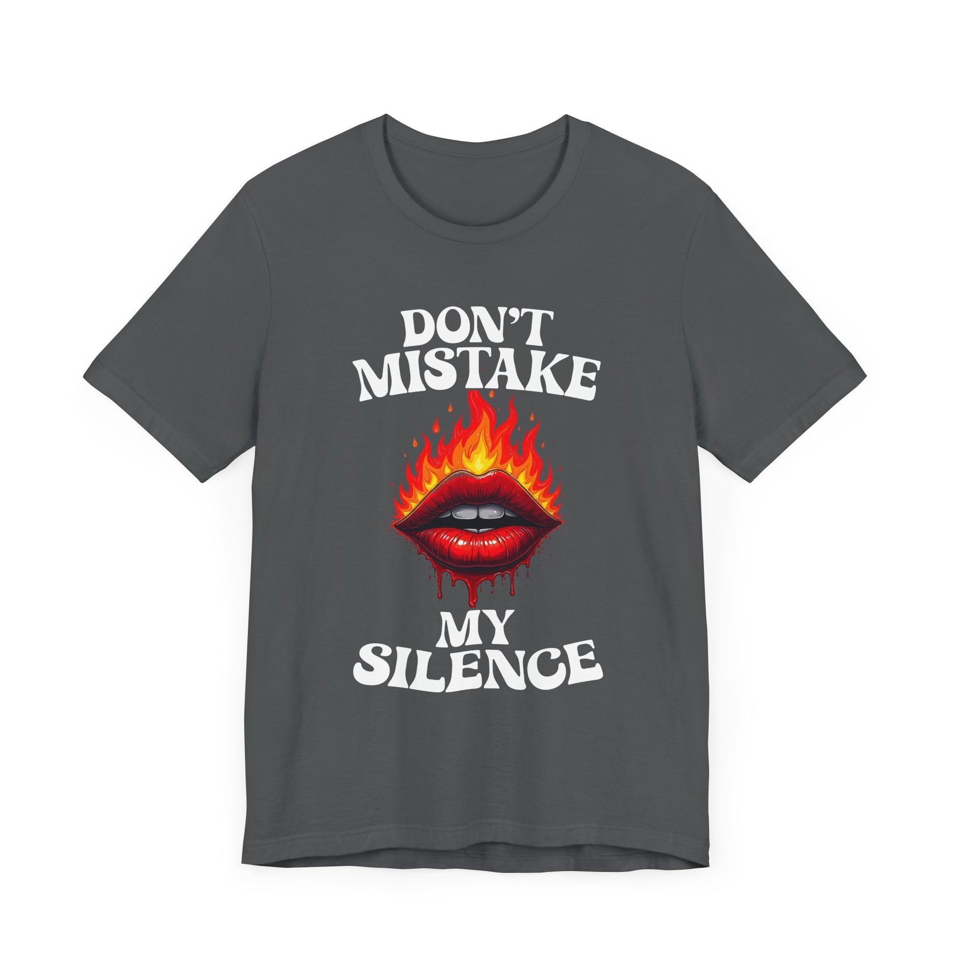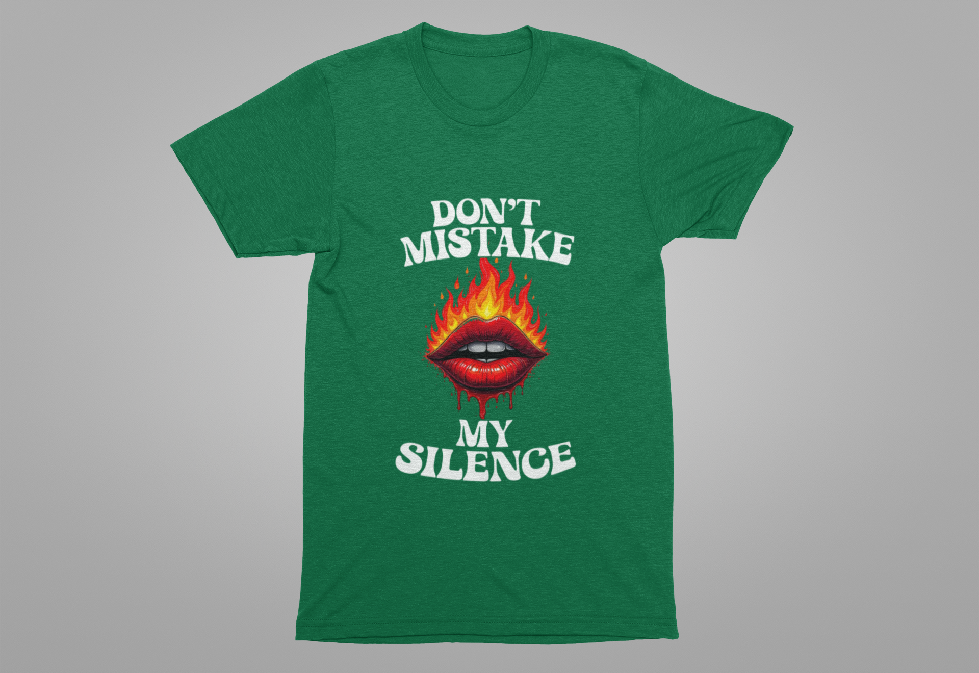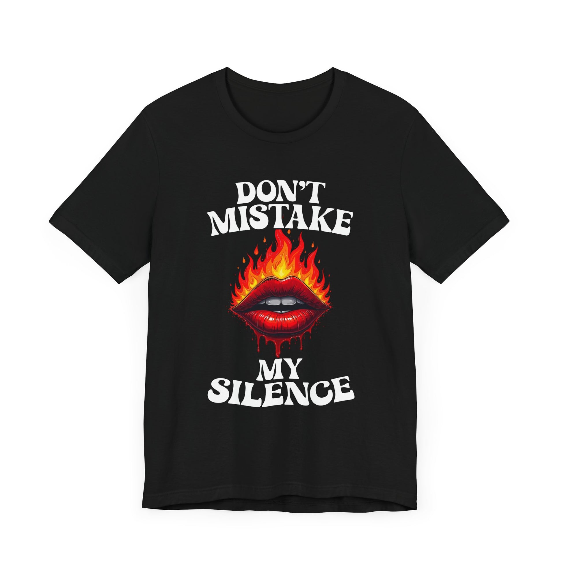 Make a powerful statement with this "Don’t Mistake My Silence" t-shirt, featuring a bold graphic of a mouth with a bleeding bottom lip and an upper lip engulfed in flames. This striking design symbolizes the intensity and emotion that can lie beneath a quiet exterior, perfect for those who want their style to speak volumes. Crafted from soft, high-quality fabric, this tee is ideal for anyone who values self-expression, resilience, and depth. Wear it as a reminder that silence can hold both pain and fiery strength—an unforgettable piece for your wardrobe or as a meaningful gift.