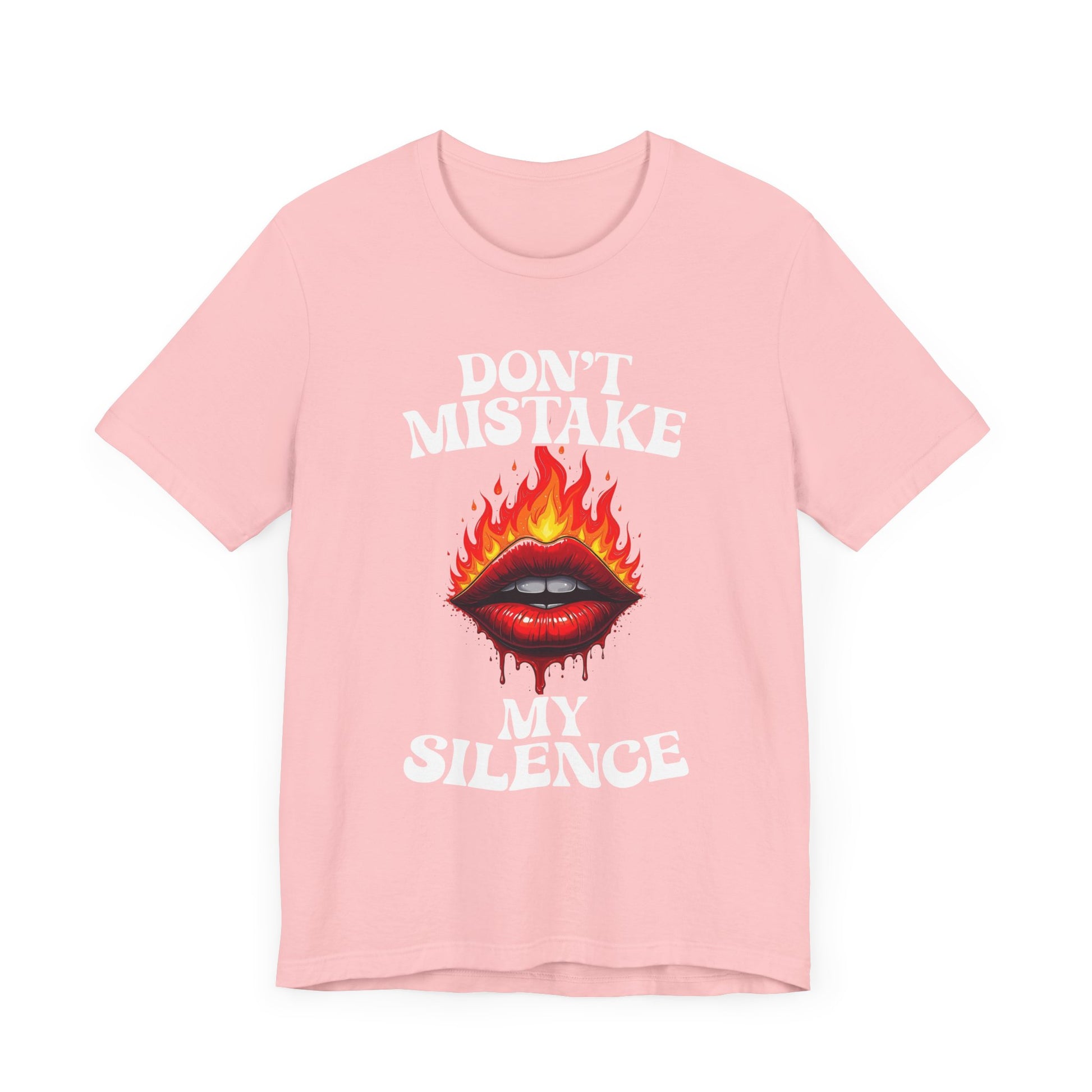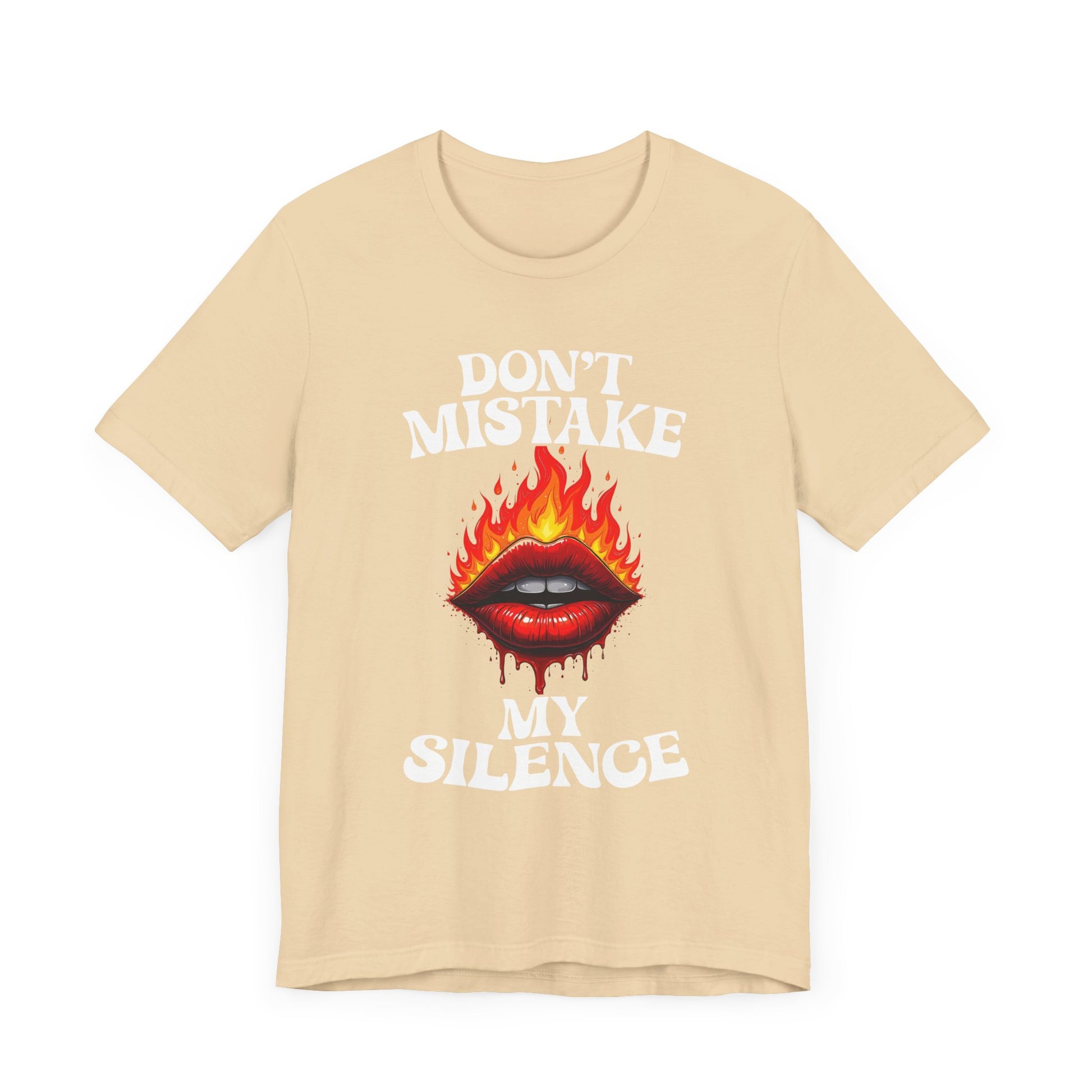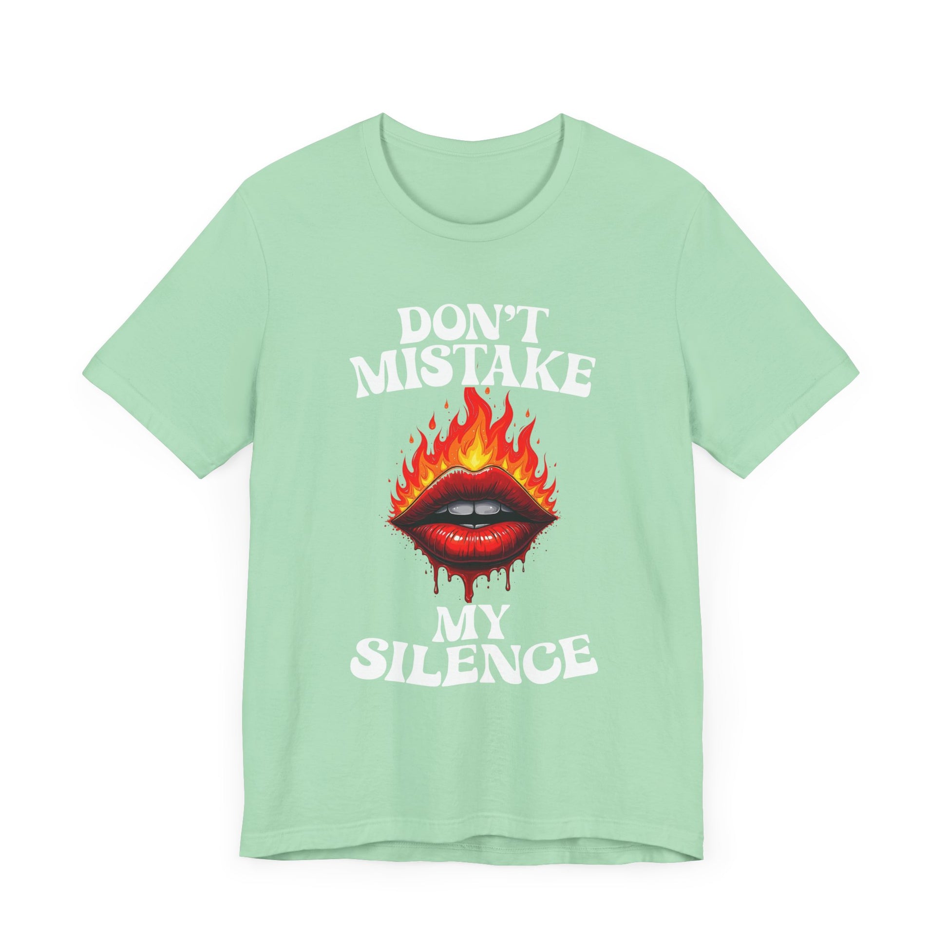 Make a powerful statement with this "Don’t Mistake My Silence" t-shirt, featuring a bold graphic of a mouth with a bleeding bottom lip and an upper lip engulfed in flames. This striking design symbolizes the intensity and emotion that can lie beneath a quiet exterior, perfect for those who want their style to speak volumes. Crafted from soft, high-quality fabric, this tee is ideal for anyone who values self-expression, resilience, and depth. Wear it as a reminder that silence can hold both pain and fiery strength—an unforgettable piece for your wardrobe or as a meaningful gift.