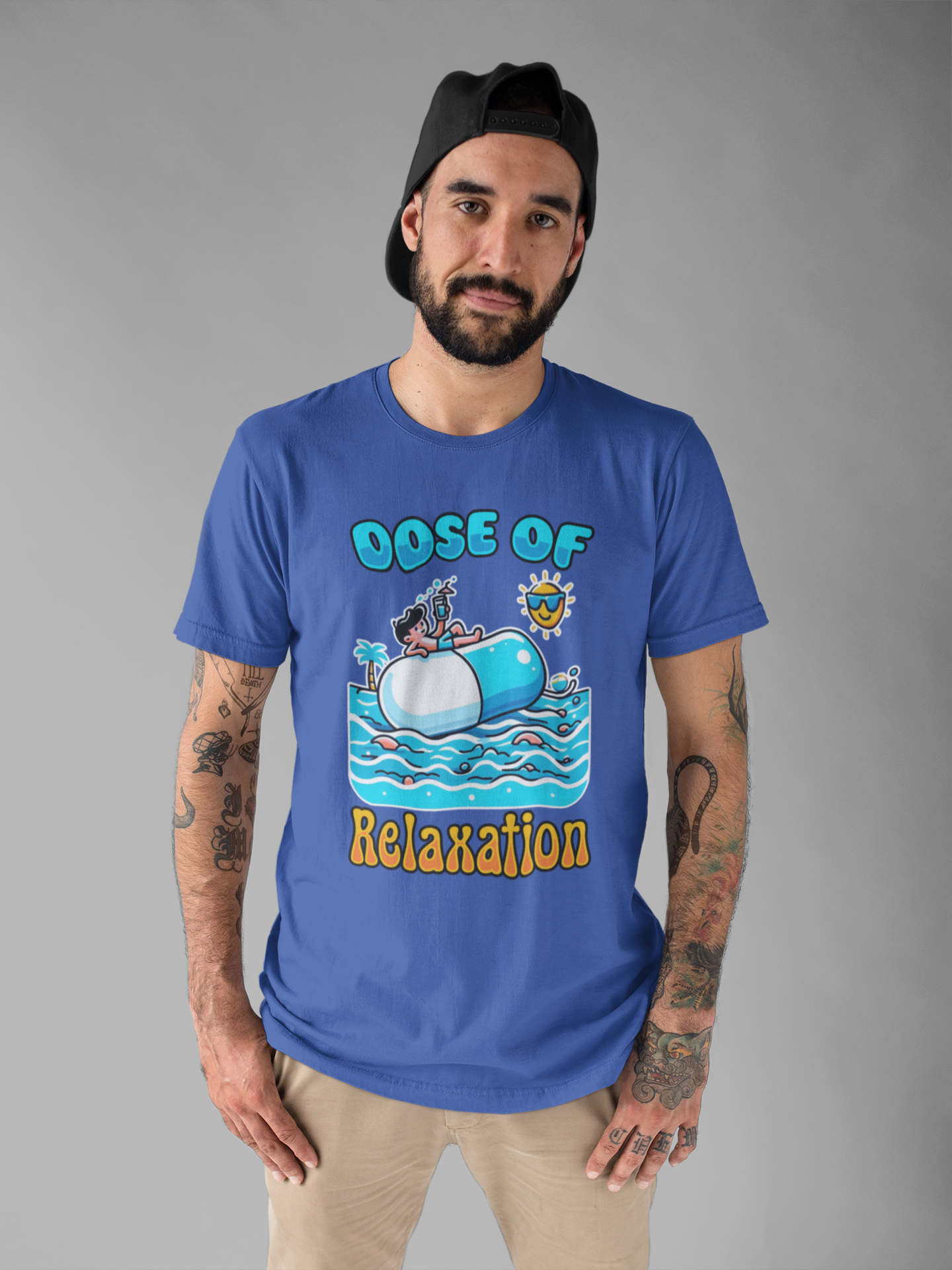 Embrace calm vibes with this "Dose of Relaxation" t-shirt featuring a charming graphic of a boy sitting leisurely on a large pill floating on water, holding a drink. Above him shines a small smiling sun wearing sunglasses, while a tiny palm tree adds a tropical touch in the corner. This playful design perfectly captures the essence of unwinding and taking life easy, blending wellness and whimsy. Made from soft, comfortable fabric, it’s ideal for casual wear, self-care enthusiasts, or as a thoughtful gift to remind someone to relax and recharge