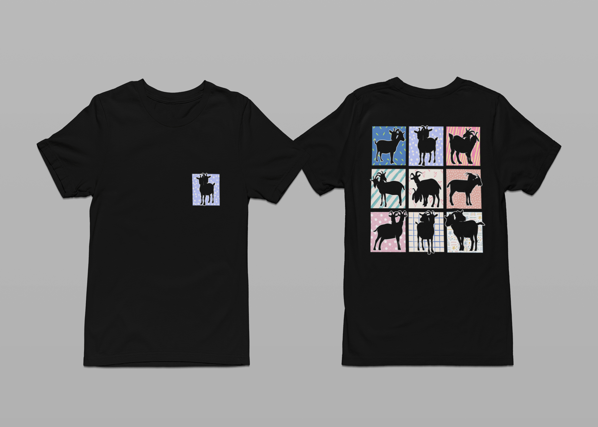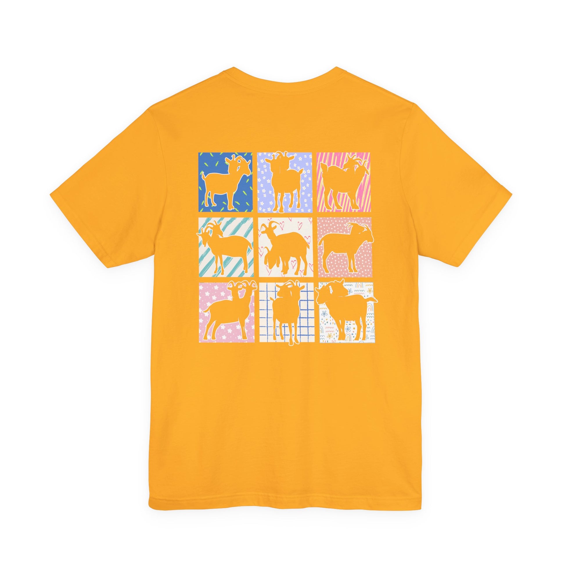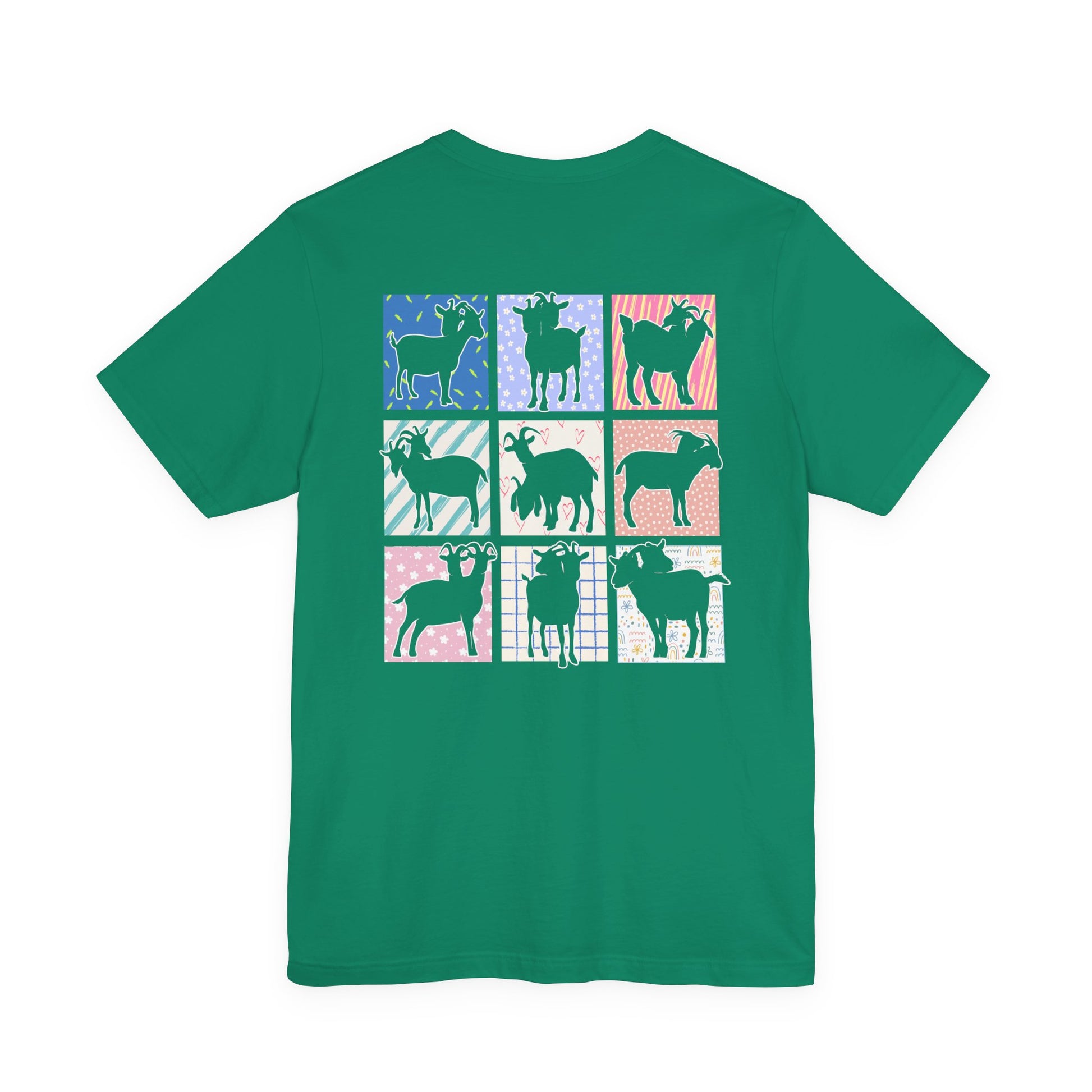 Explore the unique artistry with this striking t-shirt featuring nine double-headed goat outlines, each shown from different angles in individual dedicated boxes with vibrant abstract backgrounds. This design blends geometric precision with colorful modern art, making it perfect for lovers of distinctive animal graphics, abstract art, and edgy fashion. Crafted from soft, breathable fabric, this tee is a bold statement piece for casual wear or art-inspired wardrobes.