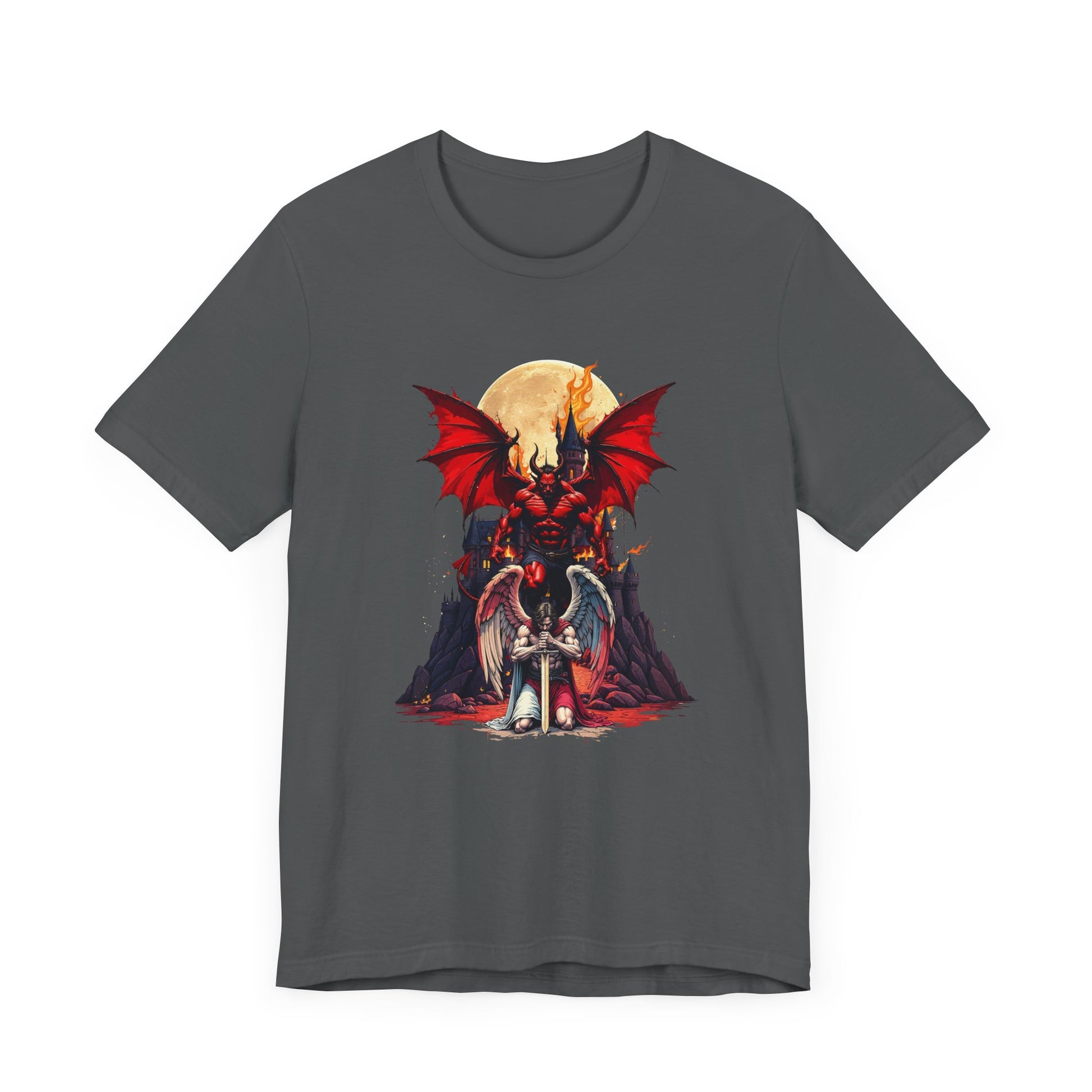 Step into the realm of dark fantasy with this dramatic t-shirt featuring a formidable Beast, complete with bat wings and horns, floating ominously behind and above a kneeling fighter with wings. The fallen warrior, head bowed and sword planted vertically from chest to knee, creates a powerful scene of supernatural dominance and defeat. Perfect for fans of gothic horror, epic battles, and striking fantasy art, this tee stands out with its intense imagery and storytelling. Crafted from soft, durable fabric, it’s an ideal choice for horror enthusiasts, gamers, and anyone drawn to the thrilling edge of the supernatural.