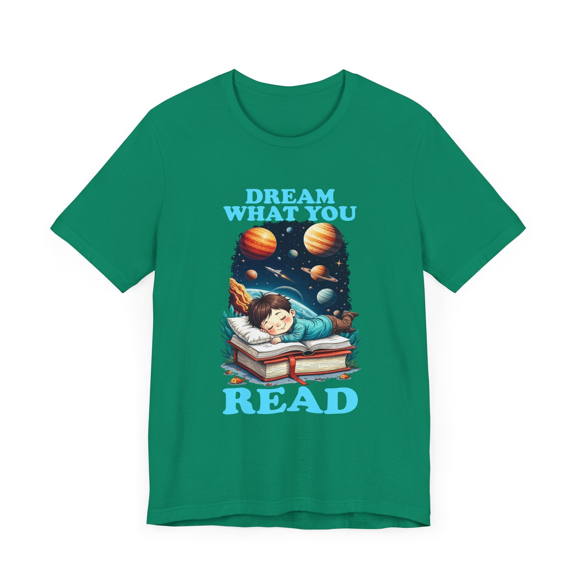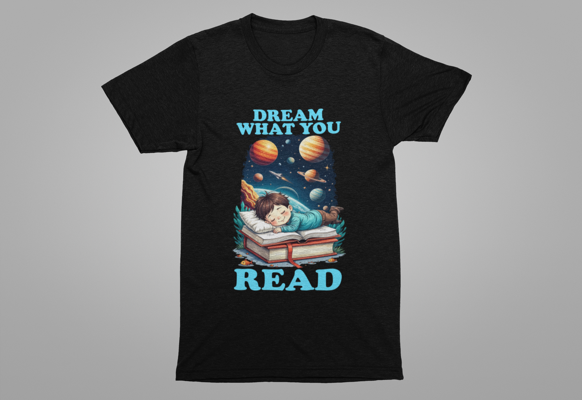 Inspire a love for reading and imagination with this “Dream What You Read” t-shirt. Featuring a whimsical design of a child sleeping on a stack of books, dreaming of planets, stars, and outer space adventures, this tee celebrates the magic of stories and the endless possibilities they unlock. Perfect for book lovers, young readers, teachers, and anyone who believes in the power of imagination, this shirt blends vibrant space art with a motivational message.