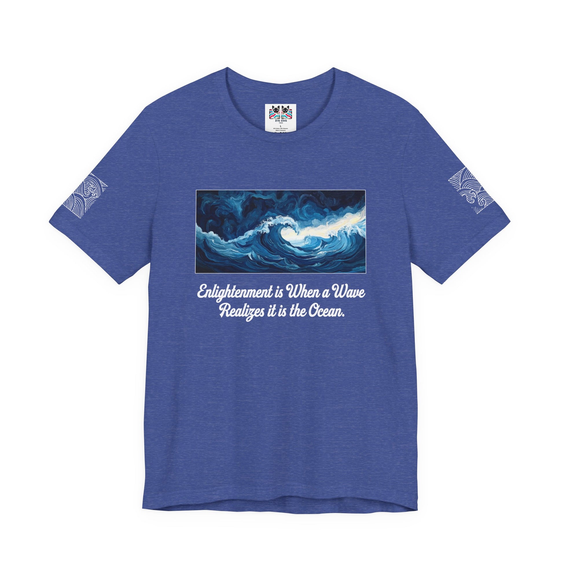 Discover profound wisdom with this beautiful "Enlightenment is When a Wave Realizes it is the Ocean" t-shirt featuring stunning deep blue ocean waves in an artistic, swirling composition. This powerful metaphor speaks to spiritual awakening, unity consciousness, and the realization that we are not separate individuals but part of a greater whole.