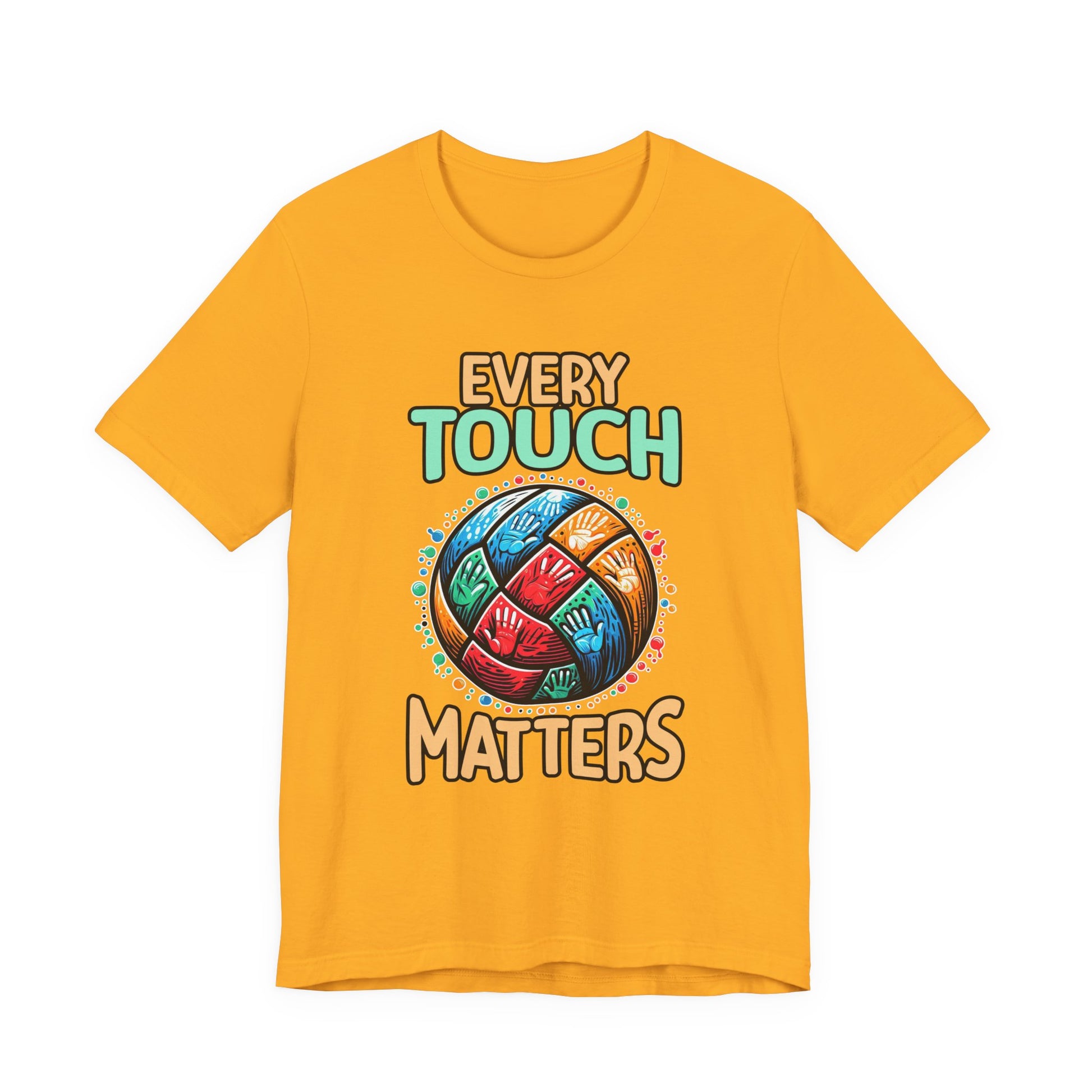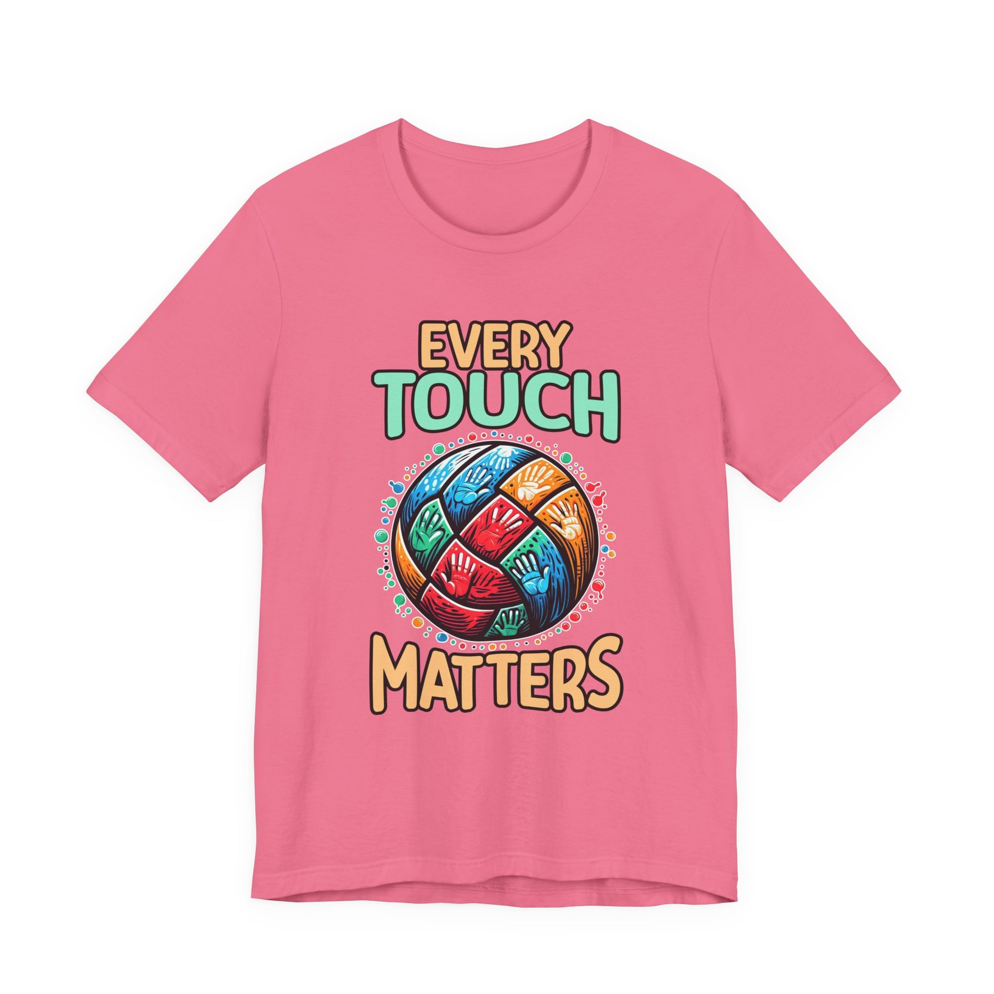 Celebrate the spirit of teamwork and the impact of every play with this "Every Touch Matters" t-shirt. The design features a large, vibrant volleyball at the center, covered in colorful handprints to symbolize unity, effort, and the collective energy of the team. Perfect for volleyball players, fans, coaches, and supporters, this tee highlights how every contribution counts on and off the court. Crafted from soft, comfortable fabric, it's ideal for practices, tournaments, or everyday wear—showing your love for the game and the importance of every touch.