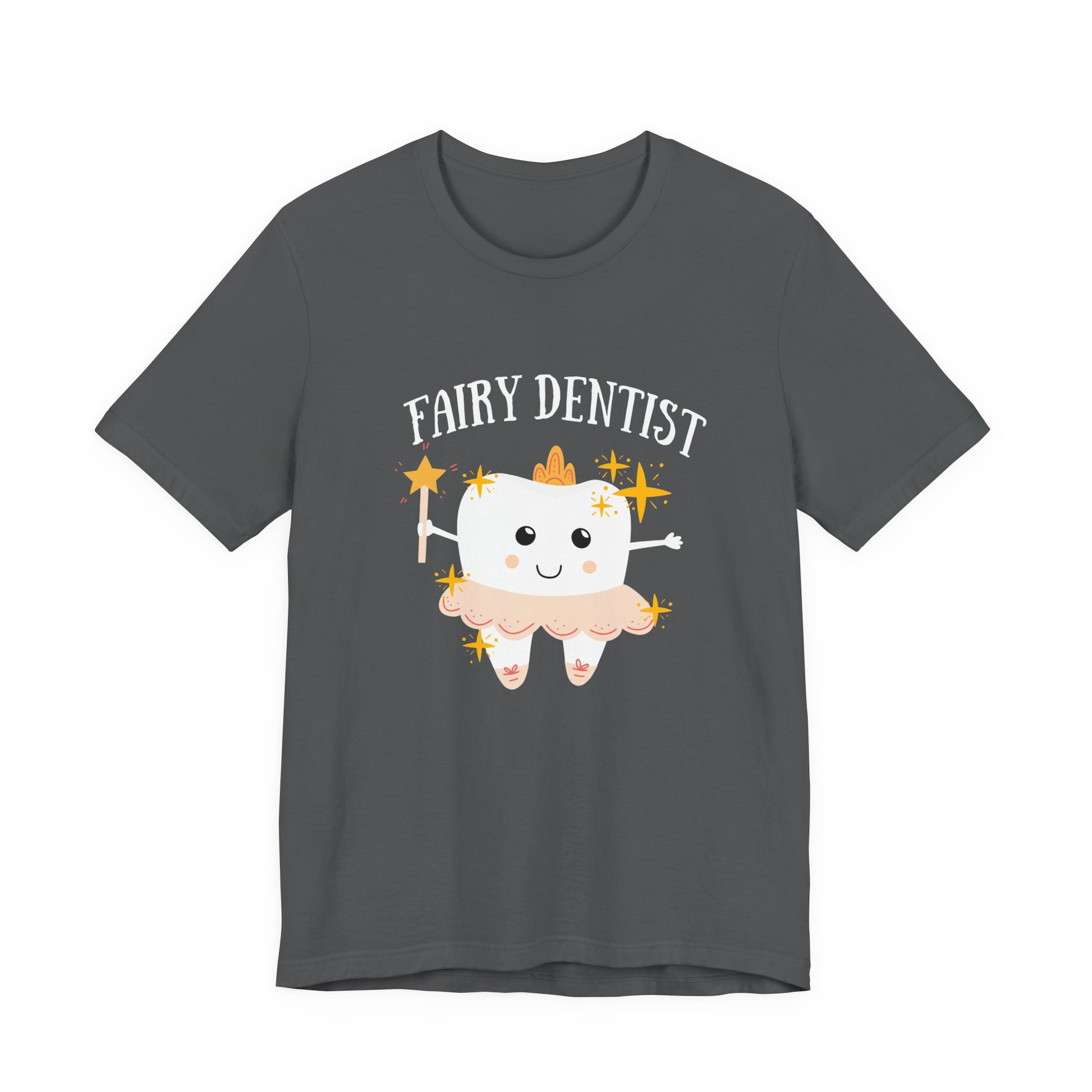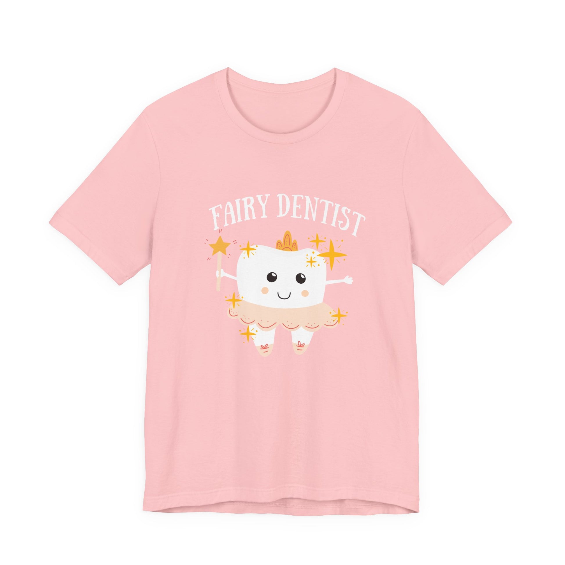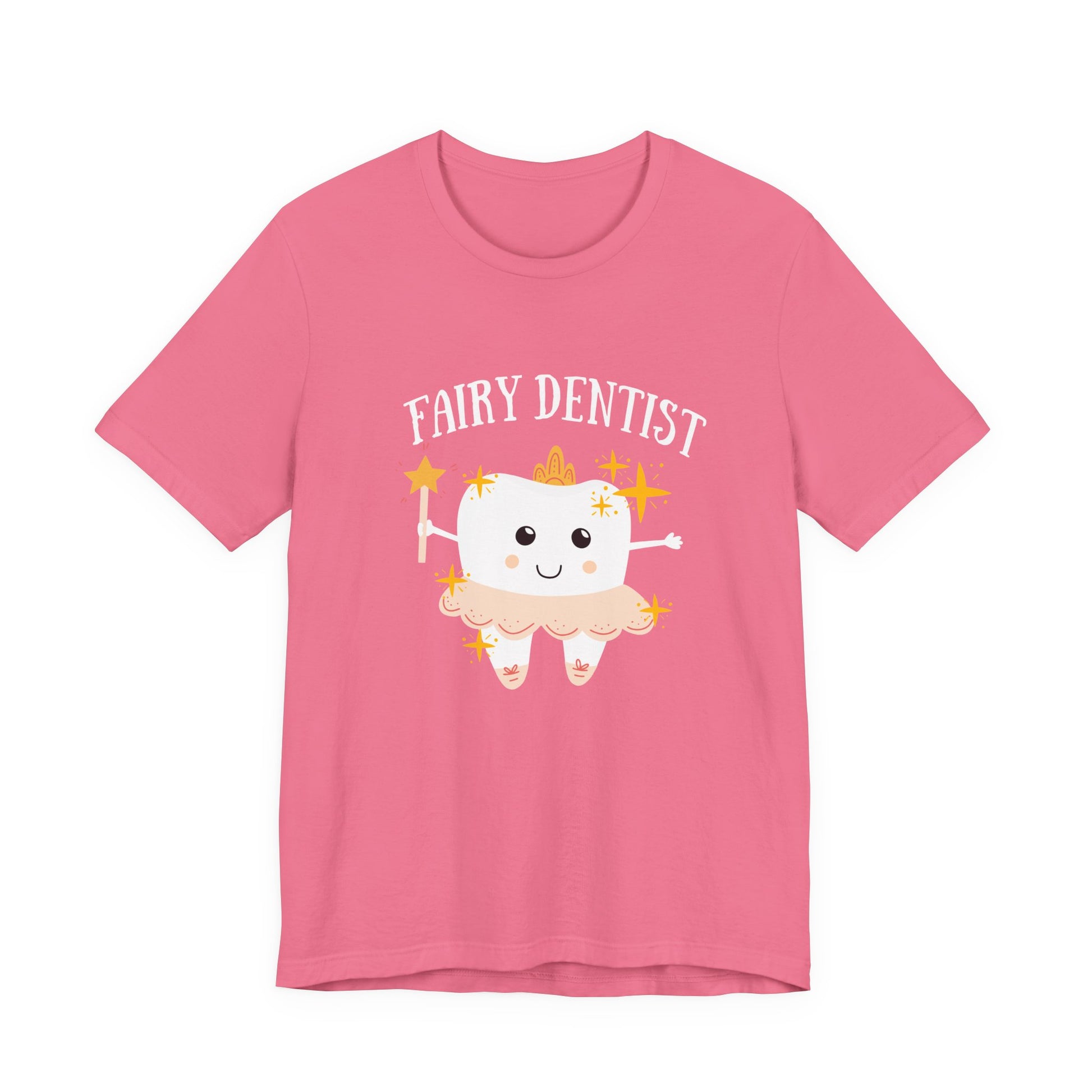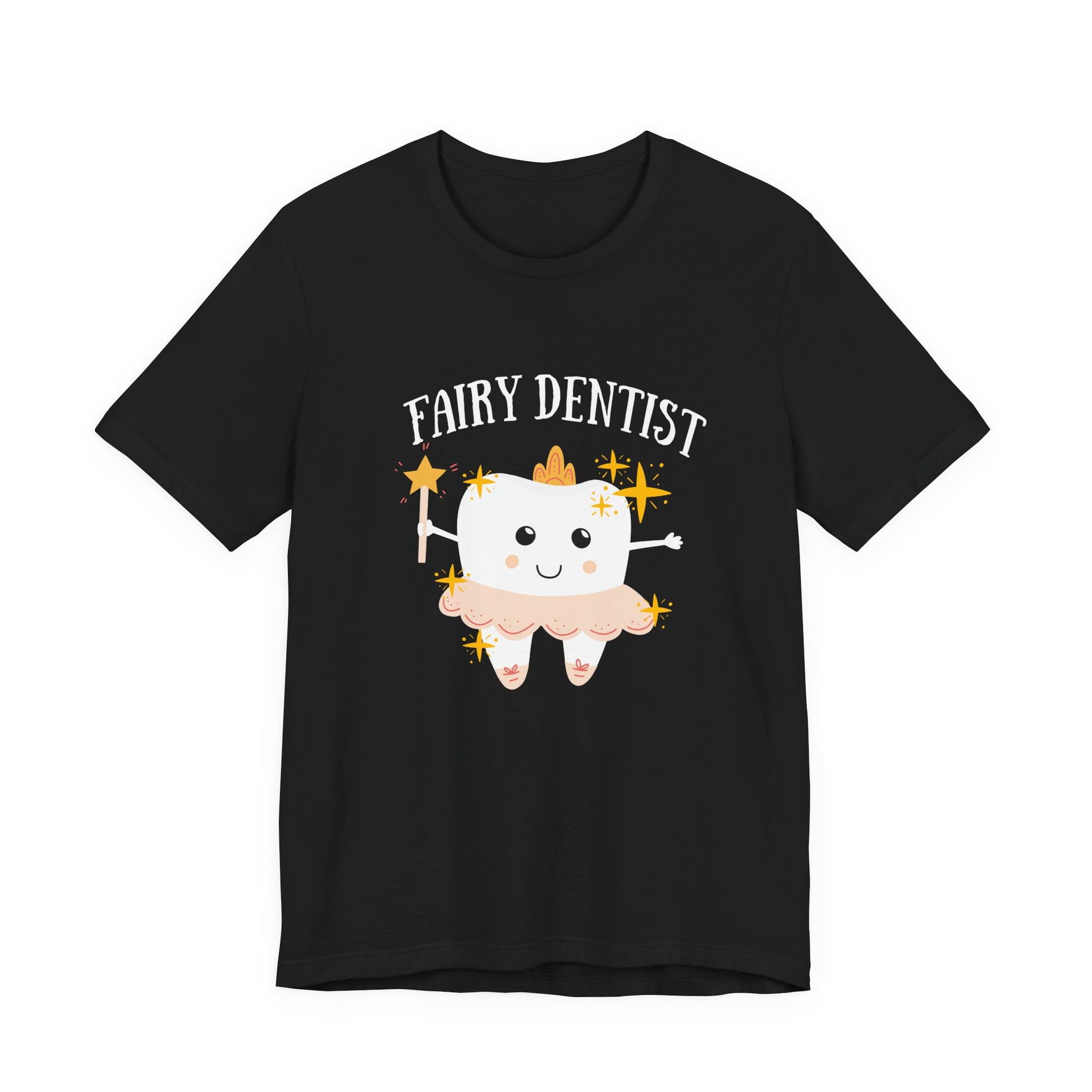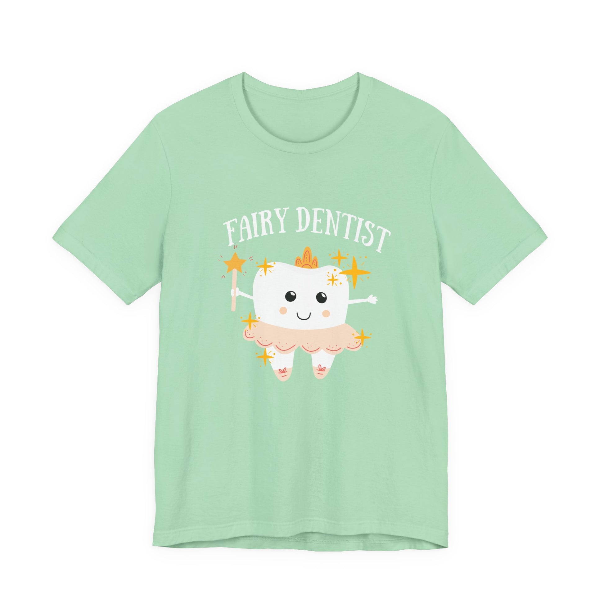 Brighten any day with this whimsical t shirt featuring a large smiling tooth at the center, dressed as a dental fairy and holding a magical wand. The cheerful tooth character radiates positivity, blending the spirit of dental care with fairy charm. The design is complemented by the text "Fairy Dentist," making it perfect for dental professionals, students, or anyone who loves a playful twist on oral health. Comfortable and eye catching, this tee is ideal for dental events, office teams, or as a delightful everyday reminder that dental care can be magical.