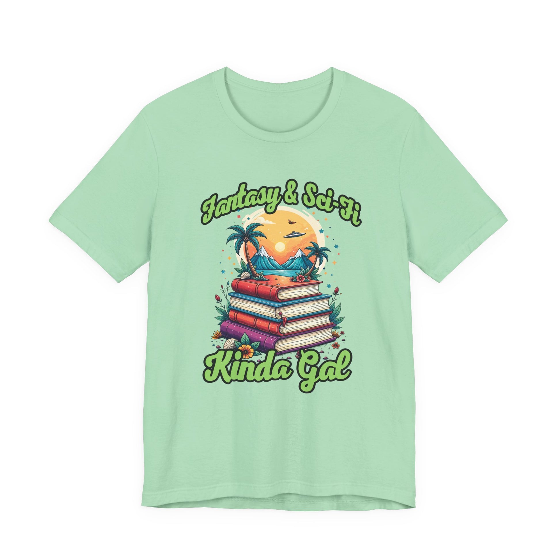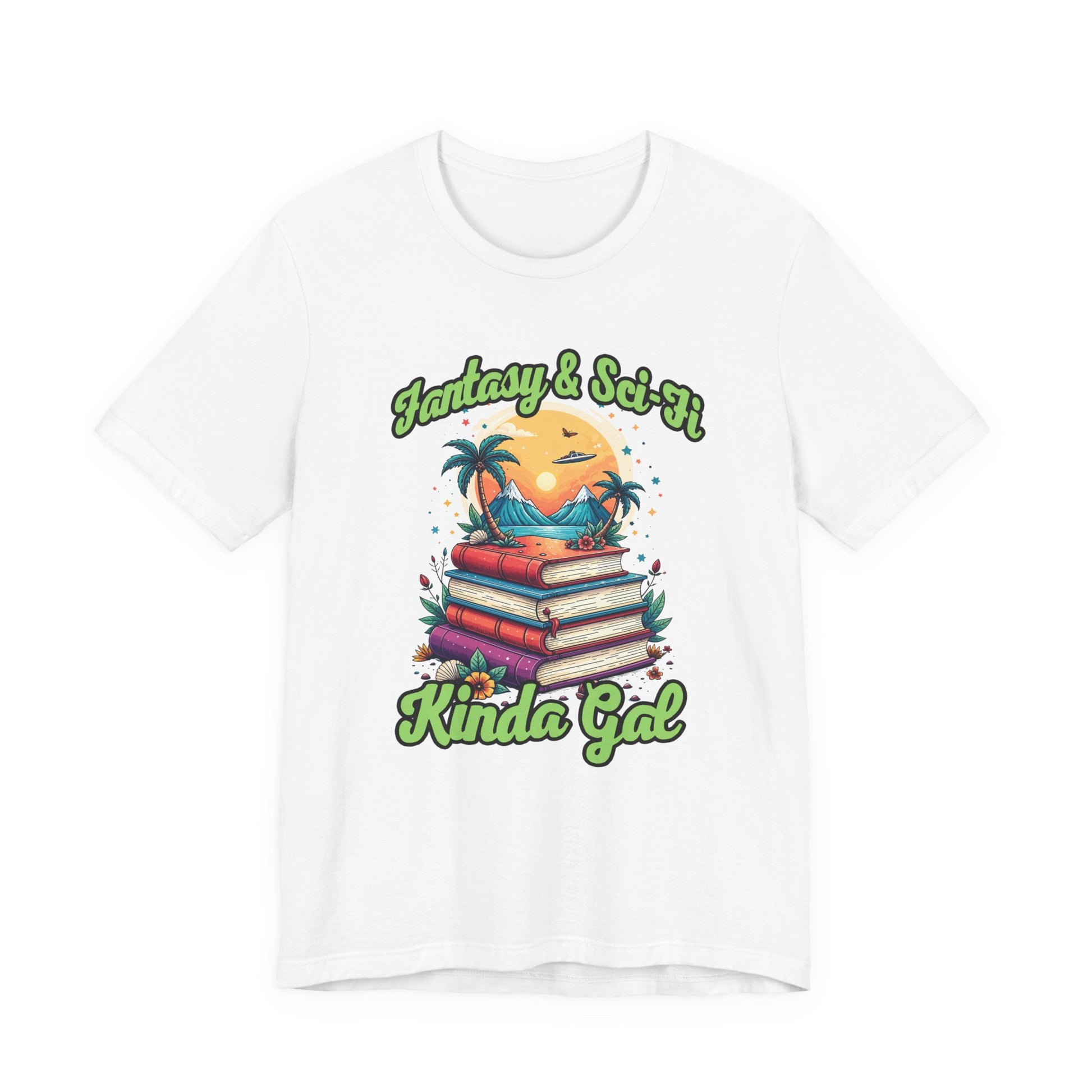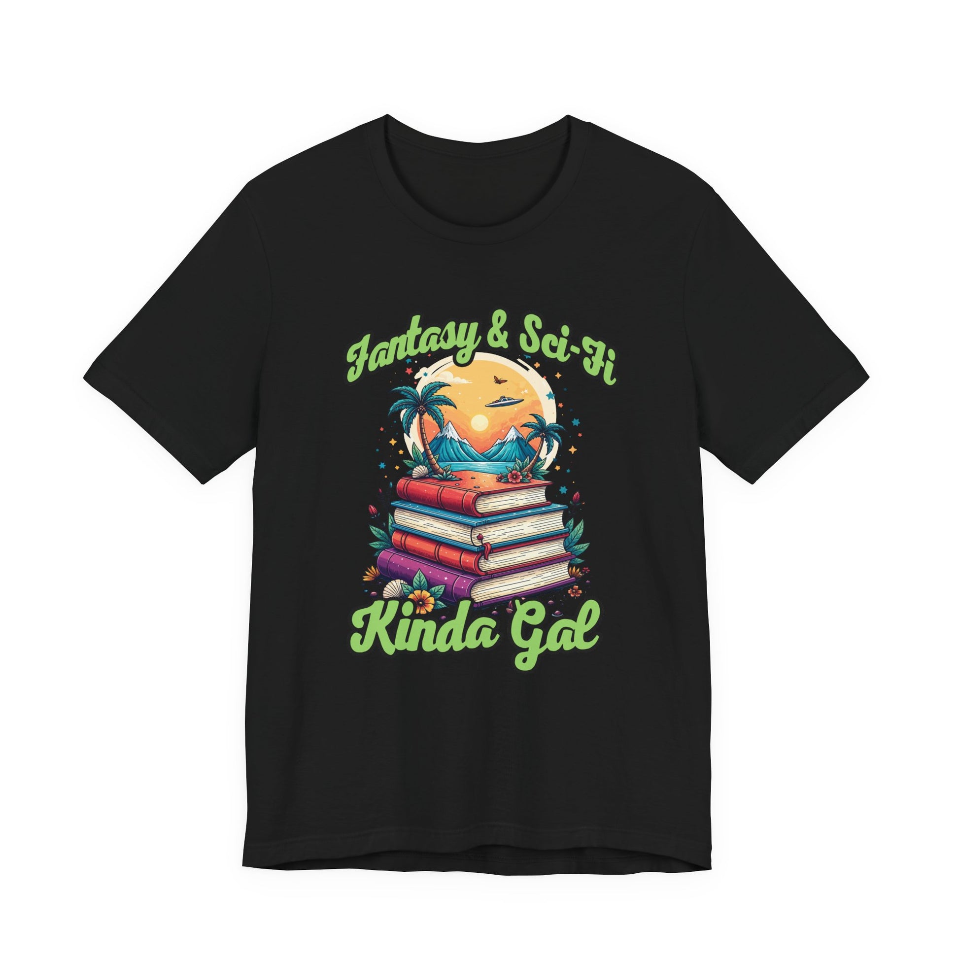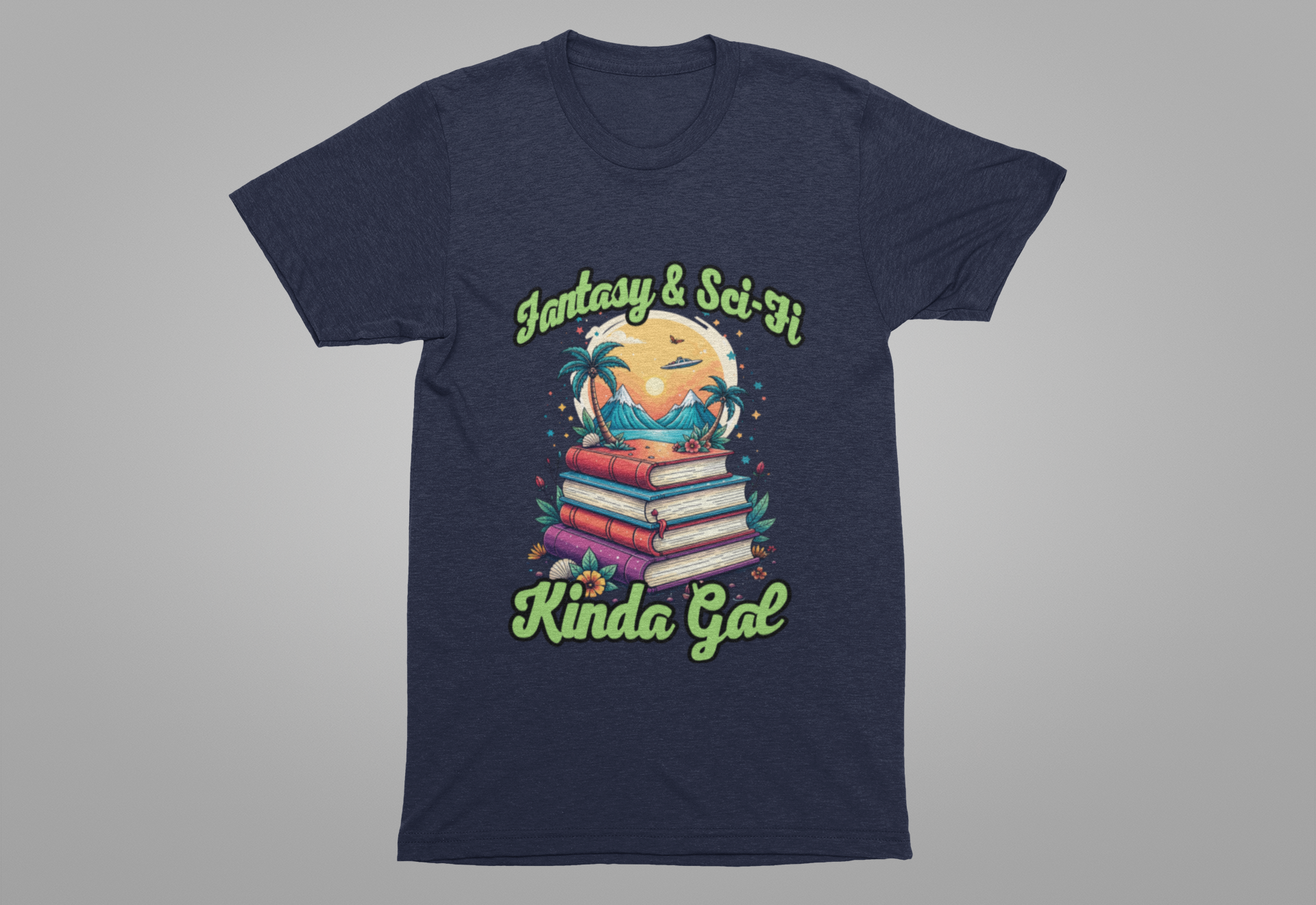 Celebrate your love for both fantasy and sci-fi genres with this enchanting tshirt featuring a stack of books surrounded by lush trees and colorful flowers. Set against a scenic background of palm trees, majestic mountains, and a distant UFO, this design merges nature’s magic with futuristic mystery. The playful text "Fantasy & Sci-Fi Kinda Gal" perfectly captures the spirit of the imaginative reader who embraces both worlds. Crafted from soft, comfortable fabric, this unique and artistic tshirt is ideal for book lovers, fantasy fans, sci-fi enthusiasts, and anyone who enjoys whimsical, creative apparel. Perfect for casual wear, gifting, or showing off your dual passion for fantastic tales and cosmic adventures.