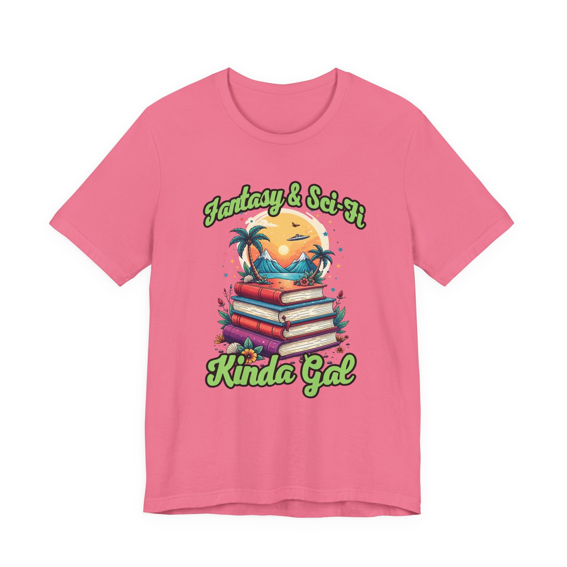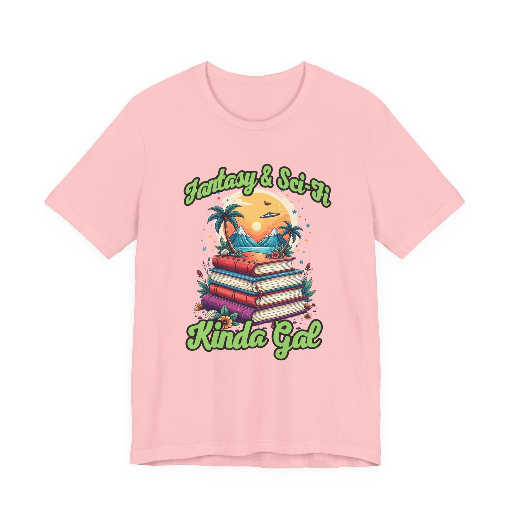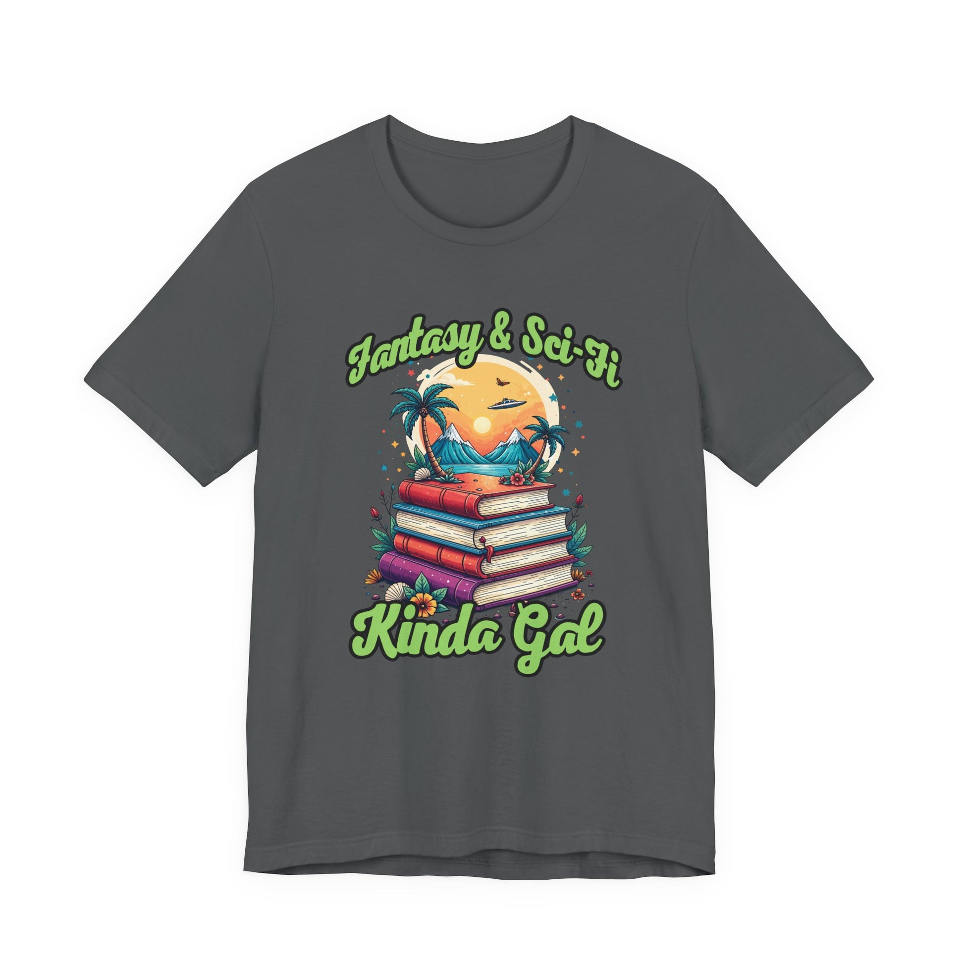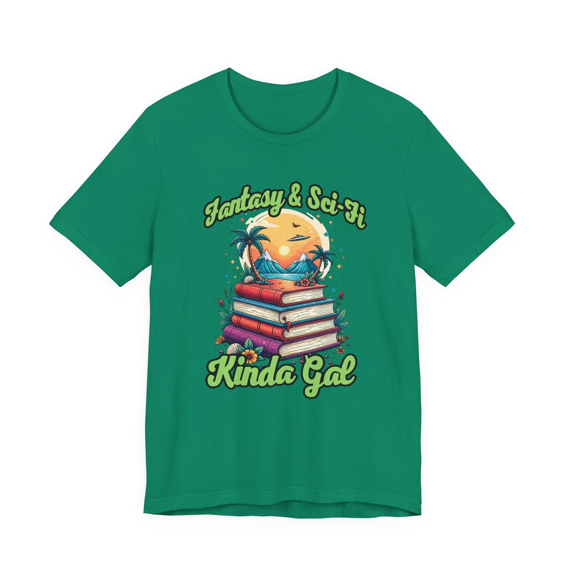 Celebrate your love for both fantasy and sci-fi genres with this enchanting tshirt featuring a stack of books surrounded by lush trees and colorful flowers. Set against a scenic background of palm trees, majestic mountains, and a distant UFO, this design merges nature’s magic with futuristic mystery. The playful text "Fantasy & Sci-Fi Kinda Gal" perfectly captures the spirit of the imaginative reader who embraces both worlds. Crafted from soft, comfortable fabric, this unique and artistic tshirt is ideal for book lovers, fantasy fans, sci-fi enthusiasts, and anyone who enjoys whimsical, creative apparel. Perfect for casual wear, gifting, or showing off your dual passion for fantastic tales and cosmic adventures.